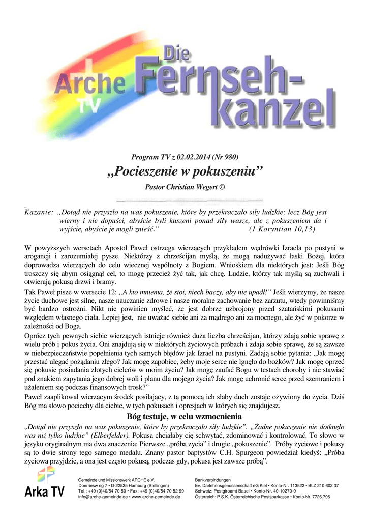 Program TV z 02.02.2014 (Nr 980) „Pocieszenie w pokuszeniu” Pastor Christian Wegert © Christian Kazanie: „Dotąd nie przyszło na was pokuszenie, które by przekraczało siły ludzkie; lecz Bóg jest wierny i nie dopuści, abyście byli kuszeni ponad siły wasze, ale z pokuszeniem da i wyjście, abyście je mogli znieść.” (1 Koryntian 10,13) W powyższych wersetach Apostoł Paweł ostrzega wierzących przykładem wędrówki Izraela po pustyni w arogancji i zarozumiałej pysze. Niektórzy z chrześcijan myślą, że mogą nadużywać łaski Bożej, która doprowadza wierzących do celu wiecznej wspólnoty z Bogiem. Wnioskiem dla niektórych jest: Jeśli Bóg troszczy się abym osiągnął cel, to mogę przecież żyć tak, jak chcę. Ludzie, którzy tak myślą są zuchwali i otwierają pokusą drzwi i bramy. Tak Paweł pisze w wersecie 12: „A kto mniema, że stoi, niech baczy, aby nie upadł!” Jeśli wierzymy, że nasze życie duchowe jest silne, nasze nauczanie zdrowe i nasze moralne zachowanie bez zarzutu, wtedy powinniśmy być bardzo ostrożni. Nikt nie powinien myśleć, że jest dobrze uzbrojony przed szatańskimi pokusami względem własnego ciała. Lepiej jest, nie uważać siebie ani za mądrego ani za mocnego, ale żyć w pokorze w zależności od Boga. Oprócz tych pewnych siebie wierzących istnieje również duża liczba chrześcijan, którzy zdają sobie sprawę z wielu prób i pokus życia. Oni znajdują się w niektórych życiowych próbach i zdaja sobie sprawę, że są zawsze w niebezpieczeństwie popełnienia tych samych błędów jak Izrael na pustyni. Zadają sobie pytania: „Jak mogę przestać ulegać pożądaniu złego? Jak mogę zapobiec, żeby moje serce nie lgnęło do bożków? Jak mogę oprzeć się pokusie posiadania złotych cielców w moim życiu? Jak mogę zaufać Bogu w testach choroby i nie stawiać pod znakiem zapytania jego dobrej woli i planu dla mojego życia? Jak mogę uchronić serce przed szemraniem i użaleniem się podczas finansowych trosk?” Paweł zaaplikował wierzącym środek posilający, z tą pomocą ich słaby duch zostaje ożywiony do życia. Dziś Bóg ma słowo pociechy dla ciebie, w tych pokusach i opresjach w których się znajdujesz. Bóg testuje, w celu wzmocnienia „Dotąd nie przyszło na was pokuszenie, które by przekraczało siły ludzkie”. „Żadne pokuszenie nie dotknęło was niż tylko ludzkie” (Elberfelder). Pokusa chciałaby cię schwytać, zdominować i kontrolować. To słowo w języku oryginalnym ma dwa znaczenia: Pierwsze „próba życia” i drugie „pokuszenie”. Próby życiowe i pokusy są to dwie strony tego samego medalu. Znany pastor baptystów C.H. Spurgeon powiedział kiedyś: „Próba życiowa przyjdzie, a ona jest często pokusą, podczas gdy, pokusa jest zawsze próbą”. Arka TV Gemeinde und Missionswerk ARCHE e.V. Doerriesw eg 7 • D-22525 Hamburg (Stellingen) Tel.: +49 (0)40/54 70 50 • Fax: +49 (0)40/54 70 52 99 [email protected] • www.arche-gemeinde.de Bankverbindungen Ev. Darlehensgenossenschaft eG Kiel • Konto-Nr. 113522 • BLZ 210 602 37 Schweiz: Postgiroamt Basel • Konto-Nr. 40-10270-9 Österreich: P.S.K. Österreichische Postsparkasse • Konto-Nr. 7726.796 Strona 2 -Program - TV nr 980/ „ Pocieszenie w pokuszeniu” Nasze życie jest pełne życiowych prób, i każdy niesie w sobie potencjał pokuszenia. Pewien mężczyzna dostał nową pracę w firmie. Był bardzo szczęśliwy. Pewnego wieczoru - nie był tam długo pracownikiem - wszyscy koledzy opuścili po pracy biuro. Odkrył, że ktoś zostawił na jego biurku dużą sumę pieniędzy. Natychmiast wziął pieniądze, umieścił je w swojej teczce i pomyślał: „Oddam te pieniądze”. Następnego dnia rano poszedł prosto do biura swojego szefa, położył pieniądze na stole i powiedział: „Ktoś zostawił te pieniądze na moim biurku. Nie wiem, kto to był i kto ich teraz szuka. Chciałem je oddać jak to tylko szybko jest możliwe”. Szef spojrzał mu w oczy i powiedział: „Ja zostawiłem te pieniądze. To był test. Pan go zdał.” Jeśli ten mężczyzna wróciłby do domu i po otwarciu torby pomyślałby: „Hhhmm, nikt nie zauważy, gdy zatrzymam pieniądze”, wtedy rozpoczęłaby się walka w jego sercu. Test stałby się pokusą. Jeśli okoliczności zewnętrzne do tego stopnia prześladują serce, że decyduje się przeciw prawdzie i sprawiedliwości, wtedy zewnętrzna próba stała się pokusą. Istnieje wiele takich prób w naszym życiu. Mogą to być trudności finansowe. Utraciłeś dochody, bo straciłeś pracę. Jak reagujesz? Możesz powiedzieć: Ograniczę wydatki, kupię jedynie to, co jest potrzebne, dołożę starań, aby zapłacić wszystkie rachunki, i zaufam Bogu, że On nas zaopatrzy”. Wtedy zdałeś próbę. Ale jeśli myślisz: „ Mogę trochę sfałszować mój podatek, zabiorę z firmowego automatu na kawę drobną gotówkę i opłacę niezapłacone rachunki”, wtedy okoliczności tak poruszą twoje serce, że ta próba staje się pokusą. Bóg dobrze nas sprawdza, ale nas nie kusi. Jakub pisze: „Niechaj nikt, gdy wystawiony jest na próbę, nie mówi: Przez Boga jestem kuszony, Bóg bowiem nie jest podatny na pokusy ani sam nikogo nie kusi”. Tak, ale co spowodowało wtedy pokusę we mnie? „Lecz każdy bywa kuszony przez własne pożądliwości, które go pociągają i nęcą” (Jakub 1, 1314). Bóg sprawdza nas, ale nasze własne pożądanie sprawia, że flirtujemy ze złem. Oczywiście jest tam też szatan, zwodziciel i kusiciel. Jezus został zaprowadzony przez ducha na pustynie, ale nie, aby być kuszonym przez ducha. Nie, to czynił ktoś inny. „…aby Go kusił diabeł” (Mateusz 4,1). Również podobnie było z Jobem. Ale dlaczego Bóg nas wtedy sprawdza? Jakub pisze: „Poczytajcie to sobie za najwyższą radość, bracia moi, gdy rozmaite próby przechodzicie (to samo słowo jak doświadczenie lub pokuszenie) . Wiedząc, że doświadczen