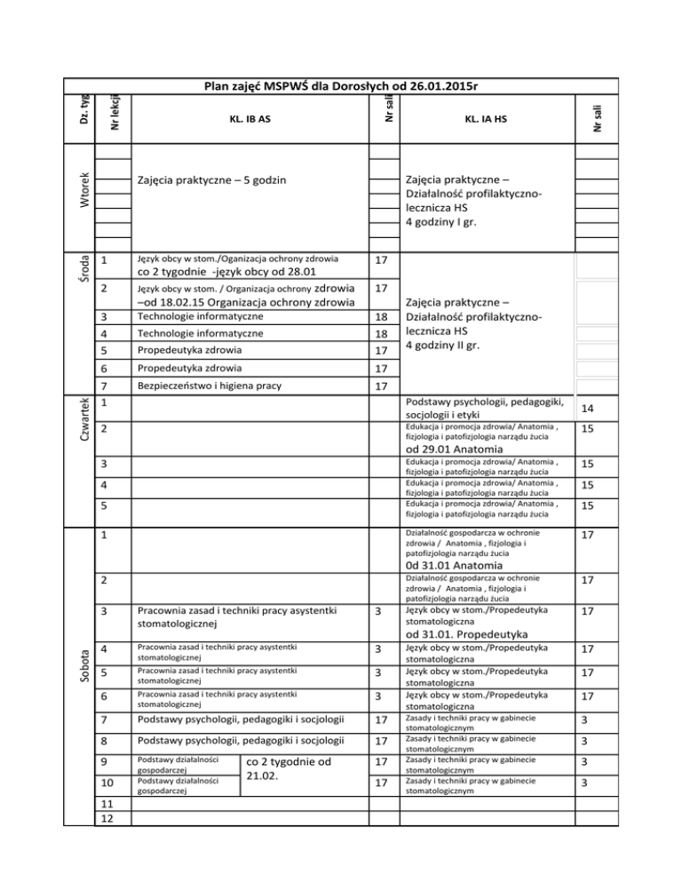 Czwartek Środa Wtorek KL. IB AS 2 Język obcy w stom./Oganizacja ochrony zdrowia co 2 tygodnie -język obcy od 28.01 Język obcy w stom. / Organizacja ochrony zdrowia –od 18.02.15 Organizacja ochrony zdrowia 17 17 3 4 5 Technologie informatyczne Propedeutyka zdrowia 18 18 17 6 Propedeutyka zdrowia 17 7 1 Bezpieczeństwo i higiena pracy 17 Technologie informatyczne KL. IA HS Zajęcia praktyczne – Działalność profilaktycznolecznicza HS 4 godziny I gr. Zajęcia praktyczne – 5 godzin 1 Nr sali Nr sali Dz. tyg Nr lekcji Plan zajęć MSPWŚ dla Dorosłych od 26.01.2015r 2 Zajęcia praktyczne – Działalność profilaktycznolecznicza HS 4 godziny II gr. Podstawy psychologii, pedagogiki, socjologii i etyki 14 Edukacja i promocja zdrowia/ Anatomia , fizjologia i patofizjologia narządu żucia 15 od 29.01 Anatomia 3 4 5 1 Edukacja i promocja zdrowia/ Anatomia , fizjologia i patofizjologia narządu żucia Edukacja i promocja zdrowia/ Anatomia , fizjologia i patofizjologia narządu żucia Edukacja i promocja zdrowia/ Anatomia , fizjologia i patofizjologia narządu żucia 15 Działalność gospodarcza w ochronie zdrowia / Anatomia , fizjologia i patofizjologia narządu żucia 17 15 15 0d 31.01 Anatomia Sobota 2 3 Pracownia zasad i techniki pracy asystentki stomatologicznej 3 4 Pracownia zasad i techniki pracy asystentki stomatologicznej 3 5 Pracownia zasad i techniki pracy asystentki stomatologicznej 3 6 Pracownia zasad i techniki pracy asystentki stomatologicznej 3 7 Podstawy psychologii, pedagogiki i socjologii 17 8 Podstawy psychologii, pedagogiki i socjologii 17 9 Podstawy działalności gospodarczej Podstawy działalności gospodarczej 17 10 11 12 co 2 tygodnie od 21.02. Działalność gospodarcza w ochronie zdrowia / Anatomia , fizjologia i patofizjologia narządu żucia 17 Język obcy w stom./Propedeutyka stomatologiczna 17 od 31.01. Propedeutyka 17 Język obcy w stom./Propedeutyka stomatologiczna Język obcy w stom./Propedeutyka stomatologiczna Język obcy w stom./Propedeutyka stomatologiczna 17 Zasady i techniki pracy w gabinecie stomatologicznym Zasady i techniki pracy w gabinecie stomatologicznym Zasady i techniki pracy w gabinecie stomatologicznym Zasady i techniki pracy w gabinecie stomatologicznym 3 17 17 3 3 3