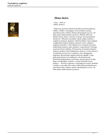 Tytuł główny nagłówka podtytuł nagłówka Złota skóra Cena: 18.84 zł (-37%) 29.90 zł Najnowsza powieść autorki bestsellerowej Szmaragdowej Tablicy. Wejdź w intrygujący świat modelek i poznaj zjawiskową Ines, kobietę, której ciała pragnęli wszyscy, ale tylko jeden zdołał obnażyć jej duszę. Wiedeń 1904 rok. Społecznością stolicy cesarstwa wstrząsa seria bestialskich morderstw. Ofiarami są modelki, młode, piękne kobiety o wątpliwej reputacji, skupione wokół kochanki i muzy jednego z najbardziej znanych malarzy tamtych czasów: pięknej i enigmatycznej Inés. I choć Montero nie wymienia nazwiska konkretnego malarza, jego charakter i usposobienie wskazują na postać Gustava Klimta. Wyznaczony do przeprowadzenia śledztwa detektyw Karl Sehlackman wkracza w świat luksusu i wiedeńskiej secesji oraz w najniższe sfery upadającego imperium. Rozwiązanie najmroczniejszej zagadki w jego policyjnej karierze jest trudniejsze, niż przypuszczał. Głównymi podejrzanymi są bowiem: jego przyjaciel, książę Hugo von Ebenthal, i kobieta, w której zakochał się bez pamięci… Powieść osadzona w intrygującym świecie modelek i malarzy z początku XX wieku, której główną bohaterką jest zjawiskowa Ines, kobieta, której ciała pragnęli wszyscy, ale tylko jeden zdołał obnażyć jej duszę. 1/1 Powered by TCPDF (www.tcpdf.org)