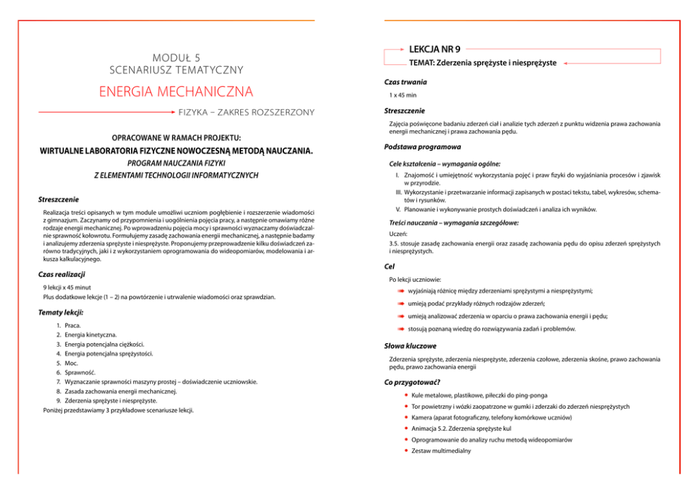 LEKCJA NR 9 Moduł 5 SCENARIUSZ TEMAT YCZNY Energia mechaniczna fizyka – zakres rozszerzony OPRACOWANE W RAMACH PROJEKTU: WIRTUALNE LABORATORIA FIZYCZNE NOWOCZESNĄ METODĄ NAUCZANIA. PROGRAM NAUCZANIA FIZYKI Z ELEMENTAMI TECHNOLOGII INFORMATYCZNYCH TEMAT: Zderzenia sprężyste i niesprężyste Czas trwania 1 x 45 min Streszczenie Zajęcia poświęcone badaniu zderzeń ciał i analizie tych zderzeń z punktu widzenia prawa zachowania energii mechanicznej i prawa zachowania pędu. Podstawa programowa Cele kształcenia – wymagania ogólne: I. Znajomość i umiejętność wykorzystania pojęć i praw fizyki do wyjaśniania procesów i zjawisk w przyrodzie. III. Wykorzystanie i przetwarzanie informacji zapisanych w postaci tekstu, tabel, wykresów, schematów i rysunków. V. Planowanie i wykonywanie prostych doświadczeń i analiza ich wyników. Streszczenie Realizacja treści opisanych w tym module umożliwi uczniom pogłębienie i rozszerzenie wiadomości z gimnazjum. Zaczynamy od przypomnienia i uogólnienia pojęcia pracy, a następnie omawiamy różne rodzaje energii mechanicznej. Po wprowadzeniu pojęcia mocy i sprawności wyznaczamy doświadczalnie sprawność kołowrotu. Formułujemy zasadę zachowania energii mechanicznej, a następnie badamy i analizujemy zderzenia sprężyste i niesprężyste. Proponujemy przeprowadzenie kilku doświadczeń zarówno tradycyjnych, jaki i z wykorzystaniem oprogramowania do wideopomiarów, modelowania i arkusza kalkulacyjnego. Czas realizacji 9 lekcji x 45 minut Plus dodatkowe lekcje (1 – 2) na powtórzenie i utrwalenie wiadomości oraz sprawdzian. Tematy lekcji: 1.Praca. 2. Energia kinetyczna. 3. Energia potencjalna ciężkości. 4. Energia potencjalna sprężystości. 5.Moc. 6.Sprawność. 7. Wyznaczanie sprawności maszyny prostej – doświadczenie uczniowskie. 8. Zasada zachowania energii mechanicznej. 9. Zderzenia sprężyste i niesprężyste. Poniżej przedstawiamy 3 przykładowe scenariusze lekcji. Treści nauczania – wymagania szczegółowe: Uczeń: 3.5. stosuje zasadę zachowania energii oraz zasadę zachowania pędu do opisu zderzeń sprężystych i niesprężystych. Cel Po lekcji uczniowie: ¯¯ wyjaśniają różnicę między zderzeniami sprężystymi a niesprężystymi; ¯¯ umieją podać przykłady różnych rodzajów zderzeń; ¯¯ umieją analizować zderzenia w oparciu o prawa zachowania energii i pędu; ¯¯ stosują poznaną wiedzę do rozwiązywania zadań i problemów. Słowa kluczowe Zderzenia sprężyste, zderzenia niesprężyste, zderzenia czołowe, zderzenia skośne, prawo zachowania pędu, prawo zachowania energii Co przygotować? yy Kule metalowe, plastikowe, piłeczki do ping-ponga yy Tor powietrzny i wózki zaopatrzone w gumki i zderzaki do zderzeń niesprężystych yy Kamera (aparat fotograficzny, telefony komórkowe uczniów) yy Animacja 5.2. Zderzenia sprężyste kul yy Oprogramowanie do analizy ruchu metodą wideopomiarów yy Zestaw multimedialny Przebieg zajęć Lp. Tematyka Czas realizacji 1. Przypomnienie prawa zachowania pędu i prawa zachowania energii mechanicznej. 5 min. 2. Pokaz: zderzenia wózków na torze powietrznym (niesprężyste i sprężyste). Analiza zderzeń. 10 min. 3. Omówienie różnicy między zderzeniem sprężystym i niesprężystym, przykłady. Animacja 5.2. Zderzenia sprężyste kul. 10 min. 4. Doświadczenie uczniowskie (w parach) – badanie zderzeń kul. Filmowanie jednego przypadku zderzenia przez każdą grupę. 10 min 5. Zadania testowe. Podsumowanie zajęć. Praca domowa – analiza ruchu kul na podstawie wykonanego filmu (metodą wideopomiarów). 10 min. Sprawdzenie wiedzy ¯¯ Zadania testowe z pliku „Moduł 5_Energia_mechaniczna_test” ¯¯ Zadania: 5, 13, 14 Ocenianie Wiadomości i umiejętności z poprzednich zajęć, praca domowa Praca na lekcji ¯¯ aktywność podczas zajęć, ¯¯ wnioski i propozycje rozwiązań problemów. Dostępne pliki ¯¯ Animacja 5.2. Zderzenia sprężyste kul ¯¯ Moduł 5_Energia_mechaniczna_test
