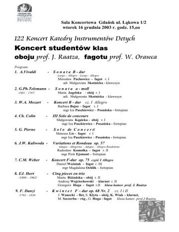 Sala Koncertowa Gdańsk ul. Łąkowa 1/2 wtorek 16 grudnia 2003 r. godz. 15,oo 122 Koncert Katedry Instrumentów Detych Koncert studentów klas oboju prof. J. Raatza, fagotu prof. W. Orawca Program: 1. A.Vivaldi - S o n a t a B - dur Largo – Allegro – Largo - Allegro Mirosław Pachowicz - fagot r. I adi Małgorzata Skotnicka - klawesyn 2. G.Ph.Telemann - Marta Jagelska - obój r. I adi. Małgorzata Skotnicka - klawesyn /1681 – 1767/ 3. W.A. Mozart S o n a t a a - moll - Koncert B - dur cz. I Allegro Barbara Bajor – fagot r. I mgr Iza Paszkiewicz – Posańska - fortepian 4. Ch. Colin - III Solo de concours Małgorzata Kępicka - obój r. I mgr Iza Paszkiewicz – Posańska - fortepian 5. G. Pierne - S o l o de C o n c e r tI Mateusz Lis - fagot r. I mgr Iza Paszkiewicz – Posańska - fortepian 6. J.W. Kaliwoda - Variations et Rondeau op. 57 Adagio - Allegretto – Adagio – Allegro Rondoletto Radosław Komolka - fagot r. II mgr Piotr Ejsmont – fortepian 7. C.M. Weber - Koncert F-dur op. 75 część I Allegro Daniel Woźniak - fagot r. III mgr Magdalena Ochlik – fortepian 8. EJ. Ibert - Marta Różańska – obój r. II Andrzej Wojciechowski - klarnet r. II Grzegorz Hoga - fagot r.II klasa kamer. prof. J. Raatza /1890 – 1962/ 9. F. Danzi /1763 – 1826/ Cinq pieces en trio - K w i n t e t F – dur op. 68 Nr. 2 cz. I i II J. Wanecki - flet, S. Klyta – obój, K. Wiak – klarnet, M. Szczerba – róg , G. Hoga - fagot klasa kamer. prof.J.Raatza