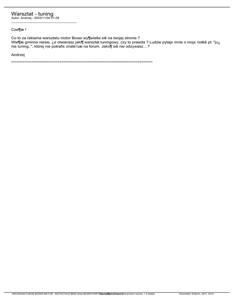 Warsztat - tuning Autor: Andrzej - 2003/11/04 01:29 _____________________________________ Cze¶æ ! Co to za reklama warsztatu motor Boxer wy¶wietla siê na twojej stronie ? Wie¶æ gminna niesie, ¿e otwierasz jaki¶ warsztat tuningowy, czy to prawda ? Ludzie pytaj± mnie o moj± notkê pt: "ju¿ nie tuning..", której nie potrafi± znale¼æ na forum. Jako¶ siê nie odzywasz... ? Andrzej ============================================================================ ARCHIWUM FoRUM BOXER-MOTOR - MOTOCYKLE BMW sklep BOXER-PARTS.eu MamboBoard czê¶ci i akcesoria Forum Component version: 1.4 Stable Generated: 8 March, 2017, 00:21