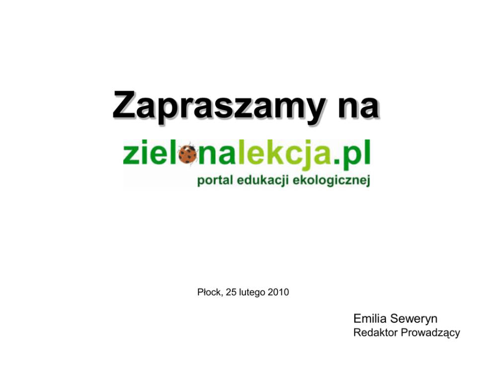 Zapraszamy na Płock, 25 lutego 2010 Emilia Seweryn Redaktor Prowadzący Powstanie nowa inicjatywa spółki Abrys, uruchomiony w maju 2009 roku, hasło przewodnie: edukacja ekologiczna, 2 Odbiorca portalu uniwersalizm treści, bogactwo tematów, prostota języka Portal kierowany jest głównie do: dzieci i młodzieży, nauczycieli i edukatorów, każdego zainteresowanego tematyką ekologii, przedsiębiorstw zainteresowanych edukacją ekologiczną. 3 Misja podnoszenie świadomości ekologicznej dzieci, młodzieży oraz osób dorosłych, a także zachęcanie ich do aktywnej postawy prośrodowiskowej Sposoby realizacji: informowanie o bieżących wydarzeniach ekologicznych, dostarczanie narzędzi do edukacji ekologicznej w szkole i poza nią, inspirowanie do działań ekologicznych, prowadzenie konkursów związanych z ekologią. 4 Budowa portalu aktualności, materiały edukacyjne, ścieżki dydaktyczne, ośrodki edukacyjne, przerwa na bloga, forum, multimedia, konkursy, gdzie się kształcić, gry, kalendarium, opublikuj swoje materiały. książki polecane. 5 Tematyka Tematy poruszane na portalu www.ZielonaLekcja.pl: edukacja odpadowa, edukacja klimatyczna, edukacja wodna, edukacja przyrodnicza, edukacja energetyczna. 6 Realizacja edukacji energetycznej Edukacja energetyczna jest realizowana poprzez: informowanie o wydarzeniach związanych z oszczędnością energii, promocja odnawialnych źródeł energii, rozpowszechnianie wydarzeń i świąt związanych z energią, publikację scenariuszy lekcyjnych propagujących efektywność energetyczną, multimedia związane z energią, obejmowanie patronatu nad wydarzeniami związanymi z energią. 7 Przyszłość Zielonej Lekcji Plany rozwojowe: nowe działy, poszerzanie baz danych, kolejne konkursy oraz akcje z instytucjami partnerskimi, włączanie do współpracy autorytetów z dziedziny edukacji ekologicznej, dostarczenie narzędzi do samodzielnego poznawania tajników ekologii. 8 www.ZielonaLekcja.pl 9 Zakończenie Jeśli myślisz rok naprzód, sadź ryż Jeśli myślisz 10 lat naprzód, sadź drzewa Lecz jeśli myślisz 100 lat naprzód, ucz ludzi! [przysłowie chińskie] 10 Zakończenie DZIĘKUJĘ ZA UWAGĘ i zapraszam na Emilia Seweryn 11