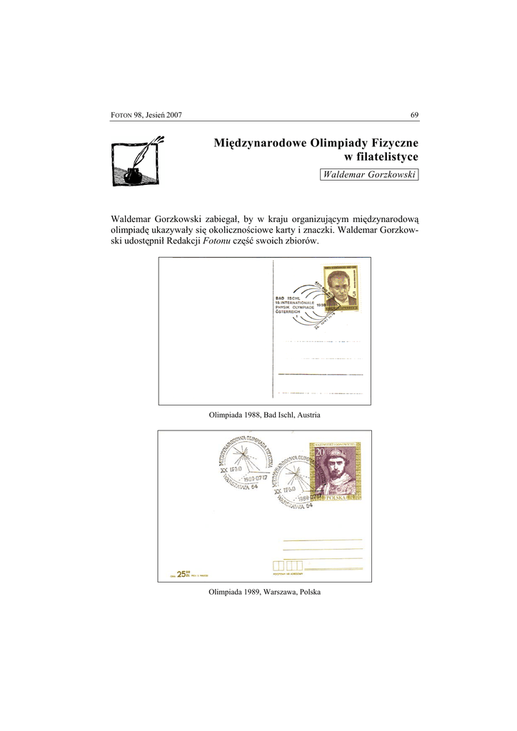 FOTON 98, Jesień 2007 69 Międzynarodowe Olimpiady Fizyczne w filatelistyce Waldemar Gorzkowski Waldemar Gorzkowski zabiegał, by w kraju organizującym międzynarodową olimpiadę ukazywały się okolicznościowe karty i znaczki. Waldemar Gorzkowski udostępnił Redakcji Fotonu część swoich zbiorów. Olimpiada 1988, Bad Ischl, Austria Olimpiada 1989, Warszawa, Polska 70 FOTON 98, Jesień 2007 Olimpiada 1994, Pekin, Chiny Olimpiada 2002, Karawaci, Indonezja
