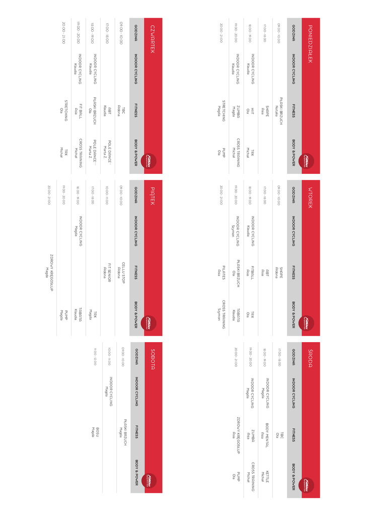 PONIEDZIAŁEK INDOOR CYCLING FITNESS BODY & POWER WTOREK GODZINA INDOOR CYCLING FITNESS BODY & POWER ŚRODA GODZINA 17.00 - 18.00 GODZINA SHAPE Aldona 19.00 - 20.00 09.00 - 10.00 TRX Ola PŁASKI BRZUCH Natalia FITBALL Asia 09.00 - 10.00 INDOOR CYCLING Klaudia 18.00 - 19.00 18.00 - 19.00 ABT Asia TRX Michał 20.00 - 21.00 17.00 - 18.00 HIIT Ola TABATA Klaudia SHAPE Asia INDOOR CYCLING Klaudia PŁASKI BRZUCH Ola 17.00 - 18.00 18.00 - 19.00 INDOOR CYCLING Szymon CROSS TRAINING Szymon 19.00 - 20.00 PILATES Asia CROSS TRAINING Michał 20.00 - 21.00 ZUMBA Magda PUMP Ola INDOOR CYCLING Klaudia STRETCHING Magda PIĄTEK BODY & POWER GODZINA 09.00 - 10.00 FITNESS SOBOTA 19.00 - 20.00 20.00 - 21.00 CZWARTEK INDOOR CYCLING CELLU STOP Aldona 10.00 - 11.00 GODZINA 09.00 - 10.00 FIT SENIOR Aldona BODY & POWER 10.00 - 11.00 FITNESS TBC Aldona POLE DANCE** Marta Z. 17.00 - 18.00 INDOOR CYCLING 09.00 - 10.00 ABT Klaudia POLE DANCE*** Marta Z. GODZINA 17.00 - 18.00 PŁASKI BRZUCH Ola 11.00 - 12.00 INDOOR CYCLING Klaudia TRX Magda 18.00 - 19.00 PUMP Magda TABATA Klaudia 18.00 - 19.00 INDOOR CYCLING Magda CROSS TRAINING Michał 19.00 - 20.00 FIT BALL Asia TRX Michał INDOOR CYCLING Klaudia STRETCHING Ola ZDROWY KRĘGOSŁUP Magda 19.00 - 20.00 20.00 - 21.00 20.00 - 21.00 FITNESS KETTLE Michał BODY & POWER BODY MENTAL Asia CROSS TRAINING* Michał INDOOR CYCLING INDOOR CYCLING Magda ZUMBA Asia TBC Ola INDOOR CYCLING Magda BODY & POWER PUMP Ola PŁASKI BRZUCH Magda FITNESS ZDROWY KRĘGOSŁUP Asia INDOOR CYCLING INDOOR CYCLING Magda BOSU Magda ZAJĘCIA ZORGANIZOWANE NAZWA OPIS ZAJĘĆ INDOOR CYCLING Zajęcia odbywające się na specjalnych rowerach stacjonarnych przy akompaniamencie muzyki. Oferta Aquapark Fitness jest wyjątkowa, ponieważ w trakcie zajęć z projektora wyświetlane są filmy, które sprawią, że ćwiczący poczują się jak na wycieczce rowerowej . W trakcie zajęć system Suunto monitoruje parametry pracy serca. ABT Nazwa to skrót angielskich słów oznaczających odpowiednio: brzuch (abdominal), pośladki (buttocks) oraz uda (thigs). To forma aerobiku, która ma na celu wzmocnienie i ujędrnienie dolnych partii ciała. Regularne ćwiczenia zapewnią zgrabną sylwetkę, jędrne uda i pośladki, płaski brzuch oraz przyśpieszenie spalania tkanki tłuszczowej. Świetne dla każdej kobiety, która marzy o sylwetce idealnej! CROSS TRAINING Ogólnorozwojowy program, który kształtuje formę i siłę organizmu. Głównym założeniem treningu jest osiągnięcie sprawności w dziesięciu różnych obszarach fizycznych. Należą do nich: wydolność krążeniowo-oddechowa, wytrzymałość, siła, gibkość, moc, szybkość, zwinność, równowaga, koordynacja i dokładność. TRX TRX to trening wykorzystujący pracę z ciężarem własnego ciała do wzmacniania mięśni. Opiera się o zestaw ćwiczeń funkcjonalnych, których celem jest poprawa sprawności osoby ćwiczącej. Regularne sesje treningowe zwiększają siłę, koordynację i gibkość. TRX to doskonałe uzupełnienie klasycznego treningu siłowego i okazja do sprawdzenia poziomu własnej sprawności fizycznej. HIIT HIIT (High Intensity Interval Training) trening interwałowy o wysokiej intensywności – forma strategii treningu fizycznego polegająca na przeplataniu krótkich okresów bardzo intensywnego wysiłku krótkimi okresami umiarkowanego wysiłku. Ćwiczenia same w sobie są bardzo podstawowe stosowane podczas zwykłych treningów. STEP Zajęcia, podczas których wykorzystywana jest specjalna platforma, tzw. step. Trening polega na stopniowej nauce choreografii, która poprawia sprawność, samopoczucie oraz koordynację ruchową. Celem ćwiczeń jest stymulowanie i usprawnianie układu sercowo-naczyniowego oraz wymodelowanie ud, bioder i pośladków. PUMP Trening dla kobiet i mężczyzn przy użyciu lekkich sztang i obciążeń, kształtujący całe ciało, skutecznie rozwijający wytrzymałość mięśniową, a pośrednio korzystnie wpływający na poprawę metabolizmu. POLE DANCE Zajęcia taneczne na rurze. Wzmacniają i rozwijają ogólną sprawność organizmu, poprawiają koordynację i płynność ruchów. Przy okazji zaś to fantastyczna zabawa. STRETCHING Metoda napinania, rozluźniania i rozciągania mięśni. Są to zajęcia, których celem zajęć jest rozciąganie całego ciała, rozluźnieniei uelastycznianie wszystkich mięśni oraz zwiększenie ruchomości. Stretching jest niezbędnym dodatkiem do każdego intensywnego treningu. SHAPE Zajęcia przeznaczone są dla osób o różnym stopniu zaawansowania. Niewielka intensywność i nieskomplikowany pod względem koordynacyjnym zestaw ćwiczeń, pozwalają uczestniczyć w nich wszystkim, bez względu na wiek, płeć i wydolność fizyczną. Zalecane dla osób początkujących. ZUMBA Nowoczesny system fitness, który łączy taniec z aerobikiem. To energetyczna fuzja zainspirowana rytmami latynoskimi połączonymi z tańcami międzynarodowymi (merengue, salsa, cumbia, reggaeton, flamenco, samba, taniec brzucha, cha-cha, rumba, twist). Daje spektakularne efekty - kształtuje sylwetkę, poprawia kondycję, a także dodaje energii i optymizmu. DANCE Zajęcia stanowią połączenie tańca i fitnessu. Skierowane są do osób, które nienawidzą rutyny i kochających zmiany. Fit Dance to wybuchowa mieszanka stylów (latino, hip hop, disco, rock and roll, aeorobic) w różnorodnych choreografiach, przy dźwiękach energetycznej muzyce. Poprzez intensywny taniec następuję spalanie tkanki tłuszczowej, wzmocnienie mięśni, poprawa wydolności. TBC (Total Body Condition) jest to trening ogólnorozwojowy, dla każdego, bez względu na wiek. Charakterystyczne dla tych zajęć jest symetryczne wzmacnianie całego ciała, przy użyciu hantli, taśm, piłeczek itp. Celem treningu jest lepsza przemiana materii, zapobieganie osteoporozie, kształtowanie sylwetki, spalanie większej ilości kcal w czynnościach dnia codziennego. KETTLE Trening wytrzymałościowo siłowy dla osó