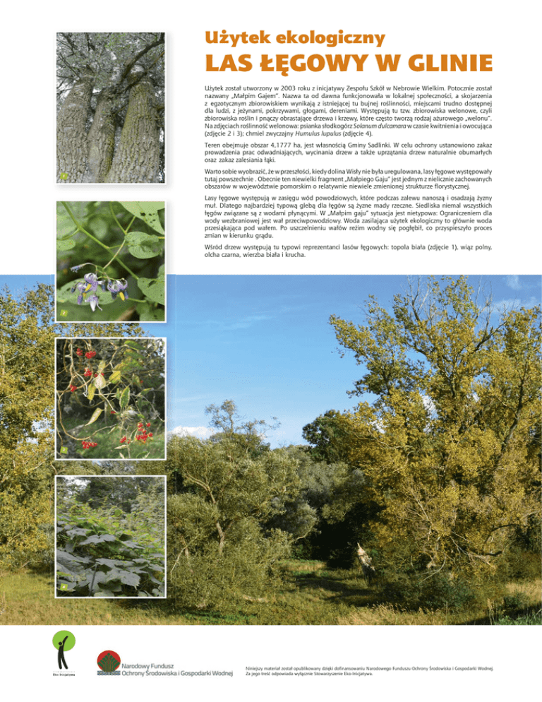 Użytek ekologiczny LAS ŁĘGOWY W GLINIE Użytek został utworzony w 2003 roku z inicjatywy Zespołu Szkół w Nebrowie Wielkim. Potocznie został nazwany „Małpim Gajem”. Nazwa ta od dawna funkcjonowała w lokalnej społeczności, a skojarzenia z egzotycznym zbiorowiskiem wynikają z istniejącej tu bujnej roślinności, miejscami trudno dostępnej dla ludzi, z jeżynami, pokrzywami, głogami, dereniami. Występują tu tzw. zbiorowiska welonowe, czyli zbiorowiska roślin i pnączy obrastające drzewa i krzewy, które często tworzą rodzaj ażurowego „welonu”. Na zdjęciach roślinność welonowa: psianka słodkogórz Solanum dulcamara w czasie kwitnienia i owocująca (zdjęcie 2 i 3); chmiel zwyczajny Humulus lupulus (zdjęcie 4). Teren obejmuje obszar 4,1777 ha, jest własnością Gminy Sadlinki. W celu ochrony ustanowiono zakaz prowadzenia prac odwadniających, wycinania drzew a także uprzątania drzew naturalnie obumarłych oraz zakaz zalesiania łąki. 1 Warto sobie wyobrazić, że w przeszłości, kiedy dolina Wisły nie była uregulowana, lasy łęgowe występowały tutaj powszechnie . Obecnie ten niewielki fragment „Małpiego Gaju” jest jednym z nielicznie zachowanych obszarów w województwie pomorskim o relatywnie niewiele zmienionej strukturze florystycznej. Lasy łęgowe występują w zasięgu wód powodziowych, które podczas zalewu nanoszą i osadzają żyzny muł. Dlatego najbardziej typową glebą dla łęgów są żyzne mady rzeczne. Siedliska niemal wszystkich łęgów związane są z wodami płynącymi. W „Małpim gaju” sytuacja jest nietypowa: Ograniczeniem dla wody wezbraniowej jest wał przeciwpowodziowy. Woda zasilająca użytek ekologiczny to głównie woda przesiąkająca pod wałem. Po uszczelnieniu wałów reżim wodny się pogłębił, co przyspieszyło proces zmian w kierunku grądu. Wśród drzew występują tu typowi reprezentanci lasów łęgowych: topola biała (zdjęcie 1), wiąz polny, olcha czarna, wierzba biała i krucha. 2 3 4 Niniejszy materiał został opublikowany dzięki dofinansowaniu Narodowego Funduszu Ochrony Środowiska i Gospodarki Wodnej. Za jego treść odpowiada wyłącznie Stowarzyszenie Eko-Inicjatywa. Użytek ekologiczny LAS ŁĘGOWY W GLINIE 1 Poza lasem łęgowym Ficario Ulmetum, którego zachowanie jest głównym celem ochrony, na terenie użytku występują fragmenty zbiorowisk okrajkowych i welonowych, fragment zbiorowiska łąkowego z związku Calithion, fragmenty zbiorowisk szuwarowych. Mozaika różnych siedlisk i ekosystemów tworzy dynamiczny układ ekologiczny, w którym można zaobserwować różnorodność gatunków, charakterystycznych nie tylko dla lasów łęgowych. Łąka i okrajek lasu, szczególnie w letnie słoneczne dni, są doskonałym miejscem do obserwacji owadów, np. motyli, jak na zdjęciu 1 (modraszek ikar Polyommatus icarus) i zdjęciu 2 (kraśnik pięciolamek Zygaena trifolii). Jesienią uwagę zwracają owoce krzewów, w tym trzmieliny pospolitej Euonymus europaeus (zdjęcie 3). Przez cały rok obserwować można skrzyp zimowy Equisetum hyemale występujący w centralnej części użytku (zdjęcie 4). Szczególną uwagę zwracją majestatyczne topole białe Populus alba. Na korze niektórych z nich wyróżnia się złociszek jaskrawy Chrysotrix candelaris, porost objęty ochroną ścisłą znajduje się także na Czerwonej liście roślin i grzybów w Polsce (zdjęcie 5). Naturalnie obumierające drzewa ustępują miejsca nowym (zdjęcie 7 – młode samosiewy topoli białej). Warto przyjrzeć się bogactwu życia martwych drzew, w tym grzybom wielkoowocnikowym. 2 Trudno dostępny dla ludzi teren jest świetnym miejscem bytowania dla zwierząt kręgowych, w tym ssaków, m.in.: borsuka, ryjówek, rzęsorka rzeczka, karczownika ziemnowodnego. Licznie reprezentowana jest awifauna, zarówno przez ptaki lęgowe na tym terenie, czy też wędrujące podczas wiosennych i jesiennych przelotów doliną Wisły. 7 3 4 5 6 Niniejszy materiał został opublikowany dzięki dofinansowaniu Narodowego Funduszu Ochrony Środowiska i Gospodarki Wodnej. Za jego treść odpowiada wyłącznie Stowarzyszenie Eko-Inicjatywa.