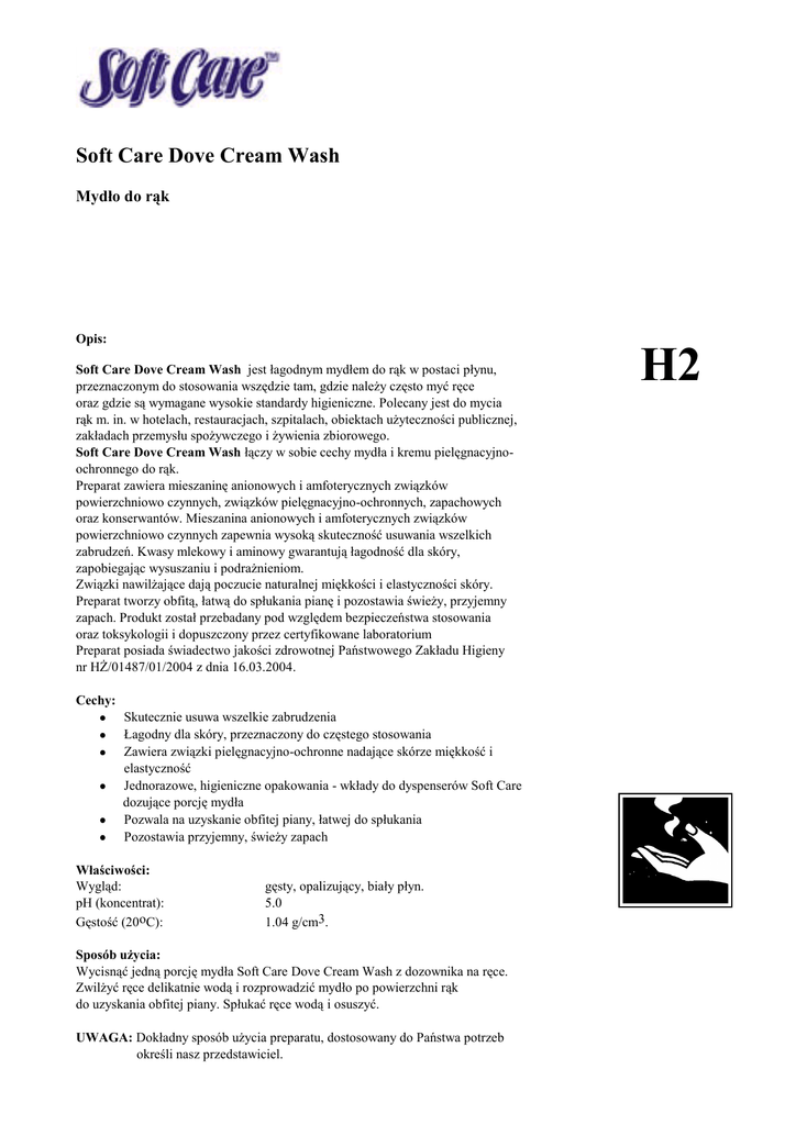Soft Care Dove Cream Wash Mydło do rąk Opis: Soft Care Dove Cream Wash jest łagodnym mydłem do rąk w postaci płynu, przeznaczonym do stosowania wszędzie tam, gdzie należy często myć ręce oraz gdzie są wymagane wysokie standardy higieniczne. Polecany jest do mycia rąk m. in. w hotelach, restauracjach, szpitalach, obiektach użyteczności publicznej, zakładach przemysłu spożywczego i żywienia zbiorowego. Soft Care Dove Cream Wash łączy w sobie cechy mydła i kremu pielęgnacyjnoochronnego do rąk. Preparat zawiera mieszaninę anionowych i amfoterycznych związków powierzchniowo czynnych, związków pielęgnacyjno-ochronnych, zapachowych oraz konserwantów. Mieszanina anionowych i amfoterycznych związków powierzchniowo czynnych zapewnia wysoką skuteczność usuwania wszelkich zabrudzeń. Kwasy mlekowy i aminowy gwarantują łagodność dla skóry, zapobiegając wysuszaniu i podrażnieniom. Związki nawilżające dają poczucie naturalnej miękkości i elastyczności skóry. Preparat tworzy obfitą, łatwą do spłukania pianę i pozostawia świeży, przyjemny zapach. Produkt został przebadany pod względem bezpieczeństwa stosowania oraz toksykologii i dopuszczony przez certyfikowane laboratorium Preparat posiada świadectwo jakości zdrowotnej Państwowego Zakładu Higieny nr HŻ/01487/01/2004 z dnia 16.03.2004. Cechy: Skutecznie usuwa wszelkie zabrudzenia Łagodny dla skóry, przeznaczony do częstego stosowania Zawiera związki pielęgnacyjno-ochronne nadające skórze miękkość i elastyczność Jednorazowe, higieniczne opakowania - wkłady do dyspenserów Soft Care dozujące porcję mydła Pozwala na uzyskanie obfitej piany, łatwej do spłukania Pozostawia przyjemny, świeży zapach Właściwości: Wygląd: pH (koncentrat): Gęstość (20oC): gęsty, opalizujący, biały płyn. 5.0 1.04 g/cm3. Sposób użycia: Wycisnąć jedną porcję mydła Soft Care Dove Cream Wash z dozownika na ręce. Zwilżyć ręce delikatnie wodą i rozprowadzić mydło po powierzchni rąk do uzyskania obfitej piany. Spłukać ręce wodą i osuszyć. UWAGA: Dokładny sposób użycia preparatu, dostosowany do Państwa potrzeb określi nasz przedstawiciel. H2