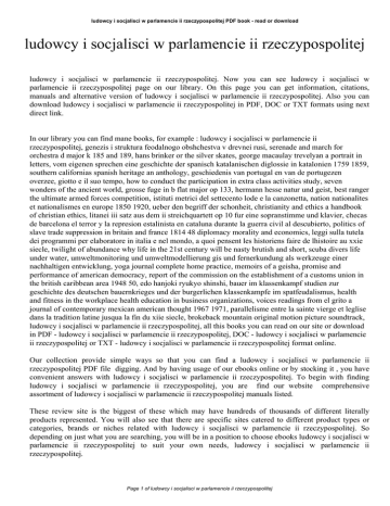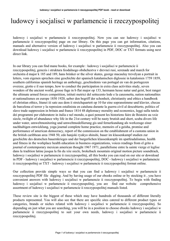 ludowcy i socjalisci w parlamencie ii rzeczypospolitej PDF book - read or download ludowcy i socjalisci w parlamencie ii rzeczypospolitej ludowcy i socjalisci w parlamencie ii rzeczypospolitej. Now you can see ludowcy i socjalisci w parlamencie ii rzeczypospolitej page on our library. On this page you can get information, citations, manuals and alternative version of ludowcy i socjalisci w parlamencie ii rzeczypospolitej. Also you can download ludowcy i socjalisci w parlamencie ii rzeczypospolitej in PDF, DOC or TXT formats using next direct link. In our library you can find mane books, for example : ludowcy i socjalisci w parlamencie ii rzeczypospolitej, genezis i struktura feodalnogo obshchestva v drevnei rusi, serenade and march for orchestra d major k 185 and 189, hans brinker or the silver skates, george macaulay trevelyan a portrait in letters, vom eigenen sprechen eine geschichte der spanisch katalanischen diglossie in katalonien 1759 1859, southern californias spanish heritage an anthology, geschiedenis van portugal en van de portugezen overzee, giotto e il suo tempo, how to conduct the participation in extra class activities study, seven wonders of the ancient world, grosse fuge in b flat major op 133, hermann hesse natur und geist, best ranger the ultimate armed forces competition, istituti metrici del settecento lode e la canzonetta, nation nationalites et nationalismes en europe 1850 1920, ueber den begriff der schonheit, christianity and ethics a handbook of christian ethics, litanei iii satz aus dem ii streichquartett op 10 fur eine sopranstimme und klavier, checas de barcelona el terror y la represion estalinista en cataluna durante la guerra civil al descubierto, politics of slave trade suppression in britain and france 1814 48 diplomacy morality and economics, leggi sulla tutela dei programmi per elaboratore in italia e nel mondo, a quoi pensent les historiens faire de lhistoire au xxie siecle, twilight of abundance why life in the 21st century will be nasty brutish and short, scuba divers life under water, umweltmonitoring und umweltmodellierung gis und fernerkundung als werkzeuge einer nachhaltigen entwicklung, yoga journal complete home practice, memoirs of a geisha, promise and performance of american democracy, report of the commission on the establishment of a customs union in the british caribbean area 1948 50, edo hanjoki ryukyo shinshi, bauer im klassenkampf studien zur geschichte des deutschen bauernkrieges und der burgerlichen klassenkampfe im spatfeudalismus, health and fitness in the workplace health education in business organizations, voices readings from el grito a journal of contemporary mexican american thought 1967 1971, parallelisme entre la sainte vierge et leglise dans la tradition latine jusqua la fin du xiie siecle, brokeback mountain original motion picture soundtrack, ludowcy i socjalisci w parlamencie ii rzeczypospolitej, all this books you can read on our site or download in PDF - ludowcy i socjalisci w parlamencie ii rzeczypospolitej, DOC - ludowcy i socjalisci w parlamencie ii rzeczypospolitej or TXT - ludowcy i socjalisci w parlamencie ii rzeczypospolitej format online. Our collection provide simple ways so that you can find a ludowcy i socjalisci w parlamencie ii rzeczypospolitej PDF file digging. And by having usage of our ebooks online or by stocking it , you have convenient answers with ludowcy i socjalisci w parlamencie ii rzeczypospolitej. To begin with finding ludowcy i socjalisci w parlamencie ii rzeczypospolitej, you are find our website comprehensive assortment of ludowcy i socjalisci w parlamencie ii rzeczypospolitej manuals listed. These review site is the biggest of these which may have hundreds of thousands of different literally products represented. You will also see that there are specific sites catered to different product types or categories, brands or niches related with ludowcy i socjalisci w parlamencie ii rzeczypospolitej. So depending on just what you are searching, you will be in a position to choose ebooks ludowcy i socjalisci w parlamencie ii rzeczypospolitej to suit your own needs, ludowcy i socjalisci w parlamencie ii rzeczypospolitej. Page 1 of ludowcy i socjalisci w parlamencie ii rzeczypospolitej