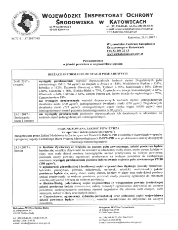 INSPEKTORAT OCHRONY ,i'7k WOJEWóDZKX ŚRODOWISKA w KATOWICACH «) tel. (32) 251-80-40, tel./fax (32) 251-55-54 e-mail: [email protected] www.katowice.wios.gov.pl ul. Wita Stwosza 2 40-036 Katowice Katowice, 25.0? .2017 r. M.701 l.l.l7.20l7.NG Wojewódzkie Centrum Zarządzania Kryzysowego w Katowicach Fax 32 256 22 13 czkws@)katowice.uw.gov.pl Powiadomienie o jakości powietrza w wojewódzhvie śląskim BIEŻĄCE INFORMACJE ZE STACJI POIVHAROWYCH ?24.Ol.20l7r. (wtorek) wystąpiły przekroczenia waitości dopuszczalnych średnich stężeń 24-godzinnych pyłu zawieszonego PM?O (50 pg/m3) na stacjach w Żywcu o 1 88o/o, Wodzisławiu Śląskim o 138%, Rybniku o 1 12%, Dąbrowie Górniczej o 98o/o, Tychach o 90%, Katowicach o 80%, Zabrzu o 80%, Cieszynie o 76%, Bielsku-Białej o 70%, Częstochowie (stacja komunikacyjna) o 64%, Gliwicach o 64%, Ustroniu o 64%, Złotym Potoku gm. Janów (stacja tła regionalnego) o 26%, Częstochowie o 1 8o/o; nie wrystąpiły przekroczenia waitości dopuszczalnych średnich stężeń: jednogodzinnych dwutlenku azotu (200 pg/m3), jednogodzinnych dwut]enku siarki (350 pg/m3), 24-godzinnych dwutlenku siarki (125 pg/m3), ośmiogodzinnych stężeń t)enku węgla (10000 yg/m3) oraz ?25.Ol.20l7r. (środa) godz. nocne i poranne ośmiogodzinnych stężeń poziomu docelosvego ozonu (120 pg/m3). nie wystąpiły przekroczenia poziomów dopuszczalnych 1ub doce1owych w odniesieniu do średnich stężeń jednogodzinnych i ośmiogodzinnych. PROGNOZOWANA JAKOŚĆ POWIETRZA (w oparciu o indeks jakości powietrza') przygotowana przez Zakład Mode]owania Zanieczyszczeń Powietrza IMGW-PIB z siedzibą w Katowicach w oparciu o prognozę pogody Centralnego Biura Prognoz Meteorologicznych IMGW-PIB oraz po dokonanici analizy dostępnych informacji meteoro)ogicznych 25.01.2017 r. (środa) w Kotlinie Żywieckie,i ze względu na poziom pyłu zawieszonego, .iakość powietrza będzie bardzo zła; wszelkie aktywności na zewnątrz S4 odradzane; osoby chore, osoby starsze, kobiety w ciąży oraz małe dzieci powinny bezwzględnie ?inikać przebywania na wolnym powietrzu; pozostałe osoby powinny ograniczyć przebywanie na wolnym powietrzu do niezbędnego minimum; wystąpią przekroczenia poziomu informowania stężenia pyłu zawieszonego PMIO (200 ug/rr!); w aglomeracji górnośląskie,j i środkowe,i części wo,iewództwa śląskiego (powiaty: bieruńskolędziński, pszczyński, gliwicki, mikołowski, raciborski, rybnicki, wodzis)awski) jakość powietrza będzie zła; osoby chore, osoby starsze, kobiety w ciąży oraz małe dzieci powinny unikać przebywania na wo1nym powietrzu; pozostałe osoby powinny ograniczyć do minimui'n wszelką aktywność fizyczn,ą na wo)nyin powietrzu; w Bielsku-Białej, południowej części województwa (z wyłączeniem powiatu żywieckiego) jakosć powietrza będzie dustaicczaa; należy rozważyć ograniczenie aktywności na wolnym powietrzu; zanieczyszczenie powietrza stanowi zagrożenie dla zdrowia osób chorych, osób starszych, kobiet w ciąży oraz małych dzieci; w Częstochowie, aglomerac.ii rybnicko-jastrzębskie,i oraz północnej części województwa 1akosc powietrza będzie , warunki umiarkowane do aktywnosci na wolnym powietrzu. Delegatura WIO!; w Bielsku-Bia}ej ul. Partyzantów 117 Delegatura WIOS w Częstochowie Lll. Rząsawska 24/28 43-3 16 Bielsko-Biała 42-200 Czrąstochowa tel. (33) 812-44-92, (33) 812-30-37, te)./fax (33) 812-49-30 (el. (34) 369 4120, (34) 364-35-12, tel./fax (34) 360-42-80 e-mail: [email protected] e-mail: [email protected] 2 ?26.Ol.20l7r. (czwartek) * w środkowej części wo.iewództwa sląskieg,o ze względu na poziom pyłu zawjeszonego, ,jakość powietrza będzie zła; w Bielsku-Białej, aglomeracji rybnicko-jastrzębskie,i oraz południowej części wo.iewództwa jakość powietrza będzie <jostiit:.ez:?::t; w Częstochowje, ag?omeracji gornosląskie) oraz połnocne3 częsci wo)ewodztwa )akosc powietrza będzie Informacie związane z indeksem jakości powietrza, w tyin zalecenia zdrowotne. zna.jdu.ją się na stronie internetowej http://ty;vw.katowice.wios.goy.(?i w zakładce: ,,System Prognoz .!akości Powietrza". dr Jerzy Kopyczok Z-ca Śląskiego Wojewódzkźego Inspektora Ochrony Środowźska Do wiadomości: Urząd Marszałkowski Województwa Śląskiego: [email protected], [email protected] Wojewódzka Stacja Sanitarno - Epidemio1ogiczna w Katowicach: [email protected] POWIADOM?ENIE o wystąpieniu przekroczenia poziomu informowania o ryzyku wystąpienia stanu alarmowego dla pyłu zawieszonego PMIO w powietrzu l I l Przekroczffina wartość poziomu informowania 200 pg/m3 o ryzyku ZagroŻenie wystąpienia stanu alarmowego dla pyłu zawieszonego PMIO w powietrzu. Data wystąpienia 19-20.01.2017 Powiaty: żywiecki, wodzisławski, raciborski, pszczyński, mikołowski, Obszar Przyczyny rybnicki, bieruńsko-lędziński, gliwicki. Warunki meteorologiczne utrudniające rozprzestrzenianie się zanieczyszczeń w sytuacji wzmożonej emisji z sektora bytowo-komunalnego. PROGNOZOWANA JAKOŚĆ POWIETRZA l l INFORMACJE O PRZEKROCZENIU W dniu 20.01.2017 r. (piątek) w powiatach źywieckim, wodzisławskim, raciborskim, pszczyńskim, mikołowskim, rybnickim, bieruńsko-lędzińskim, gliwickim ze względu na poziom pyłu zawieszonego jakość powietrza będzie bardzo zła, wystąpią przekroczenia poziomu informowania stężenia PMIO (200 ug/m3). W dniu 21.01.2017 r. (sobota) w powiecie żywieckim jakość powietrza będzie zła, w pozostałych powiatach cios':.:;:;i:et::ii xa>., wystąpią znaczne przekroczenia stężenia PMIO (50 pg/m3). INFORMACJE O ZAGROŻENIU @ osoby cierpiące z powodu przewlekłych chorób serca (zwłaszcza niewydolność serca, choroba wieńcowa), * osoby cierpiące z powodu przewlekłych chorób układu oddechowego (astma, przewlekła choroba płuc), * osoby starsze, kobiety w ciąży oraz małe dzieci. Osoby cierpiące z powodu chorób serca mogą odczuwać pogorszenie samopoczucia: uczucie bólu w k