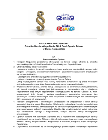 REGULAMIN PORZĄDKOWY Ośrodka Narciarskiego Bania Ski & Fun i Ogrodu Zabaw w Białce Tatrzańskiej 1. 2. 3. 4. 5. 6. §1 Postanowienia Ogólne Niniejszy Regulamin porządkowy obowiązuje na terenie całego Obiektu tj. Ośrodka Narciarskiego Bania Ski & Fun w Białce Tatrzańskiej oraz Ogrodu Zabaw. Obiekt świadczy usługi w zakresie: - przewozu kolejami linowymi krzesełkowymi oraz wyciągami narciarskimi zwanymi dalej kolejami i wyciągami, przenośnikiem taśmowym i pozostałymi urządzeniami znajdującymi się na terenie Obiektu, - udostępniania prawidłowo przygotowanych tras zjazdowych, - usług o charakterze rekreacyjnym na terenie Ogrodu Zabaw. Usługi wypożyczania sprzętu oraz szkoły narciarskiej świadczone są przez niezależne podmioty gospodarcze za które Zarządzający nie ponosi odpowiedzialności. Wejście na teren Obiektu, a także zakup i posługiwanie się elektroniczna kartą zbliżeniową lub innymi rodzajami biletów jest jednoznaczne z zapoznaniem się z niniejszym Regulaminem oraz innymi regulaminami obowiązującymi na terenie Obiektu (tj. m.in. regulaminami: kolei linowej i wyciągu orczykowego, przenośnika taśmowego, tras zjazdowych i atrakcji dodatkowych oraz korzystania z elektronicznych kart zbliżeniowych itd.) i akceptacją ich postanowień. Tabliczki piktogramowe i informacyjne umieszczone na urządzeniach i wokół atrakcji stanowią integralną część Regulaminu. Użytkownicy zobowiązani są do bezwzględnego przestrzegania informacji zamieszczonych na tabliczkach piktogramowych i informacyjnych oraz wykonywania poleceń pracowników Obiektu. Na urządzeniach lub wokół nich mogą być umieszczone wyciągi z Regulaminów, których zapisów należy bezwzględnie przestrzegać. Opiekun dziecka ma obowiązek zapoznać się z regulaminami poszczególnych atrakcji znajdujących się na terenie Obiektu, z których dziecko zamierza skorzystać oraz przekazać dziecku zasady bezpieczeństwa. Regulaminy te stanowią integralną część niniejszego Regulaminu. Użytkownicy zobowiązani są do bezwzględnego przestrzegania niniejszego regulaminu oraz regulaminów poszczególnych atrakcji znajdujących się na terenie Ogrodu Zabaw. 7. Obsługa urządzenia ma prawo ze względów bezpieczeństwa i w uzasadnionych przypadkach odmówić danej osobie skorzystania z urządzenia lub atrakcji. 8. Numery telefonów alarmowych oraz innych ważnych telefonów znajdują się na tablicach umieszczonych przy kasach Obiektu, a także na tablicy obok niniejszego Regulaminu. 9. Obiekt czynny jest w terminach podanych do publicznej wiadomości na stronie internetowej: www.bania.pl oraz na tablicach informacyjnych umieszczonych przy kasach. Przebywanie na terenie Obiektu poza godzinami jego otwarcia jest zabronione. 10. Na terenie Obiektu zabrania się: a. wnoszenia przedmiotów zagrażających bezpieczeństwu ruchu narciarskiego oraz pozostawianie i wyrzucanie nieczystości, b. prowadzenia przez osoby trzecie jakiejkolwiek działalności gospodarczej i usługowej, zarówno odpłatnie, jak też nieodpłatnie, w tym również w celach zarobkowych lub komercyjnych przy użyciu infrastruktury Ośrodka lub na jego terenie (z kolejami, wyciągami i trasami zjazdowymi włącznie), w tym umieszczanie reklam i ulotek jest dopuszczalne wyłącznie za uprzednią zgodą Zarządu. Osoby przebywające na terenie Obiektu powinny zachować należytą ostrożność i postępować w sposób niezagrażający życiu, zdrowiu oraz bezpieczeństwu własnemu i innych osób. 11. Urządzenia Obiektu posiadają standardowe rozmiary foteli, siedzisk i krzesełek oraz posiadają ograniczenia dotyczące wagi i wzrostu oraz zasad użycia systemów zabezpieczających umieszczone obok urządzeń. Osoby o niestandardowych wymiarach i wadze muszą się liczyć z możliwością nieskorzystania z niektórych lub w wyjątkowych sytuacjach, z wszystkich atrakcji. Niemożność skorzystania z urządzeń i atrakcji, ze względu na nietypowe gabaryty (wzrost, waga, szerokie biodra, etc.), nie mogą stanowić podstawy do reklamacji, odszkodowań, ani jakichkolwiek innych roszczeń (zwroty za bilet, rabaty, etc.). 12. Zarządca Obiektu, nie odmawia wstępu nawet przy bardzo dużej frekwencji. Dopóki liczba odwiedzających nie będzie stanowić zagrożenia dla bezpieczeństwa, wszystkie osoby, które zakupią bilet wstępu zostaną wpuszczone. W weekendy i pogodne dni należy liczyć się z dużą frekwencją, a co za tym idzie również z dłuższym czasem oczekiwania na dostęp do poszczególnych urządzeń i atrakcji. W związku powyższym, informujemy, że Zarządca nie będzie rozpatrywał reklamacji i skarg związanych z tłokiem, kolejkami i długim czasem oczekiwania na dostęp do atrakcji i urządzeń. 13. Niesprzyjające i trudne warunki atmosferyczne i pogodowe (burze, wichury, ulewny deszcz) nie mogą stanowić podstawy do reklamacji i jakichkolwiek roszczeń. Zarządca nie ma wpływu na pogodę i warunki atmosferyczne, a klient na własną odpowiedzialność podejmuje decyzję o zakupie biletu w danym dniu i w danym momencie. Nagła zmiana warunków pogodowych, nie będzie stanowić podstawy do zwrotu kosztów poniesionych na zakup biletu, reklamacji lub innych roszczeń. § 2. Zasady korzystania z urządzeń Ośrodka Narciarskiego Bania Ski & Fun 1. Koleje i wyciągi Ośrodka czynne są w godzinach podanych na tablicy nad wejściem na każde z tych urządzeń transportu linowego. Trasy zjazdowe otwarte są w czasie pracy kolei i wyciągów. Zabronione jest przebywanie na terenie tras zjazdowych oraz kolei i wyciągów narciarskich poza godzinami ich otwarcia. 2. Zabronione jest korzystanie z tras zjazdowych oraz kolei i wyciągów Ośrodka w stanie nietrzeźwości lub pod wpływem środków odurzających, jak również spożywanie alkoholu i palenie tytoniu poza miejscami do tego wyznaczonymi. 3. Zabrania się wprowadzania zwierząt na obszar tras zjazdowych, urządzeń transportu linowego i do bud