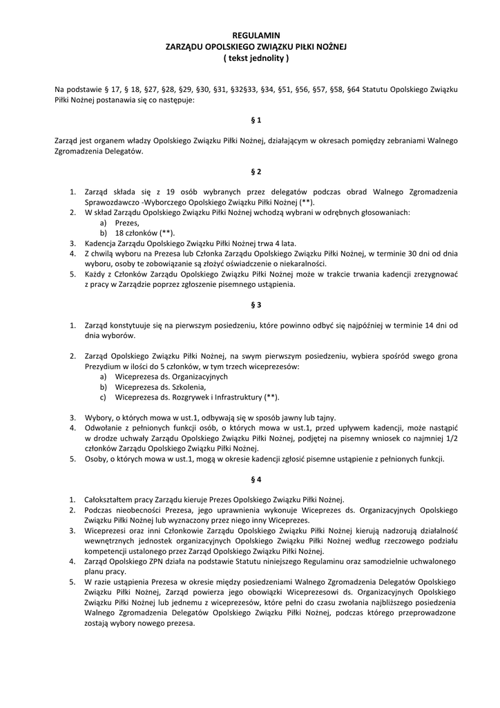 REGULAMIN ZARZĄDU OPOLSKIEGO ZWIĄZKU PIŁKI NOŻNEJ ( tekst jednolity ) Na podstawie § 17, § 18, §27, §28, §29, §30, §31, §32§33, §34, §51, §56, §57, §58, §64 Statutu Opolskiego Związku Piłki Nożnej postanawia się co następuje: §1 Zarząd jest organem władzy Opolskiego Związku Piłki Nożnej, działającym w okresach pomiędzy zebraniami Walnego Zgromadzenia Delegatów. §2 1. 2. 3. 4. 5. Zarząd składa się z 19 osób wybranych przez delegatów podczas obrad Walnego Zgromadzenia Sprawozdawczo -Wyborczego Opolskiego Związku Piłki Nożnej (**). W skład Zarządu Opolskiego Związku Piłki Nożnej wchodzą wybrani w odrębnych głosowaniach: a) Prezes, b) 18 członków (**). Kadencja Zarządu Opolskiego Związku Piłki Nożnej trwa 4 lata. Z chwilą wyboru na Prezesa lub Członka Zarządu Opolskiego Związku Piłki Nożnej, w terminie 30 dni od dnia wyboru, osoby te zobowiązanie są złożyć oświadczenie o niekaralności. Każdy z Członków Zarządu Opolskiego Związku Piłki Nożnej może w trakcie trwania kadencji zrezygnować z pracy w Zarządzie poprzez zgłoszenie pisemnego ustąpienia. §3 1. Zarząd konstytuuje się na pierwszym posiedzeniu, które powinno odbyć się najpóźniej w terminie 14 dni od dnia wyborów. 2. Zarząd Opolskiego Związku Piłki Nożnej, na swym pierwszym posiedzeniu, wybiera spośród swego grona Prezydium w ilości do 5 członków, w tym trzech wiceprezesów: a) Wiceprezesa ds. Organizacyjnych b) Wiceprezesa ds. Szkolenia, c) Wiceprezesa ds. Rozgrywek i Infrastruktury (**). 3. 4. Wybory, o których mowa w ust.1, odbywają się w sposób jawny lub tajny. Odwołanie z pełnionych funkcji osób, o których mowa w ust.1, przed upływem kadencji, może nastąpić w drodze uchwały Zarządu Opolskiego Związku Piłki Nożnej, podjętej na pisemny wniosek co najmniej 1/2 członków Zarządu Opolskiego Związku Piłki Nożnej. Osoby, o których mowa w ust.1, mogą w okresie kadencji zgłosić pisemne ustąpienie z pełnionych funkcji. 5. §4 1. 2. 3. 4. 5. Całokształtem pracy Zarządu kieruje Prezes Opolskiego Związku Piłki Nożnej. Podczas nieobecności Prezesa, jego uprawnienia wykonuje Wiceprezes ds. Organizacyjnych Opolskiego Związku Piłki Nożnej lub wyznaczony przez niego inny Wiceprezes. Wiceprezesi oraz inni Członkowie Zarządu Opolskiego Związku Piłki Nożnej kierują nadzorują działalność wewnętrznych jednostek organizacyjnych Opolskiego Związku Piłki Nożnej według rzeczowego podziału kompetencji ustalonego przez Zarząd Opolskiego Związku Piłki Nożnej. Zarząd Opolskiego ZPN działa na podstawie Statutu niniejszego Regulaminu oraz samodzielnie uchwalonego planu pracy. W razie ustąpienia Prezesa w okresie między posiedzeniami Walnego Zgromadzenia Delegatów Opolskiego Związku Piłki Nożnej, Zarząd powierza jego obowiązki Wiceprezesowi ds. Organizacyjnych Opolskiego Związku Piłki Nożnej lub jednemu z wiceprezesów, które pełni do czasu zwołania najbliższego posiedzenia Walnego Zgromadzenia Delegatów Opolskiego Związku Piłki Nożnej, podczas którego przeprowadzone zostają wybory nowego prezesa. 6. Wybór przedstawiciela Zarządu Opolskiego Związku Piłki Nożnej, o którym mowa w ust. 5 powinien odbyć się w terminie 30 dni od chwili ustąpienia lub zawieszenia dotychczasowego prezesa. §5 Do kompetencji Zarządu Opolskiego Związku Piłki Nożnej należy w szczególności: 1. 2. 3. 4. 5. 6. 7. 8. 9. 10. 11. 12. 13. 14. 15. 16. 17. Realizowanie programów i zaleceń przyjętych w uchwałach Walnego Zgromadzenia Delegatów Opolskiego Związku Piłki Nożnej, Zarządzanie majątkiem i funduszami Opolskiego Związku Piłki Nożnej, Przyjmowanie planów działania i planów finansowych oraz zatwierdzanie sprawozdań finansowych Opolskiego Związku Piłki Nożnej, Uchwalanie składki członkowskiej dla członków Opolskiego Związku Piłki Nożnej oraz innych opłat na rzecz Opolskiego Związku Piłki Nożnej w ramach działalności statutowej Opolskiego Związku Piłki Nożnej, Ustalanie wysokości składek oraz opłat, w tym opłat transferowych, zgodnie z przyznanymi przez Polski Związek Piłki Nożnej uprawnieniami, Zwoływanie zebrań Walnego Zgromadzenia Opolskiego Związku Piłki Nożnej, Dokonywanie zmian oraz zatwierdzanie wewnętrznej struktury organizacyjnej Opolskiego Związku Piłki Nożnej, Dokonywanie zmian oraz zatwierdzanie regulaminów Zarządu, Prezydium, Kolegiów Sędziów, Komisji, Wydziałów i innych jednostek organizacyjnych Opolskiego Związku Piłki Nożnej, (*) Uchwalanie wszelkiego rodzaju regulaminów, przepisów, postanowień, i wytycznych normujących uprawianie sportu piłki nożnej na terenie województwa opolskiego, Interpretacja Statutu Opolskiego Związku Piłki Nożnej oraz wszelkich regulaminów i innych aktów normatywnych zatwierdzonych lub uchwalonych przez Zarząd Opolskiego Związku Piłki Nożnej, Powoływanie i odwoływanie Przewodniczących KS, Komisji, Wydziałów oraz z członków organów dyscyplinarnych Opolskiego ZPN, (*) W razie potrzeby, powoływanie nowych komisji i zespołów oraz ich składów, Powołanie i odwołanie Rzecznika Ochrony Prawa Związkowego Opolskiego Związku Piłki Nożnej, Określenie kompetencji Rzecznika Ochrony Prawa Związkowego Opolskiego Związku Piłki Nożnej, Podejmowanie decyzji w sprawie powołania trenerów zespołów reprezentacyjnych Opolskiego Związku Piłki Nożnej oraz innych osób kadry szkoleniowo-organizacyjnej, Zarządzenie zbadania, przez uprawniony podmiot, sprawozdania finansowego Opolskiego Związku Piłki Nożnej, przed jego zatwierdzeniem, Podejmowanie innych decyzji i uchwał we wszystkich sprawach z wyjątkiem zastrzeżonych do kompetencji Walnego Zgromadzenia Delegatów, Komisji Rewizyjnej i organów jurysdykcyjnych Opolskiego Związku Piłki Nożnej. § 6 (**) Do kompetencji i odpowiedzialności poszczególnych funkcyjnych członków Prezydium Zarządu Opolskiego Związku Piłki Noż