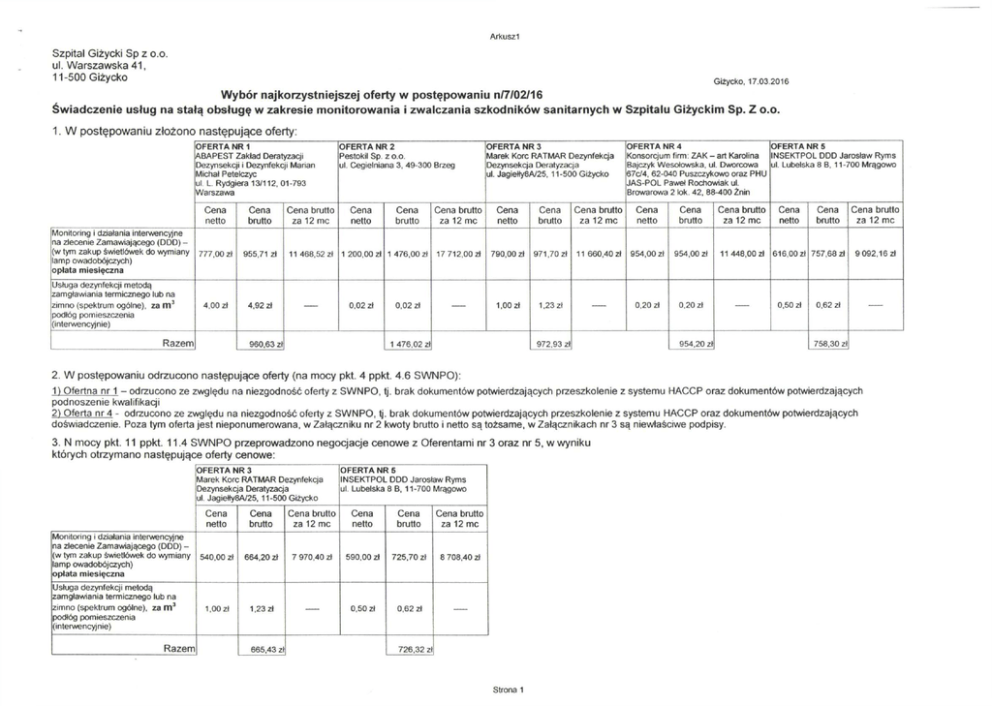 Arkuszl Szpital Giżycki Sp z o.o. ul. Warszawska 41, Ci^Cko, 11-500 Giżycko 17.03.2016 Wybór najkorzystniejszej oferty w postępowaniu n/7/02/16 Świadczenie usług na stałą obsługę w zakresie monitorowania i zwalczania szkodników sanitarnych w Szpitalu Giżyckim Sp. Z o.o. 1. W postępowaniu złożono następujące oferty: OFERTA NR 1 ABAPEST Zakład Deratyzacji Dezynsekcji i Dezynfekcji Marian Michał Petelczyc ul. L. Rydgiera 13/112, 01-793 Warszawa Monitoring i działania interwencyjne na zlecenie Zamawiającego (DDD) (w tym zakup świetlówek do wymiany lamp owadobójczycti) opłata miesięczna Usługa dezynfekcji metodą zamgławiania termicznego lub na zimno (spektrum ogólne), za m ' podłóg pomieszczenia (interwencyjnie) Cena netto Cena brutto Cena brutto za 12 mc 777,00 zł 955,71 zł 11 468,52 zł 4,00 zł 4,92 zł Razem OFERTA NR 2 Pestokil Sp. z 0.0. ul. Cegielniana 3, 49-300 Brzeg Cena netto Cena brutto 1 200,00 zł 1 476,00 zł 0.02 zł 960,63 zł OFERTA NR 3 Marek Koro RATMAR Dezynfekcja Dezynsekcja Deratyzacja ul. Jagiełły8A/25, 11-500 Giżycko OFERTA NR 4 OFERTA NR 5 Konsorcjum firm: ZAK - art Karolina INSEKTPOL DDD Jarosław Ryms Bajczyk Wesołowska, ul. Dworcowa ul. Lubelska 8 B, 11-700 Mrągowo 67C/4, 62-040 Puszczykowo oraz PHU JAS-POL Paweł Rochowiak ul. Browarowa 2 lok. 42, 88-400 Żnin Cena brutto za 12 mc Cena netto Cena brutto Cena brutto za 12 mc Cena netto Cena brutto 17 712,00 zł 790,00 zł 971,70 zł 11 660,40 zł 954,00 zł 954,00 zł 1,00 zł 1,23 zł 0,20 zł 0,20 zł 0,02 zł 972,93 zł 1 476,02 zł 954,20 zł Cena brutto za 12 mc Cena netto Cena bmtto 11 448,00 zł 616,00 zł 757,68 zł 0,50 zł Cena brutto za 12 mc 9 092,16 zł 0,62 zł 758,30 zł 2. W postępowaniu odrzucono następujące oferty (na mocy pkt. 4 ppkt. 4.6 S W N P O ) : 1) Ofertna nr 1 - odrzucono ze zwględu na niezgodność oferty z SWNPO, tj. brak dokumentów potwierdzających przeszkolenie z systemu HACCP oraz dokumentów potwierdzających podnoszenie kwalifikacji 2) Oferta nr 4 - odrzucono ze zwględu na niezgodność oferty z SWNPO, tj. brak dokumentów potwierdzających przeszkolenie z systemu HACCP oraz dokumentów potwierdzających doświadczenie. Poza tym oferta jest nieponumerowana, w Załączniku nr 2 kwoty brutto I netto są tożsame, w Załącznikach nr 3 są niewłaściwe podpisy. 3. N mocy pkt. 11 ppkt. 11.4 S W N P O przeprowadzono negocjacje cenowe z Oferentami nr 3 oraz nr 5, w wyniku którycti otrzymano następujące oferty cenowe: OFERTA NR 3 Marek Korc FłATMAR Dezynfekcja Dezynsekcja Deratyzacja ul Jagiełły8A/25, 11-500 GiZycko Monitoring i działania interwencyjne na zlecenie Zamawiającego (DDD) (w tym zakup świetlówek do wymiany lamp owadotójczych) opłata miesięczna Usługa dezynfekcji metodą zamgławiania termicznego lub na zimno (spektrum ogólne), za m ' podłóg pomieszczenia (interwencyjnie) Razem OFERTA NR 5 INSEKTPOL DDD Jarosław Ryms ul. Lubelska 8 B, 11-700 Mrągowo Cena netto Cena brutto Cena brutto za 12 mc Cena netto Cena brutto Cena brutto za 12 mc 540.00 zł 664,20 zł 7 970,40 zł 590,00 zł 725,70 zł 8 708,40 zł 1,00 zł 1,23 zł 665,43 zł 0,50 zł 0,62 Zł 726,32 zł Strona 1 Arkuszl 4. Jako najkorzystniejszą ofertę, po przeprowadzonych negocjacjach cenowych wybrano: OFERTA NR 3 Marek Korc RATMAR Dezynfekcja Dezynsekcja Deratyzacja ul. Jagiełły8A/25, 11-500 GIZycko Kwota brutto za miesięczny monitoring i działania interwencyjne na zlecenie Zamawiającego (DDD) (w tym zakup świetlówek do wymiany lamp owadotójczycb) 664,20 zł Kwota brutto za roczny monitoring i działania interwencyjne na zlecenie Zamawiającego (DDD) (w tym zakup świetlówek do wymiany lamp owadobójczych) 7 970,40 zł Usługa dezynfekcji metodą zamgławiania termicznego lub na zimno (spektrum ogólne), za m ' podłóg pomieszczenia (Interwencyjnie) 1,23 zł ZARZĄDCA PRZYMUSOWY WiolettflT^ndrysz Sporządził "SZPITAL GIŻYCKI" Sp. z o.o. 11-50C S i z y c k o , ul W a r s z a w s k a 41 tel. 87 i 2 9 56 65, fcx 87 428 35 77 Regon: 000308442, NIP: 8451983121 -3- Strona 2