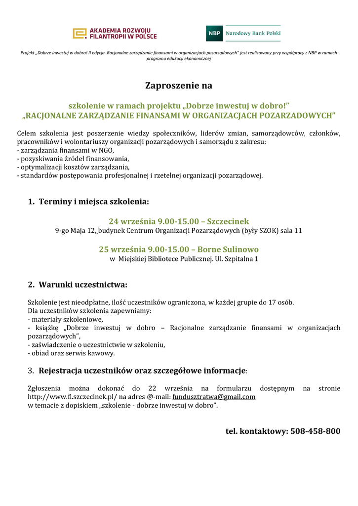 Projekt „Dobrze inwestuj w dobro! II edycja. Racjonalne zarządzanie finansami w organizacjach pozarządowych” jest realizowany przy współpracy z NBP w ramach programu edukacji ekonomicznej Zaproszenie na szkolenie w ramach projektu „Dobrze inwestuj w dobro!” „RACJONALNE ZARZĄDZANIE FINANSAMI W ORGANIZACJACH POZARZADOWYCH” Celem szkolenia jest poszerzenie wiedzy społeczników, liderów zmian, samorządowców, członków, pracowników i wolontariuszy organizacji pozarządowych i samorządu z zakresu: - zarządzania finansami w NGO, - pozyskiwania źródeł finansowania, - optymalizacji kosztów zarządzania, - standardów postępowania profesjonalnej i rzetelnej organizacji pozarządowej. 1. Terminy i miejsca szkolenia: 24 września 9.00-15.00 – Szczecinek 9-go Maja 12, budynek Centrum Organizacji Pozarządowych (były SZOK) sala 11 25 września 9.00-15.00 – Borne Sulinowo w Miejskiej Bibliotece Publicznej. Ul. Szpitalna 1 2. Warunki uczestnictwa: Szkolenie jest nieodpłatne, ilość uczestników ograniczona, w każdej grupie do 17 osób. Dla uczestników szkolenia zapewniamy: - materiały szkoleniowe, - książkę „Dobrze inwestuj w dobro – Racjonalne zarządzanie finansami w organizacjach pozarządowych”, - zaświadczenie o uczestnictwie w szkoleniu, - obiad oraz serwis kawowy. 3. Rejestracja uczestników oraz szczegółowe informacje: Zgłoszenia można dokonać do 22 września na formularzu dostępnym http://www.fl.szczecinek.pl/ na adres @-mail: [email protected] w temacie z dopiskiem „szkolenie - dobrze inwestuj w dobro”. na stronie tel. kontaktowy: 508-458-800