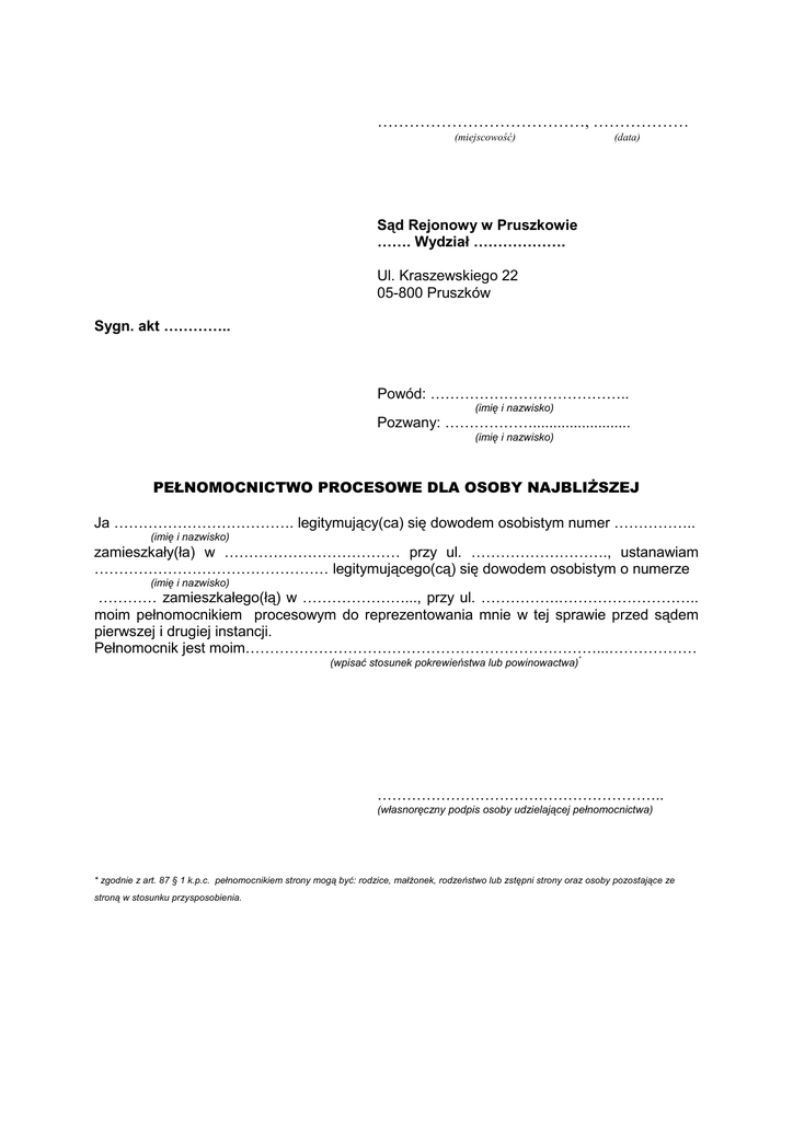 …………………………………, ……………… (miejscowość) (data) Sąd Rejonowy w Pruszkowie ……. Wydział ………………. Ul. Kraszewskiego 22 05-800 Pruszków Sygn. akt ………….. Powód: ………………………………….. (imię i nazwisko) Pozwany: ………………........................ (imię i nazwisko) PEŁNOMOCNICTWO PROCESOWE DLA OSOBY NAJBLIŻSZEJ Ja ………………………………. legitymujący(ca) się dowodem osobistym numer …………….. (imię i nazwisko) zamieszkały(ła) w ……………………………… przy ul. ………………………., ustanawiam ………………………………………… legitymującego(cą) się dowodem osobistym o numerze (imię i nazwisko) ………… zamieszkałego(łą) w …………………..., przy ul. …………….……………………….. moim pełnomocnikiem procesowym do reprezentowania mnie w tej sprawie przed sądem pierwszej i drugiej instancji. Pełnomocnik jest moim………………………………………………………………...……………… (wpisać stosunek pokrewieństwa lub powinowactwa)* ………………………………………………….. (własnoręczny podpis osoby udzielającej pełnomocnictwa) * zgodnie z art. 87 § 1 k.p.c. pełnomocnikiem strony mogą być: rodzice, małżonek, rodzeństwo lub zstępni strony oraz osoby pozostające ze stroną w stosunku przysposobienia.
