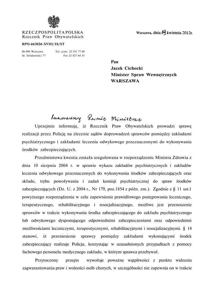 RZECZPOSPOLITA POLSKA Rzecznik Praw Obywatelskich RPO-663026-XVIII/10/ST 00-090 Warszawa Tel. centr. 22 551 77 00 Al. Solidarności 77 Fax 22 827 64 53 Pan Jacek Cichocki Minister Spraw Wewnętrznych WARSZAWA Uprzejmie informuję, iż Rzecznik Praw Obywatelskich prowadzi sprawę realizacji przez Policję na zlecenie sądów doprowadzeń sprawców pomiędzy zakładami psychiatrycznego i zakładami leczenia odwykowego przeznaczonymi do wykonywania środków zabezpieczających. Przedmiotowa kwestia została uregulowana w rozporządzeniu Ministra Zdrowia z dnia 10 sierpnia 2004 r. w sprawie wykazu zakładów psychiatrycznych i zakładów leczenia odwykowego przeznaczonych do wykonywania środków zabezpieczających oraz składu, trybu powoływania i zadań komisji psychiatrycznej do spraw środków zabezpieczających (Dz. U. z 2004 r., Nr 179, poz.1854 z późn. zm.). Zgodnie z § 11 ust.l powyższego rozporządzenia w celu zapewnienia prawidłowego postępowania leczniczego, terapeutycznego, rehabilitacyjnego i resocjalizacyjnego, możliwe jest przenoszenie sprawców w trakcie wykonywania środka zabezpieczającego do zakładu psychiatrycznego lub odwykowego dysponującego odpowiednimi zabezpieczeniami oraz odpowiednimi możliwościami leczniczymi, terapeutycznymi, rehabilitacyjnymi i resocjalizacyjnymi. § 14 stanowi, iż przeniesienie sprawcy pomiędzy zakładami wykonującymi środek zabezpieczający realizuje Policja, korzystając w uzasadnionych przypadkach z pomocy fachowego personelu medycznego zakładu, w którym sprawca przebywał. Przytoczony przepis wywołuje poważne wątpliwości z punktu widzenia zagwarantowania praw i wolności osób chorych, w szczególności nie zapewnia on w trakcie 2 przewozu sprawców skierowanych do zakładów psychiatrycznych lub odwykowych pomocy fachowego personelu medycznego. Zwrócić należy przede wszystkim uwagę na niedookreśloność przesłanki „uzasadnionych przypadków", które mogą stanowić podstawę żądania przez Policję udziału w transporcie fachowego personelu medycznego. W szczególności w praktyce pojawia się problem, jaki podmiot ma decydować o tym, czy określony przypadek można kwalifikować jako „uzasadniony" - Policja, czy personel medyczny zakładu, w którym sprawca przebywał. Stanowisko prezentowane w tej materii przez Policję może nie znajdować uznania w opinii podmiotów realizujących opiekę medyczną. Biuro Prewencji Komendy Głównej Policji w piśmie skierowanym do Biura Rzecznika Praw Obywatelskich (nr EKO-1935/1934/11) wprost wskazało, iż w praktyce zdarzają się przypadki rozbieżności stanowisk - w sytuacji gdy w odpowiedzi na wnioski Policji o włączenie do transportu personelu medycznego, właściwy zakład leczniczy, wskazuje, iż stan zdrowia sprawcy nie wymaga fachowego personelu medycznego. Podkreślić należy, że o ile zgodzić się można z tym, iż w przypadku przewożenia sprawców pomiędzy zakładami leczenia odwykowego nie ma konieczności każdorazowego udziału fachowego personelu medycznego, to udział takiego personelu jest w pełni uzasadniony w przypadku sprawców, wobec których zastosowano środek zabezpieczający w postaci umieszczenia w zakładzie psychiatrycznym. Policja w takich sytuacjach nie może samodzielnie zapewnić specjalistycznej opieki medycznej, w tym także poprzez brak specjalistycznych pojazdów, którymi doprowadzenia mogłyby być przez nią realizowane. Odrębny problem wiąże się z tym, że w przypadku sprawców wobec których zastosowano środek zabezpieczający w postaci umieszczenia w zakładzie psychiatrycznym, nie można wykluczyć w trakcie konwojowania zaistnienia sytuacji, iż mogą oni swoim zachowaniem zagrozić życiu i zdrowiu własnemu i innych osób. Podkreślić należy, iż zdarzenia takie są w praktyce nieprzewidywalne i mają one charakter dynamiczny. Zastosowanie przez Policję środków przymusu bezpośredniego, gdy chodzi o pacjentów zakładów psychiatrycznych, w sytuacji braku natychmiastowej pomocy fachowego personelu medycznego, który może zastosować środki przymusu adekwatne do sytuacji, zaistniałych zdarzeń. podmiotu Niewątpliwie musi to rodzić także pytanie, o odpowiedzialność konwojującego doprowadzanym. może doprowadzić do eskalacji w zakresie zapewnienia właściwej opieki osobom 3 Zauważyć należy, iż w podobnych sytuacjach inne przepisy rangi ustawowej, czy też przepisy wykonawcze w sposób odmienny regulują kwestię przewożenia osób chorych pomiędzy zakładami opieki zdrowotnej, czy też doprowadzania ich do szpitali psychiatrycznych. Przykładowo, zgodnie z art. 46a ust.3 w zw. z art.46 ustawy z dnia 19 sierpnia 1994 r. o ochronie zdrowia psychicznego (t.j. Dz. U. z 2011 r., Nr 231, poz. 1375 z późn. zm.) przy wykonywaniu postanowień sądowych o przyjęciu do szpitala psychiatrycznego zatrzymanie i przymusowe doprowadzenie przez Policję następuje w obecności lekarza, pielęgniarki lub zespołu ratownictwa medycznego. Ponadto § 14 w zw. z § 2 ust.l rozporządzenia Ministra Zdrowia z dnia 20 kwietnia 2005 r. w sprawie szczegółowych zasad kierowania, przyjmowania, przenoszenia, zwalniania i pobytu nieletnich w publicznych zakładach opieki zdrowotnej (Dz.U. z 2005 r., Nr 79, poz.692) stanowi, iż przewóz nieletniego na podstawie orzeczenia sądu, w przypadku przeniesienia go do innego publicznego zakładu psychiatrycznego opieki zdrowotnej, publicznego zakładu lecznictwa odwykowego lub innego publicznego zakładu opieki zdrowotnej sprawującego opiekę medyczną nad osobami z upośledzeniem umysłowym, chorobą psychiczną bądź z innymi zakłóceniami czynności psychicznych, w tym uzależnionych od alkoholu albo substancji psychoaktywnych zapewnia zakład wnioskujący przeniesienie. Bezsprzecznie przewozy sprawców pomiędzy zakładami leczniczymi, czy też terapeutycznymi wykonującymi środki zabezpieczające winny odbywać się w asyście Policji, trudno natomiast zaakceptow