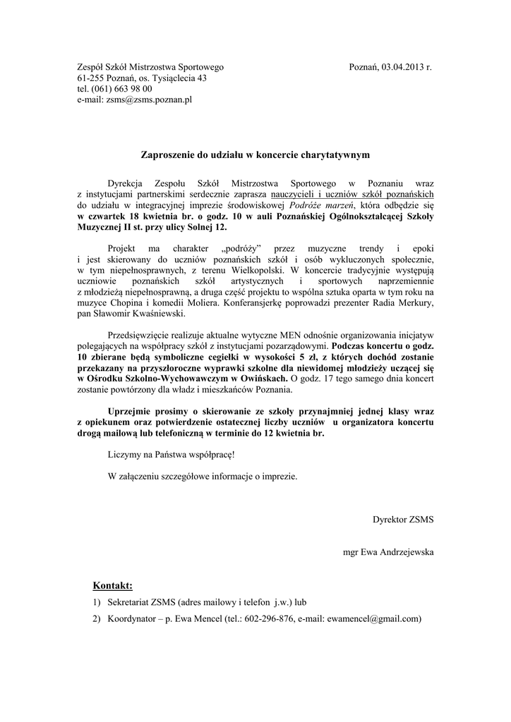 Zespół Szkół Mistrzostwa Sportowego 61-255 Poznań, os. Tysiąclecia 43 tel. (061) 663 98 00 e-mail: [email protected] Poznań, 03.04.2013 r. Zaproszenie do udziału w koncercie charytatywnym Dyrekcja Zespołu Szkół Mistrzostwa Sportowego w Poznaniu wraz z instytucjami partnerskimi serdecznie zaprasza nauczycieli i uczniów szkół poznańskich do udziału w integracyjnej imprezie środowiskowej Podróże marzeń, która odbędzie się w czwartek 18 kwietnia br. o godz. 10 w auli Poznańskiej Ogólnokształcącej Szkoły Muzycznej II st. przy ulicy Solnej 12. Projekt ma charakter „podróży” przez muzyczne trendy i epoki i jest skierowany do uczniów poznańskich szkół i osób wykluczonych społecznie, w tym niepełnosprawnych, z terenu Wielkopolski. W koncercie tradycyjnie występują uczniowie poznańskich szkół artystycznych i sportowych naprzemiennie z młodzieżą niepełnosprawną, a druga część projektu to wspólna sztuka oparta w tym roku na muzyce Chopina i komedii Moliera. Konferansjerkę poprowadzi prezenter Radia Merkury, pan Sławomir Kwaśniewski. Przedsięwzięcie realizuje aktualne wytyczne MEN odnośnie organizowania inicjatyw polegających na współpracy szkół z instytucjami pozarządowymi. Podczas koncertu o godz. 10 zbierane będą symboliczne cegiełki w wysokości 5 zł, z których dochód zostanie przekazany na przyszłoroczne wyprawki szkolne dla niewidomej młodzieży uczącej się w Ośrodku Szkolno-Wychowawczym w Owińskach. O godz. 17 tego samego dnia koncert zostanie powtórzony dla władz i mieszkańców Poznania. Uprzejmie prosimy o skierowanie ze szkoły przynajmniej jednej klasy wraz z opiekunem oraz potwierdzenie ostatecznej liczby uczniów u organizatora koncertu drogą mailową lub telefoniczną w terminie do 12 kwietnia br. Liczymy na Państwa współpracę! W załączeniu szczegółowe informacje o imprezie. Dyrektor ZSMS mgr Ewa Andrzejewska Kontakt: 1) Sekretariat ZSMS (adres mailowy i telefon j.w.) lub 2) Koordynator – p. Ewa Mencel (tel.: 602-296-876, e-mail: [email protected])