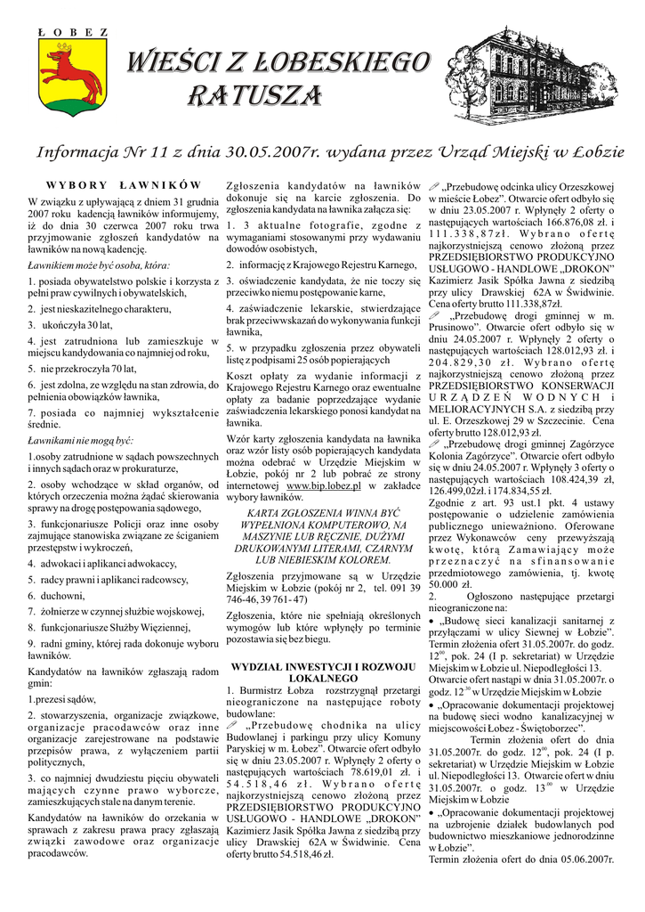 ´ WIEsCI Z lobeskiego RATUSZA Informacja Nr 11 z dnia 30.05.2007r. wydana przez Urz¹d Miejski w £obzie WYBORY £AW N I K Ó W Zg³oszenia kandydatów na ³awników ! „Przebudowê odcinka ulicy Orzeszkowej W zwi¹zku z up³ywaj¹c¹ z dniem 31 grudnia dokonuje siê na karcie zg³oszenia. Do w mieœcie £obez”. Otwarcie ofert odby³o siê w dniu 23.05.2007 r. Wp³ynê³y 2 oferty o 2007 roku kadencj¹ ³awników informujemy, zg³oszenia kandydata na ³awnika za³¹cza siê: i¿ do dnia 30 czerwca 2007 roku trwa 1. 3 aktualne fotografie, zgodne z nastêpuj¹cych wartoœciach 166.876,08 z³. i przyjmowanie zg³oszeñ kandydatów na wymaganiami stosowanymi przy wydawaniu 1 1 1 . 3 3 8 , 8 7 z ³ . W y b r a n o o f e r t ê najkorzystniejsz¹ cenowo z³o¿on¹ przez dowodów osobistych, ³awników na now¹ kadencjê. PRZEDSIÊBIORSTWO PRODUKCYJNO 2. informacjê z Krajowego Rejestru Karnego, US£UGOWO - HANDLOWE „DROKON” £awnikiem mo¿e byæ osoba, która: 1. posiada obywatelstwo polskie i korzysta z 3. oœwiadczenie kandydata, ¿e nie toczy siê Kazimierz Jasik Spó³ka Jawna z siedzib¹ przy ulicy Drawskiej 62A w Œwidwinie. przeciwko niemu postêpowanie karne, pe³ni praw cywilnych i obywatelskich, Cena oferty brutto 111.338,87z³. 4. zaœwiadczenie lekarskie, stwierdzaj¹ce 2. jest nieskazitelnego charakteru, ! „Przebudowê drogi gminnej w m. brak przeciwwskazañ do wykonywania funkcji 3. ukoñczy³a 30 lat, Prusinowo”. Otwarcie ofert odby³o siê w ³awnika, dniu 24.05.2007 r. Wp³ynê³y 2 oferty o 4. jest zatrudniona lub zamieszkuje w 5. w przypadku zg³oszenia przez obywateli nastêpuj¹cych wartoœciach 128.012,93 z³. i miejscu kandydowania co najmniej od roku, listê z podpisami 25 osób popieraj¹cych 2 0 4 . 8 2 9 , 3 0 z ³ . Wy b r a n o o f e r t ê 5. nie przekroczy³a 70 lat, Koszt op³aty za wydanie informacji z najkorzystniejsz¹ cenowo z³o¿on¹ przez 6. jest zdolna, ze wzglêdu na stan zdrowia, do Krajowego Rejestru Karnego oraz ewentualne PRZEDSIÊBIORSTWO KONSERWACJI pe³nienia obowi¹zków ³awnika, op³aty za badanie poprzedzaj¹ce wydanie U R Z ¥ D Z E Ñ W O D N Y C H i 7. posiada co najmniej wykszta³cenie zaœwiadczenia lekarskiego ponosi kandydat na MELIORACYJNYCH S.A. z siedzib¹ przy ul. E. Orzeszkowej 29 w Szczecinie. Cena ³awnika. œrednie. oferty brutto 128.012,93 z³. Wzór karty zg³oszenia kandydata na ³awnika £awnikami nie mog¹ byæ: ! „Przebudowê drogi gminnej Zagórzyce oraz wzór listy osób popieraj¹cych kandydata Kolonia Zagórzyce”. Otwarcie ofert odby³o 1.osoby zatrudnione w s¹dach powszechnych mo¿na odebraæ w Urzêdzie Miejskim w siê w dniu 24.05.2007 r. Wp³ynê³y 3 oferty o i innych s¹dach oraz w prokuraturze, £obzie, pokój nr 2 lub pobraæ ze strony nastêpuj¹cych wartoœciach 108.424,39 z³, 2. osoby wchodz¹ce w sk³ad organów, od internetowej www.bip.lobez.pl w zak³adce 126.499,02z³. i 174.834,55 z³. których orzeczenia mo¿na ¿¹daæ skierowania wybory ³awników. Zgodnie z art. 93 ust.1 pkt. 4 ustawy sprawy na drogê postêpowania s¹dowego, KARTA ZG£OSZENIA WINNA BYÆ postêpowanie o udzielenie zamówienia 3. funkcjonariusze Policji oraz inne osoby WYPE£NIONA KOMPUTEROWO, NA publicznego uniewa¿niono. Oferowane zajmuj¹ce stanowiska zwi¹zane ze œciganiem MASZYNIE LUB RÊCZNIE, DU¯YMI przez Wykonawców ceny przewy¿szaj¹ przestêpstw i wykroczeñ, DRUKOWANYMI LITERAMI, CZARNYM kwotê, któr¹ Zamawiaj¹cy mo¿e LUB NIEBIESKIM KOLOREM. przeznaczyæ na sfinansowanie 4. adwokaci i aplikanci adwokaccy, przedmiotowego zamówienia, tj. kwotê Zg³oszenia przyjmowane s¹ w Urzêdzie 5. radcy prawni i aplikanci radcowscy, Miejskim w £obzie (pokój nr 2, tel. 091 39 50.000 z³. 6. duchowni, 2. Og³oszono nastêpuj¹ce przetargi 746-46, 39 761- 47) nieograniczone na: 7. ¿o³nierze w czynnej s³u¿bie wojskowej, Zg³oszenia, które nie spe³niaj¹ okreœlonych · „Budowê sieci kanalizacji sanitarnej z wymogów lub które wp³ynê³y po terminie przy³¹czami w ulicy Siewnej w £obzie”. 8. funkcjonariusze S³u¿by Wiêziennej, 9. radni gminy, której rada dokonuje wyboru pozostawia siê bez biegu. Termin z³o¿enia ofert 31.05.2007r. do godz. ³awników. Kandydatów na ³awników zg³aszaj¹ radom gmin: 1.prezesi s¹dów, 2. stowarzyszenia, organizacje zwi¹zkowe, organizacje pracodawców oraz inne organizacje zarejestrowane na podstawie przepisów prawa, z wy³¹czeniem partii politycznych, 3. co najmniej dwudziestu piêciu obywateli maj¹cych czynne prawo wyborcze, zamieszkuj¹cych stale na danym terenie. Kandydatów na ³awników do orzekania w sprawach z zakresu prawa pracy zg³aszaj¹ zwi¹zki zawodowe oraz organizacje pracodawców. WYDZIA£ INWESTYCJI I ROZWOJU LOKALNEGO 1. Burmistrz £obza rozstrzygn¹³ przetargi nieograniczone na nastêpuj¹ce roboty budowlane: ! „Przebudowê chodnika na ulicy Budowlanej i parkingu przy ulicy Komuny Paryskiej w m. £obez”. Otwarcie ofert odby³o siê w dniu 23.05.2007 r. Wp³ynê³y 2 oferty o nastêpuj¹cych wartoœciach 78.619,01 z³. i 5 4 . 5 1 8 , 4 6 z ³ . Wy b r a n o o f e r t ê najkorzystniejsz¹ cenowo z³o¿on¹ przez PRZEDSIÊBIORSTWO PRODUKCYJNO US£UGOWO - HANDLOWE „DROKON” Kazimierz Jasik Spó³ka Jawna z siedzib¹ przy ulicy Drawskiej 62A w Œwidwinie. Cena oferty brutto 54.518,46 z³. 1200, pok. 24 (I p. sekretariat) w Urzêdzie Miejskim w £obzie ul. Niepodleg³oœci 13. Otwarcie ofert nast¹pi w dnia 31.05.2007r. o godz. 12.30 w Urzêdzie Miejskim w £obzie · „Opracowanie dokumentacji projektowej na budowê sieci wodno kanalizacyjnej w miejscowoœci £obez - Œwiêtoborzec”. Termin z³o¿enia ofert do dnia 31.05.2007r. do godz. 1200, pok. 24 (I p. sekretariat) w Urzêdzie Miejskim w £obzie ul. Niepodleg³oœci 13. Otwarcie ofert w dniu 31.05.2007r. o godz. 13.00 w Urzêdzie Miejskim w £obzie · „Opracowanie dokumentacji projektowej na uzbrojenie dzia³ek budowlanych pod budownictwo mieszkaniowe jednorodzinne w £obz