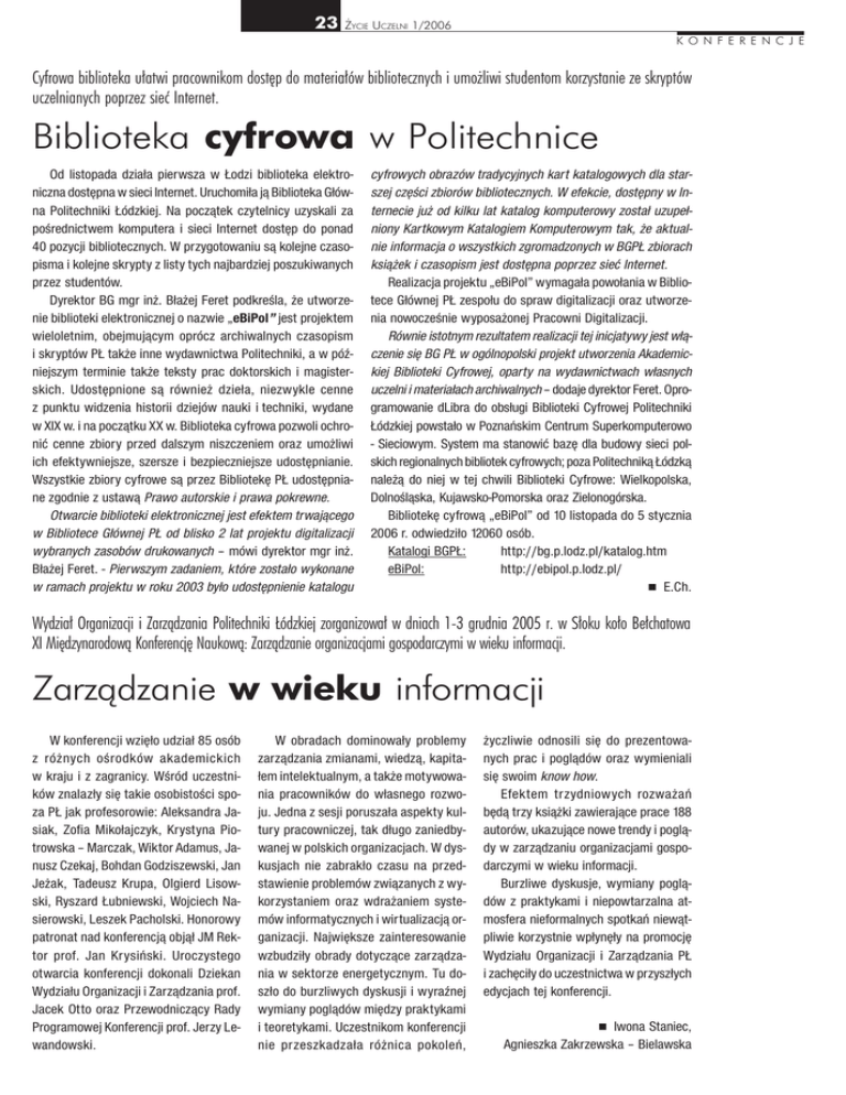 23 ŻYCIE UCZELNI 1/2006 K O N F E R E N C J E Cyfrowa biblioteka ułatwi pracownikom dostęp do materiałów bibliotecznych i umożliwi studentom korzystanie ze skryptów uczelnianych poprzez sieć Internet. Biblioteka cyfrowa w Politechnice Od listopada dzia³a pierwsza w £odzi biblioteka elektroniczna dostêpna w sieci Internet. Uruchomi³a j¹ Biblioteka G³ówna Politechniki £ódzkiej. Na pocz¹tek czytelnicy uzyskali za poœrednictwem komputera i sieci Internet dostêp do ponad 40 pozycji bibliotecznych. W przygotowaniu s¹ kolejne czasopisma i kolejne skrypty z listy tych najbardziej poszukiwanych przez studentów. Dyrektor BG mgr in¿. B³a¿ej Feret podkreœla, ¿e utworzenie biblioteki elektronicznej o nazwie „eBiPol” jest projektem wieloletnim, obejmuj¹cym oprócz archiwalnych czasopism i skryptów P£ tak¿e inne wydawnictwa Politechniki, a w póŸniejszym terminie tak¿e teksty prac doktorskich i magisterskich. Udostêpnione s¹ równie¿ dzie³a, niezwykle cenne z punktu widzenia historii dziejów nauki i techniki, wydane w XIX w. i na pocz¹tku XX w. Biblioteka cyfrowa pozwoli ochroniæ cenne zbiory przed dalszym niszczeniem oraz umo¿liwi ich efektywniejsze, szersze i bezpieczniejsze udostêpnianie. Wszystkie zbiory cyfrowe s¹ przez Bibliotekê P£ udostêpniane zgodnie z ustaw¹ Prawo autorskie i prawa pokrewne. Otwarcie biblioteki elektronicznej jest efektem trwaj¹cego w Bibliotece G³ównej P£ od blisko 2 lat projektu digitalizacji wybranych zasobów drukowanych – mówi dyrektor mgr in¿. B³a¿ej Feret. - Pierwszym zadaniem, które zosta³o wykonane w ramach projektu w roku 2003 by³o udostêpnienie katalogu cyfrowych obrazów tradycyjnych kart katalogowych dla starszej czêœci zbiorów bibliotecznych. W efekcie, dostêpny w Internecie ju¿ od kilku lat katalog komputerowy zosta³ uzupe³niony Kartkowym Katalogiem Komputerowym tak, ¿e aktualnie informacja o wszystkich zgromadzonych w BGP£ zbiorach ksi¹¿ek i czasopism jest dostêpna poprzez sieæ Internet. Realizacja projektu „eBiPol” wymaga³a powo³ania w Bibliotece G³ównej P£ zespo³u do spraw digitalizacji oraz utworzenia nowoczeœnie wyposa¿onej Pracowni Digitalizacji. Równie istotnym rezultatem realizacji tej inicjatywy jest w³¹czenie siê BG P£ w ogólnopolski projekt utworzenia Akademickiej Biblioteki Cyfrowej, oparty na wydawnictwach w³asnych uczelni i materia³ach archiwalnych – dodaje dyrektor Feret. Oprogramowanie dLibra do obs³ugi Biblioteki Cyfrowej Politechniki £ódzkiej powsta³o w Poznañskim Centrum Superkomputerowo - Sieciowym. System ma stanowiæ bazê dla budowy sieci polskich regionalnych bibliotek cyfrowych; poza Politechnik¹ £ódzk¹ nale¿¹ do niej w tej chwili Biblioteki Cyfrowe: Wielkopolska, Dolnoœl¹ska, Kujawsko-Pomorska oraz Zielonogórska. Bibliotekê cyfrow¹ „eBiPol” od 10 listopada do 5 stycznia 2006 r. odwiedzi³o 12060 osób. Katalogi BGP£: http://bg.p.lodz.pl/katalog.htm eBiPol: http://ebipol.p.lodz.pl/ n E.Ch. Wydział Organizacji i Zarządzania Politechniki Łódzkiej zorganizował w dniach 1-3 grudnia 2005 r. w Słoku koło Bełchatowa XI Międzynarodową Konferencję Naukową: Zarządzanie organizacjami gospodarczymi w wieku informacji. Zarządzanie w wieku informacji W konferencji wziê³o udzia³ 85 osób z ró¿nych oœrodków akademickich w kraju i z zagranicy. Wœród uczestników znalaz³y siê takie osobistoœci spoza P£ jak profesorowie: Aleksandra Jasiak, Zofia Miko³ajczyk, Krystyna Piotrowska – Marczak, Wiktor Adamus, Janusz Czekaj, Bohdan Godziszewski, Jan Je¿ak, Tadeusz Krupa, Olgierd Lisowski, Ryszard £ubniewski, Wojciech Nasierowski, Leszek Pacholski. Honorowy patronat nad konferencj¹ obj¹³ JM Rektor prof. Jan Krysiñski. Uroczystego otwarcia konferencji dokonali Dziekan Wydzia³u Organizacji i Zarz¹dzania prof. Jacek Otto oraz Przewodnicz¹cy Rady Programowej Konferencji prof. Jerzy Lewandowski. W obradach dominowa³y problemy zarz¹dzania zmianami, wiedz¹, kapita³em intelektualnym, a tak¿e motywowania pracowników do w³asnego rozwoju. Jedna z sesji porusza³a aspekty kultury pracowniczej, tak d³ugo zaniedbywanej w polskich organizacjach. W dyskusjach nie zabrak³o czasu na przedstawienie problemów zwi¹zanych z wykorzystaniem oraz wdra¿aniem systemów informatycznych i wirtualizacj¹ organizacji. Najwiêksze zainteresowanie wzbudzi³y obrady dotycz¹ce zarz¹dzania w sektorze energetycznym. Tu dosz³o do burzliwych dyskusji i wyraŸnej wymiany pogl¹dów miêdzy praktykami i teoretykami. Uczestnikom konferencji nie przeszkadza³a ró¿nica pokoleñ, ¿yczliwie odnosili siê do prezentowanych prac i pogl¹dów oraz wymieniali siê swoim know how. Efektem trzydniowych rozwa¿añ bêd¹ trzy ksi¹¿ki zawieraj¹ce prace 188 autorów, ukazuj¹ce nowe trendy i pogl¹dy w zarz¹dzaniu organizacjami gospodarczymi w wieku informacji. Burzliwe dyskusje, wymiany pogl¹dów z praktykami i niepowtarzalna atmosfera nieformalnych spotkañ niew¹tpliwie korzystnie wp³ynê³y na promocjê Wydzia³u Organizacji i Zarz¹dzania P£ i zachêci³y do uczestnictwa w przysz³ych edycjach tej konferencji. Iwona Staniec, Agnieszka Zakrzewska – Bielawska n