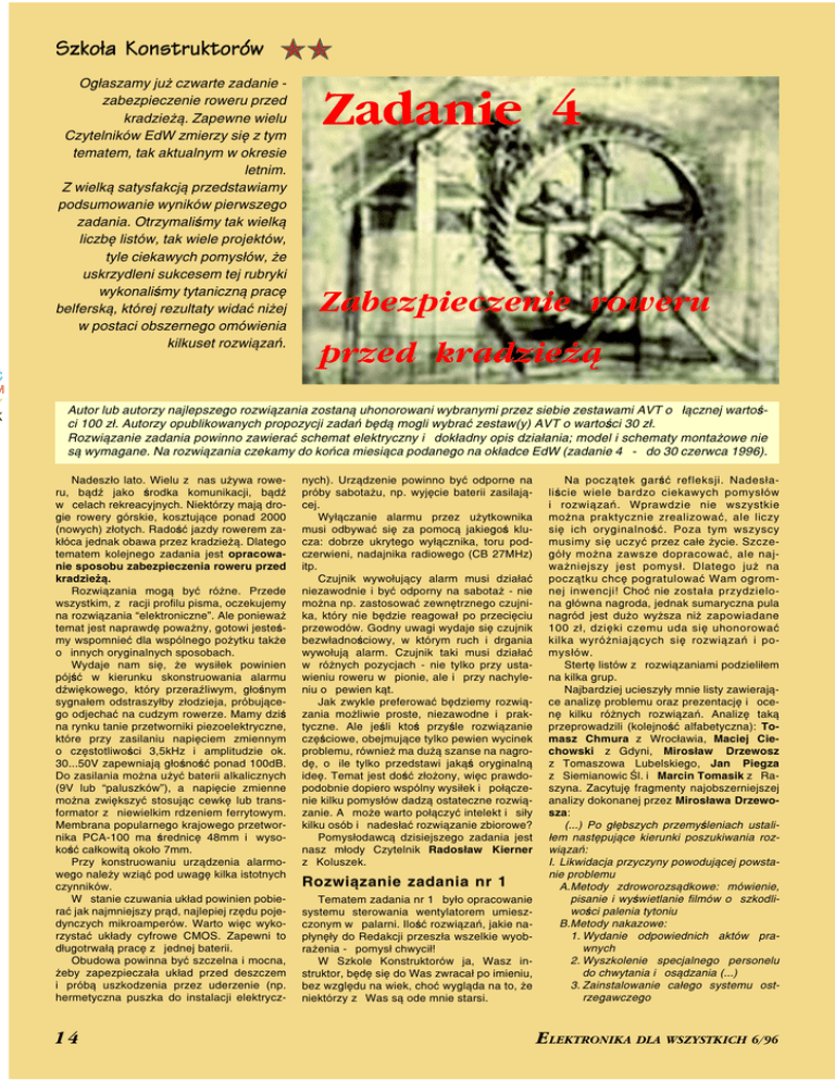 Szkoła Konstruktorów Ogłaszamy już czwarte zadanie − zabezpieczenie roweru przed kradzieżą. Zapewne wielu Czytelników EdW zmierzy się z tym tematem, tak aktualnym w okresie letnim. Z wielką satysfakcją przedstawiamy podsumowanie wyników pierwszego zadania. Otrzymaliśmy tak wielką liczbę listów, tak wiele projektów, tyle ciekawych pomysłów, że uskrzydleni sukcesem tej rubryki wykonaliśmy tytaniczną pracę belferską, której rezultaty widać niżej w postaci obszernego omówienia kilkuset rozwiązań. Zadanie 4 Zabezpieczenie roweru przed kradzieżą Autor lub autorzy najlepszego rozwiązania zostaną uhonorowani wybranymi przez siebie zestawami AVT o łącznej wartoś− ci 100 zł. Autorzy opublikowanych propozycji zadań będą mogli wybrać zestaw(y) AVT o wartości 30 zł. Rozwiązanie zadania powinno zawierać schemat elektryczny i dokładny opis działania; model i schematy montażowe nie są wymagane. Na rozwiązania czekamy do końca miesiąca podanego na okładce EdW (zadanie 4 − do 30 czerwca 1996). Nadeszło lato. Wielu z nas używa rowe− ru, bądź jako środka komunikacji, bądź w celach rekreacyjnych. Niektórzy mają dro− gie rowery górskie, kosztujące ponad 2000 (nowych) złotych. Radość jazdy rowerem za− kłóca jednak obawa przez kradzieżą. Dlatego tematem kolejnego zadania jest opracowa− nie sposobu zabezpieczenia roweru przed kradzieżą. Rozwiązania mogą być różne. Przede wszystkim, z racji profilu pisma, oczekujemy na rozwiązania “elektroniczne”. Ale ponieważ temat jest naprawdę poważny, gotowi jesteś− my wspomnieć dla wspólnego pożytku także o innych oryginalnych sposobach. Wydaje nam się, że wysiłek powinien pójść w kierunku skonstruowania alarmu dźwiękowego, który przeraźliwym, głośnym sygnałem odstraszyłby złodzieja, próbujące− go odjechać na cudzym rowerze. Mamy dziś na rynku tanie przetworniki piezoelektryczne, które przy zasilaniu napięciem zmiennym o częstotliwości 3,5kHz i amplitudzie ok. 30...50V zapewniają głośność ponad 100dB. Do zasilania można użyć baterii alkalicznych (9V lub “paluszków”), a napięcie zmienne można zwiększyć stosując cewkę lub trans− formator z niewielkim rdzeniem ferrytowym. Membrana popularnego krajowego przetwor− nika PCA−100 ma średnicę 48mm i wyso− kość całkowitą około 7mm. Przy konstruowaniu urządzenia alarmo− wego należy wziąć pod uwagę kilka istotnych czynników. W stanie czuwania układ powinien pobie− rać jak najmniejszy prąd, najlepiej rzędu poje− dynczych mikroamperów. Warto więc wyko− rzystać układy cyfrowe CMOS. Zapewni to długotrwałą pracę z jednej baterii. Obudowa powinna być szczelna i mocna, żeby zapezpieczała układ przed deszczem i próbą uszkodzenia przez uderzenie (np. hermetyczna puszka do instalacji elektrycz− 14 nych). Urządzenie powinno być odporne na próby sabotażu, np. wyjęcie baterii zasilają− cej. Wyłączanie alarmu przez użytkownika musi odbywać się za pomocą jakiegoś klu− cza: dobrze ukrytego wyłącznika, toru pod− czerwieni, nadajnika radiowego (CB 27MHz) itp. Czujnik wywołujący alarm musi działać niezawodnie i być odporny na sabotaż − nie można np. zastosować zewnętrznego czujni− ka, który nie będzie reagował po przecięciu przewodów. Godny uwagi wydaje się czujnik bezwładnościowy, w którym ruch i drgania wywołują alarm. Czujnik taki musi działać w różnych pozycjach − nie tylko przy usta− wieniu roweru w pionie, ale i przy nachyle− niu o pewien kąt. Jak zwykle preferować będziemy rozwią− zania możliwie proste, niezawodne i prak− tyczne. Ale jeśli ktoś przyśle rozwiązanie częściowe, obejmujące tylko pewien wycinek problemu, również ma dużą szanse na nagro− dę, o ile tylko przedstawi jakąś oryginalną ideę. Temat jest dość złożony, więc prawdo− podobnie dopiero wspólny wysiłek i połącze− nie kilku pomysłów dadzą ostateczne rozwią− zanie. A może warto połączyć intelekt i siły kilku osób i nadesłać rozwiązanie zbiorowe? Pomysłodawcą dzisiejszego zadania jest nasz młody Czytelnik Radosław Kierner z Koluszek. Rozwiązanie zadania nr 1 Tematem zadania nr 1 było opracowanie systemu sterowania wentylatorem umiesz− czonym w palarni. Ilość rozwiązań, jakie na− płynęły do Redakcji przeszła wszelkie wyob− rażenia − pomysł chwycił! W Szkole Konstruktorów ja, Wasz in− struktor, będę się do Was zwracał po imieniu, bez względu na wiek, choć wygląda na to, że niektórzy z Was są ode mnie starsi. Na początek garść refleksji. Nadesła− liście wiele bardzo ciekawych pomysłów i rozwiązań. Wprawdzie nie wszystkie można praktycznie zrealizować, ale liczy się ich oryginalność. Poza tym wszyscy musimy się uczyć przez całe życie. Szcze− góły można zawsze dopracować, ale naj− ważniejszy jest pomysł. Dlatego już na początku chcę pogratulować Wam ogrom− nej inwencji! Choć nie została przydzielo− na główna nagroda, jednak sumaryczna pula nagród jest dużo wyższa niż zapowiadane 100 zł, dzięki czemu uda się uhonorować kilka wyróżniających się rozwiązań i po− mysłów. Stertę listów z rozwiązaniami podzieliłem na kilka grup. Najbardziej ucieszyły mnie listy zawierają− ce analizę problemu oraz prezentację i oce− nę kilku różnych rozwiązań. Analizę taką przeprowadzili (kolejność alfabetyczna): To− masz Chmura z Wrocławia, Maciej Cie− chowski z Gdyni, Mirosław Drzewosz z Tomaszowa Lubelskiego, Jan Piegza z Siemianowic Śl. i Marcin Tomasik z Ra− szyna. Zacytuję fragmenty najobszerniejszej analizy dokonanej przez Mirosława Drzewo− sza: (...) Po głębszych przemyśleniach ustali− łem następujące kierunki poszukiwania roz− wiązań: I. Likwidacja przyczyny powodującej powsta− nie problemu A.Metody zdroworozsądkowe: mówienie, pisanie i wyświetlanie filmó