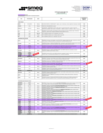 Dom Bianco Sp. z o.o. Al.. Krakowska 5, 05-090 Raszyn tel.022 720 11 98 ÷ 99 tel.kom. 603 242 646 fax: 022 720 06 88 [email protected] www.dombianco.pl CENNIK DETALICZNY SMEG 2009 ważny od 04.05.2009 aktualizacja na dzień 01.07.2009 Nowości Promocje ważne do wyczerpania zapasów KOD WYKOŃCZENIE SZER. OPIS SUGEROWANA CENA DET. BRUTTO PIANO DESIGN SDP20 STAL/SZKŁO 73,6 cm SZKLARNIA DOMOWA, 3 MIKROKLIMATY: wilgotny, suchy i umiarkowany, sensory wilgotności, temperatury i światła 7 499 STAL 73,6 cm PODSTAWA Z OBCIĄŻNIKAMI do szklarni 2 199 A,B,R,G,P 59,5 cm CHŁODZIARKO - ZAMRAŻARKA, KLASA A, WYS. 187,5 cm, pojemność brutto 351L, wnętrze ze stali 18/10, elektroniczny wyświetlacz i alarm, klasa A, 5 KOLORÓW: A - błękitny, B -granat, R - wiśniowy, G - żółty, P - kremowy 25 649 STAL 60 cm PIEKARNIK 10 funkcyjny (ECO) z termoobiegiem, funkcja rozmrażania, stal 10/10, analogowy zegar, mechaniczny programator, wnętrze ze stali, halogenowe oświetlenie wnętrza piekarnika, klasa A 8 099 P-SDP20 FPD34_D-1 F67-7 P106 STAL 100,5 cm PŁYTA GAZOWA 6 palników w tym 2 ultraszybkie o mocy 3,6 kW 6 249 P705 STAL 72 cm PŁYTA GAZOWA 5 palników w tym 1 środkowy szybki o mocy 3 kW 4 399 P64 STAL 60 cm PŁYTA GAZOWA 4 palniki w tym 1 ultraszybki o mocy 3 kW 3 649 SC170 STAL 60 cm PIEKARNIK 10 funkcyjny z termoobiegiem, seria EVOLUTION, analogowy elektroniczny zegar i programator, potrójnie szklone drzwiczki, wyjmowane szyby wew., błyszcząca stal z powłoką antyśladową, klasa A 5 349 SC166PZ STAL 60 cm PIEKARNIK 8 funkcyjny z FUNKCJĄ PIECZENIA PIZZY i z akcesoriami, seria EVOLUTION, potrójnie szklone drzwiczki, wyjmowane szyby wew., mechaniczny programator, błyszcząca stal z powłoką antyśladową, klasa A 4 749 SC115A GRAFIT 60 cm PIEKARNIK 10 funkcyjny (ECO) z termoobiegiem, seria LINEAR MAXI (poj.68l), sterowanie "touch control", zabezpieczenie przed dziećmi, 5 poziomów gotowania, 3 elektroniczne wyświetlacze (na biało), elektroniczny programator, 9 przepisów + 1 pamięć, tzw."zimne", szklone drzwiczki, prowadnice teleskopowe, klasa A 5 699 PIEKARNIKI ELEKTRYCZNE SC115 SREBRNY SC115X STAL SC106PZ2 STAL 60 cm PIEKARNIK 8 funkcyjny z FUNKCJĄ PIECZENIA PIZZY, seria LINEAR, elektroniczny wyświetlacz (na biało) i programator, podwójnie szklone drzwiczki, klasa A 4 399 SC106-2 SC106SG2 SC106NE2 SC106EB2 SC106A2 STAL SREBRNY CZARNY BIAŁY GRAFIT 60 cm PIEKARNIK 8 funkcyjny (ECO), seria LINEAR, elektroniczny wyświetlacz (na biało) i programator, podwójnie szklone drzwiczki, klasa A, na zamówienie płyty katalityczne 3797 i prowadnice teleskopowe 3 949 90 cm PIEKARNIK 10 funkcyjny z termoobiegiem, seria CLASSIC, podwójnie szklone drzwiczki, obniżona WYS. 48cm, rożen, elektroniczny programator, klasa A, na zamówienie prowadnice teleskopowe GT90X 6 499 90 cm PIEKARNIK 10 funkcyjny Z TOSTEREM I FUNKCJĄ PIECZENIA PIZZY, seria CLASSIC, potrójnie szklone drzwiczki, obniżona WYS. 48cm, rożen, mechaniczny programator, klasa A 8 799 60 cm PIEKARNIK 8 funkcyjny z termoobiegiem, seria CLASSIC, potrójnie szklone drzwiczki, analogowy elektroniczny zegar i programator, powłoka antyśladowa, klasa A,chowane pokrętła 4 499 60 cm PIEKARNIK 8 funkcyjny z termoobiegiem, seria CLASSIC, potrójnie szklone drzwiczki, analogowy elektroniczny zegar i programator, powłoka antyśladowa, klasa A 3 799 60 cm PIEKARNIK 7 funkcyjny (ECO), seria CLASSIC, podwójnie szklone drzwiczki, mechaniczny programator, powłoka antyśladowa, klasa A, na zamówienie płyty katalityczne 3797 SC 106 SE20XMFR7 SE995XT-7 SC99X SC399X SC381X PROMOCJA! STAL STAL STAL STAL STAL SC 381X PROMOCJA! SC381XPZ STAL S201X S302X STAL STAL 2 999 3 199 2 249 60 cm PIEKARNIK 8 funkcyjny Z FUNKCJĄ PIECZENIA PIZZY, seria CLASSIC, potrójnie szklone drzwiczki, mechaniczny programator, powłoka antyśladowa, klasa A 3 649 60 cm PIEKARNIK 8 funkcyjny Z MIKROFALĄ, termoobieg, seria CLASSIC, potrójnie szklone drzwiczki, mechaniczny programator, klasa A 8 199 60 cm PIEKARNIK 8 funkcyjny Z FUNKCJĄ GOTOWANIA NA PARZE, termoobieg, seria CLASSIC, potrójnie szklone drzwiczki, mechaniczny programator, klasa A, na zamówienie prowadnice teleskopowe GT123DX, GT13X 6 949 90 cm PIEKARNIK 7 funkcyjny (rożen, rozmrażanie),ZŁOCONE WYKOŃCZENIA, podwójnie szklone drzwiczki, obniżona WYS 48cm, analogowy zegar, mechaniczny programator, klasa B, na zamówienie płyty katalityczne KITPC97 4 699 5 099 PIEKARNIKI ELEKTRYCZNE “RETRO” S890AMFR7 GRAFIT S890PMFR7 KREM ŻELIWNY 90 cm PIEKARNIK 7 funkcyjny z termoobiegiem,ZŁOCONE WYKOŃCZENIA, potrójnie szklone drzwiczki, analogowy zegar, mechaniczny programator, klasa B, na zamówienie płyty katalityczne KITPC97 SO66CCS-5 KREM 60 cm PIEKARNIK 8 funkcyjny z termoobiegiem,SREBRNE WYKOŃCZENIA, potrójnie szklone drzwiczki, analogowy zegar, mechaniczny programator, klasa A 3 999 SI850APZ5 3 999 S890MF-7 GRAFIT 60 cm PIEKARNIK 8 funkcyjny Z FUNKCJĄ PIECZENIA PIZZY,SREBRNE WYKOŃCZENIA, wypukłe, potrójnie szklone drzwiczki, analogowy zegar, mechaniczny programatorem, klasa A SI850X-5 STAL 60 cm PIEKARNIK 7 funkcyjny (ECO), SREBRNE WYKOŃCZENIA, wypukłe, potrójnie szklone drzwiczki, analogowy zegar, mechaniczny programator, klasa A SI850A-5 GRAFIT 60 cm PIEKARNIK 7 funkcyjny (ECO), SREBRNE WYKOŃCZENIA, wypukłe, potrójnie szklone drzwiczki, analogowy zegar, mechaniczny programator, klasa A SI850RA-5 MIEDŹ 60 cm PIEKARNIK 7 funkcyjny (ECO), MIEDZIANE WYKOŃCZENIA, wypukłe, potrójnie szklone drzwiczki, analogowy zegar z mechanicznym programatorem 3 549 KREM 60 cm PIEKARNIK 7 funkcyjny (ECO), ZŁOCONE WYKOŃCZENIA, wypukłe, potrójnie szklone drzwiczki, analogowy zegar, mechaniczny programator, klasa A 3 549 SI850P-5 3 549 BEŻOWY 60 cm PIEKARNIK 7 funkcyjny (ECO), MOSIĘŻNE WYKOŃCZENIA,wypukłe, potrójnie szklone drzwiczki, analogowy zegar, mechaniczny programator, klasa A 3 549 FP850A FP850P FP850X GRAFIT KREM STAL 60 cm PIEKARNIK 10 funkcyjny z PIROLIZĄ, SREBRNE WYKOŃ