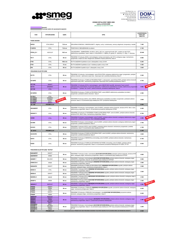 CENNIK DETALICZNY SMEG 2009 ważny od 04.05