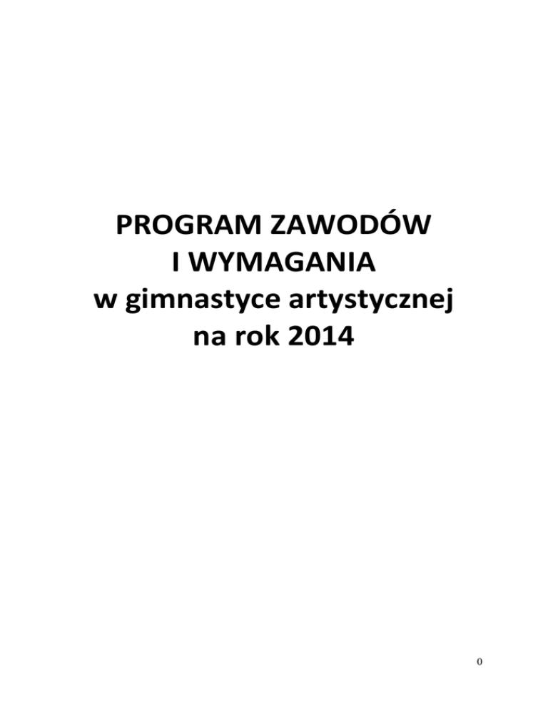 PROGRAM ZAWODÓW I WYMAGANIA w gimnastyce artystycznej na rok 2014 0 SPRAWY ORGANIZACYJNE I. Założenia ogólne regulaminu zawodów Wszystkie zawody z kalendarza imprez odbywają się pod egidą PZG i muszą być przeprowadzone zgodnie z regulaminem PZG oraz FIG i UEG 1.Organizator Współorganizatorem zawodów jest Polski Związek Gimnastyczny, który zleca organizowanie imprezy Okręgowemu Związkowi Gimnastycznemu, klubowi sportowemu lub innej organizacji na terenie której, odbędą się zawody w gimnastyce artystycznej 2.Termin i miejsce zawodów Zgodnie z kalendarzem imprez lub komunikatem PZG -na miesiąc przed zawodami organizator wysyła do klubów i OZG „Komunikat nr I” zawierający informację o terminie zawodów i cenie noclegów i regulamin zawodów. -organizator zawodów ma obowiązek podać do wiadomości PZG i zainteresowanych klubów godzinę rozpoczęcia i zakończenia zawodów oraz czas i miejsce odpraw komisji (mandatowej, technicznej i sędziowskiej) na 14 dni przed terminem zawodów. 3. Program Zgodnie z programem zawodów na rok 2014 Karty opisów układów zawodniczek, muszą być wykonane na komputerze. 4.Zgłoszenia -zamówienia miejsc noclegowych kluby przesyłają na adres organizatora na 1 miesiąc przed terminem zawodów podając przybliżoną godzinę przyjazdu -imienne zgłoszenie do zawodów należy przesłać na adres organizatora w terminie 15 dni przed zawodami Nieterminowe zgłoszenie do zawodów miejscowy organizator ma prawo wykorzystać do pobrania kary w wysokości 50 zł 5. Udział w zawodach a) prawo startu w zawodach mają zawodniczki, które: -są członkiniami klubu zgłoszonego do PZG lub mają specjalne zezwolenie PZG -posiadają aktualne badania lekarskie -legitymują się ważną licencją zawodnika, z potwierdzeniem przynależności klubowej -posiadają ważną, odpowiednią dla danych zawodów, klasę sportową -nie są objęte karencją 1 -dostarczą podczas trwania komisji mandatowej po 4 egzemplarze tabel Trudności dla każdego układu -są ubezpieczone na czas trwania zawodów od następstw nieszczęśliwych wypadków i przedstawią dowód ubezpieczenia NW b) prawo startu w zawodach centralnych poza konkursem mają zawodniczki: -w klasie I i mistrzowskiej bez ograniczeń, dla zdobycia klasy -w klasach niższych max. 2 ze strony organizatora. - powołane decyzją PZG pod warunkiem, że spełniają również powyższe wymagania. Zawodniczki z obcym obywatelstwem – w zawodach objętych systemem sportu młodzieżowego mogą brać udział zawodniczki z Unii Europejskiej według regulaminu wydanego przez Ministerstwo Sportu i Turystyki na 2013 rok. W pozostałych zawodach z kalendarza imprez PZG mogą startować na zasadach i warunkach określonych powyżej w punkcie 5 a), jeżeli -posiadają ważną, odpowiednią dla danych zawodów, klasę sportową potwierdzoną w Polsce. 6. Nagrody Podczas Mistrzostwa Polski: indywidualnych, drużynowych, w układach zespołowych zarówno w wieloboju jak i w finałach przyznawane będą następujące nagrody: miejsca 1-3 medale, dyplomy miejsca 4-8 dyplomy W przypadkach innych zawodów – dyplomy za miejsca 1-8 w wieloboju. 7. Zasady finansowania -koszty organizacji zawodów pokrywa PZG lub inny organizator (klub, OZG, zainteresowana instytucja) W przypadku zawodów rangi Mistrzostw Polski dotacja otrzymana z PZG powinna być w pierwszej kolejności przeznaczona na opłacenie kosztów sędziowskich określonych w powołaniu sędzin -koszt uczestnictwa w zawodach: zawodniczek, trenerów i osób towarzyszących pokrywa klub Organizator ma obowiązek w ciągu 14 dni od zakończenia zawodów przesłać do PZG rozliczenie z otrzymanych środków! W przypadku nie wywiązywania się z tego obowiązku może być pozbawiony możliwości organizowania imprez finansowanych przez PZG. 8. Sprawozdawczość Sprawozdanie z zawodów/każdych z kalendarza imprez PZG/ wraz z podpisanym komunikatem końcowym sędzia główny zawodów zobowiązany jest przesłać do PZG w terminie 14 dni od daty zakończenia zawodów. Sprawozdanie przesyłamy na formularzu „Sprawozdanie sędziego głównego”. UWAGA: Organizator ma obowiązek przechowywać wszystkie protokoły sędziowskie przez miesiąc po zakończeniu zawodów 2 9. Zakres obowiązków osób pełniących wybrane funkcje na zawodach Kierownik zawodów Kierownik zawodów jest odpowiedzialny za całokształt prac związanych z przygotowaniem, przeprowadzeniem i zakończeniem zawodów. - Zabezpiecza salę: pole ćwiczeń i miejsce do rozgrzewki oraz radiofonizację, odpowiednie oświetlenie i temperaturę, szatnie. - Zabezpiecza miejsce pracy dla komisji sędziowskiej z dala od publiczności - Zapewnia miejsce na zebrania komisji sędziowskiej i technicznej. - Zabezpiecza zakwaterowanie uczestnikom zawodów. - Zapewnia opiekę lekarską w czasie próby planszy i podczas zawodów - Przygotowuje materiały obowiązujące na zawodach. - Wysyła komunikaty do klubów, PZG, OZG. Organizator zawodów ma obowiązek podawać w komunikacie końcowym wszystkie oceny cząstkowe. Sędzia główny Sędzia główny jest odpowiedzialny za przygotowanie i przeprowadzenie zawodów zgodnie z ustalonym regulaminem zawodów i niniejszymi założeniami. Jego orzeczenia w tych sprawach są ostateczne. Sędzia główny ma prawo wstrzymać zawody lub zarządzić chwilowa przerwę, jeżeli miejsce zawodów z jakichkolwiek przyczyn stanie się nieodpowiednie. Podczas zawodów sędzia główny nie może pełnić jednocześnie innej funkcji lub zajmować się sprawami organizacyjnymi. Ma obowiązek być obecnym na sali podczas trwania całych zawodów Obowiązki: opracowanie programu minutowego zawodów przeprowadzenie losowania kolejności startu NA NAZWISKO, na jednakowych kartkach/nośnikach numerów startowych/ zatwierdzenie porządku organizacyjnego zawodów sprawdzenie przygotowania obiektu do zawodów przeprowadzenie odprawy technicznej przeprowadzenie odprawy sędziowskiej: sprawdz