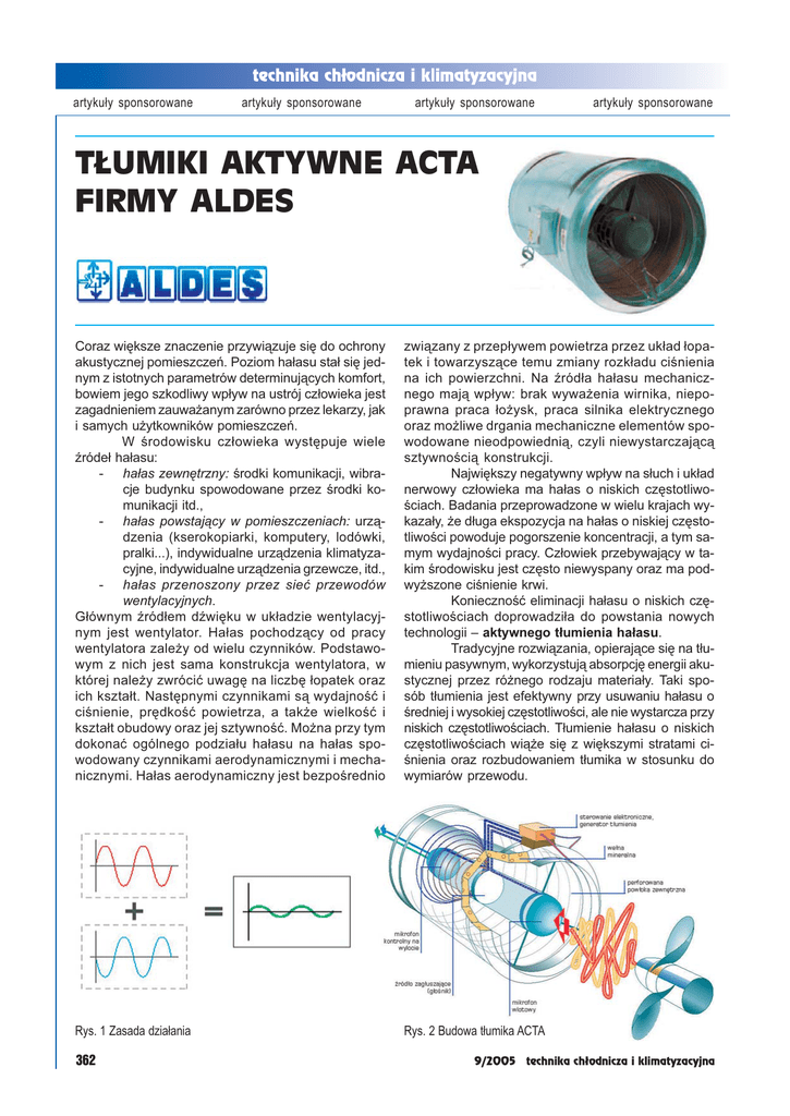 artykuły sponsorowane artykuły sponsorowane artykuły sponsorowane artykuły sponsorowane TŁUMIKI AKTYWNE ACTA FIRMY ALDES Coraz wiêksze znaczenie przywi¹zuje siê do ochrony akustycznej pomieszczeñ. Poziom ha³asu sta³ siê jednym z istotnych parametrów determinuj¹cych komfort, bowiem jego szkodliwy wp³yw na ustrój cz³owieka jest zagadnieniem zauwa¿anym zarówno przez lekarzy, jak i samych u¿ytkowników pomieszczeñ. W œrodowisku cz³owieka wystêpuje wiele Ÿróde³ ha³asu: - ha³as zewnêtrzny: œrodki komunikacji, wibracje budynku spowodowane przez œrodki komunikacji itd., - ha³as powstaj¹cy w pomieszczeniach: urz¹dzenia (kserokopiarki, komputery, lodówki, pralki...), indywidualne urz¹dzenia klimatyzacyjne, indywidualne urz¹dzenia grzewcze, itd., - ha³as przenoszony przez sieæ przewodów wentylacyjnych. G³ównym Ÿród³em dŸwiêku w uk³adzie wentylacyjnym jest wentylator. Ha³as pochodz¹cy od pracy wentylatora zale¿y od wielu czynników. Podstawowym z nich jest sama konstrukcja wentylatora, w której nale¿y zwróciæ uwagê na liczbê ³opatek oraz ich kszta³t. Nastêpnymi czynnikami s¹ wydajnoœæ i ciœnienie, prêdkoœæ powietrza, a tak¿e wielkoœæ i kszta³t obudowy oraz jej sztywnoœæ. Mo¿na przy tym dokonaæ ogólnego podzia³u ha³asu na ha³as spowodowany czynnikami aerodynamicznymi i mechanicznymi. Ha³as aerodynamiczny jest bezpoœrednio zwi¹zany z przep³ywem powietrza przez uk³ad ³opatek i towarzysz¹ce temu zmiany rozk³adu ciœnienia na ich powierzchni. Na Ÿród³a ha³asu mechanicznego maj¹ wp³yw: brak wywa¿enia wirnika, niepoprawna praca ³o¿ysk, praca silnika elektrycznego oraz mo¿liwe drgania mechaniczne elementów spowodowane nieodpowiedni¹, czyli niewystarczaj¹c¹ sztywnoœci¹ konstrukcji. Najwiêkszy negatywny wp³yw na s³uch i uk³ad nerwowy cz³owieka ma ha³as o niskich czêstotliwoœciach. Badania przeprowadzone w wielu krajach wykaza³y, ¿e d³uga ekspozycja na ha³as o niskiej czêstotliwoœci powoduje pogorszenie koncentracji, a tym samym wydajnoœci pracy. Cz³owiek przebywaj¹cy w takim œrodowisku jest czêsto niewyspany oraz ma podwy¿szone ciœnienie krwi. Koniecznoœæ eliminacji ha³asu o niskich czêstotliwoœciach doprowadzi³a do powstania nowych technologii – aktywnego t³umienia ha³asu. Tradycyjne rozwi¹zania, opieraj¹ce siê na t³umieniu pasywnym, wykorzystuj¹ absorpcjê energii akustycznej przez ró¿nego rodzaju materia³y. Taki sposób t³umienia jest efektywny przy usuwaniu ha³asu o œredniej i wysokiej czêstotliwoœci, ale nie wystarcza przy niskich czêstotliwoœciach. T³umienie ha³asu o niskich czêstotliwoœciach wi¹¿e siê z wiêkszymi stratami ciœnienia oraz rozbudowaniem t³umika w stosunku do wymiarów przewodu. Rys. 1 Zasada działania Rys. 2 Budowa tłumika ACTA 362 9/2005 technika ch³odnicza i klimatyzacyjna artykuły sponsorowane artykuły sponsorowane Rys. 3 Porównanie skuteczności tłumienia różnych tłumików T³umik ACTA firmy ALDES zapewnia bardzo dobre t³umienie w ca³ym paœmie przy niewielkich stratach ciœnienia oraz wymiarach t³umika. W t³umikach aktywnych ACTA zastosowano dwa rodzaje t³umienia dŸwiêków: pasywny czyli absorpcja przez materia³ izolacyjny i aktywny dla niskich czêstotliwoœci. Aktywne t³umienie ha³asu polega na emitowaniu fali dŸwiêkowej przesuniêtej w fazie w stosunku do fali ha³asu. Efektem jest redukcja ha³asu co pokazano schematycznie na rys. 1. technika ch³odnicza i klimatyzacyjna 9/2005 artykuły sponsorowane artykuły sponsorowane Jest to realizowane przy pomocy dwóch mikrofonów, g³oœnika oraz sterownika elektronicznego ³¹cz¹cego wszystkie trzy elementy. Ha³as, który pojawia siê w przewodzie, jest odbierany przez mikrofon wlotowy (lokalizowany w pobli¿u wentylatora) i przekazywany do sterownika. Po przeanalizowaniu sygna³u, do g³oœnika wysy³ana jest fala dŸwiêkowa przesuniêta w fazie. G³oœnik emituje falê, co powoduje redukcjê ha³asu. Mikrofon kontrolny przekazuje falê st³umion¹ do sterownika, aby nanieœæ ewentualne poprawki dla nastêpnej fali. Po³¹czenie technologii aktywnego i pasywnego t³umienia dŸwiêku sprawia, ¿e ACTA jest szczególnie efektywny w procesie t³umienia dŸwiêków (rys.3). Niewielkie straty ciœnienia przy przep³ywie powietrza powoduj¹, ¿e ACTA mo¿e byæ zainstalowany w istniej¹cej instalacji wentylacyjnej. Dodatkowo „samoadaptacja” do aktualnych warunków t³umika sprawia, ¿e jest on doskonale przystosowany do instalacji ze zmiennymi strumieniami powietrza. Na rynku polskim wy³¹cznym przedstawicielem firmy ALDES jest aereco wentylacja sp. z o.o. Jacek ARENDT aereco wentylacja Sp. z o.o. 363