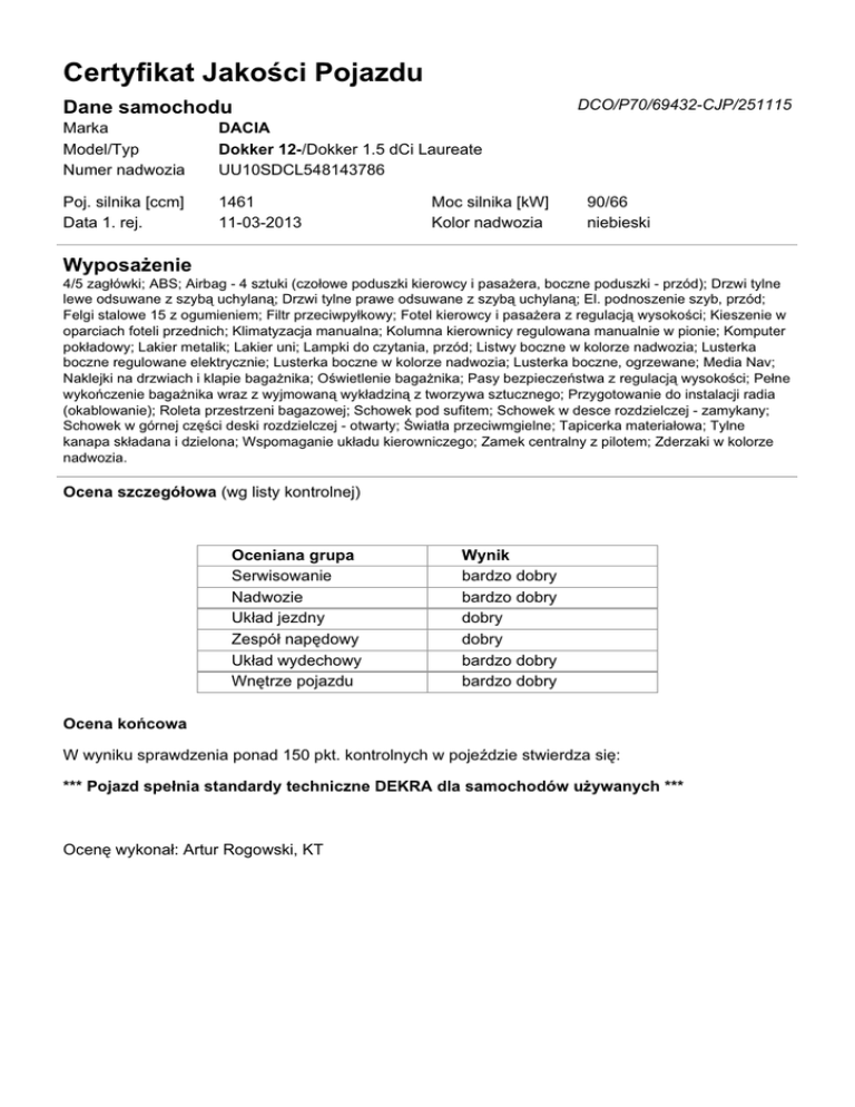 Certyfikat Jakości Pojazdu DCO/P70/69432-CJP/251115 Dane samochodu Marka Model/Typ Numer nadwozia DACIA Dokker 12-/Dokker 1.5 dCi Laureate UU10SDCL548143786 Poj. silnika [ccm] Data 1. rej. 1461 11-03-2013 Moc silnika [kW] Kolor nadwozia 90/66 niebieski Wyposażenie 4/5 zagłówki; ABS; Airbag - 4 sztuki (czołowe poduszki kierowcy i pasażera, boczne poduszki - przód); Drzwi tylne lewe odsuwane z szybą uchylaną; Drzwi tylne prawe odsuwane z szybą uchylaną; El. podnoszenie szyb, przód; Felgi stalowe 15 z ogumieniem; Filtr przeciwpyłkowy; Fotel kierowcy i pasażera z regulacją wysokości; Kieszenie w oparciach foteli przednich; Klimatyzacja manualna; Kolumna kierownicy regulowana manualnie w pionie; Komputer pokładowy; Lakier metalik; Lakier uni; Lampki do czytania, przód; Listwy boczne w kolorze nadwozia; Lusterka boczne regulowane elektrycznie; Lusterka boczne w kolorze nadwozia; Lusterka boczne, ogrzewane; Media Nav; Naklejki na drzwiach i klapie bagażnika; Oświetlenie bagażnika; Pasy bezpieczeństwa z regulacją wysokości; Pełne wykończenie bagażnika wraz z wyjmowaną wykładziną z tworzywa sztucznego; Przygotowanie do instalacji radia (okablowanie); Roleta przestrzeni bagazowej; Schowek pod sufitem; Schowek w desce rozdzielczej - zamykany; Schowek w górnej części deski rozdzielczej - otwarty; Światła przeciwmgielne; Tapicerka materiałowa; Tylne kanapa składana i dzielona; Wspomaganie układu kierowniczego; Zamek centralny z pilotem; Zderzaki w kolorze nadwozia. Ocena szczegółowa (wg listy kontrolnej) Oceniana grupa Serwisowanie Nadwozie Układ jezdny Zespół napędowy Układ wydechowy Wnętrze pojazdu Wynik bardzo dobry bardzo dobry dobry dobry bardzo dobry bardzo dobry Ocena końcowa W wyniku sprawdzenia ponad 150 pkt. kontrolnych w pojeździe stwierdza się: *** Pojazd spełnia standardy techniczne DEKRA dla samochodów używanych *** Ocenę wykonał: Artur Rogowski, KT