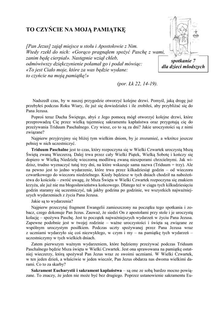 TO CZYŃCIE NA MOJĄ PAMIĄTKĘ [Pan Jezus] zajął miejsce u stołu i Apostołowie z Nim. Wtedy rzekł do nich: «Gorąco pragnąłem spożyć Paschę z wami, zanim będę cierpiał». Następnie wziął chleb, spotkanie 7 odmówiwszy dziękczynienie połamał go i podał mówiąc: dla dzieci młodszych «To jest Ciało moje, które za was będzie wydane: to czyńcie na moją pamiątkę!» (por. Łk 22, 14-19). Nadszedł czas, by w naszej przygodzie otworzyć kolejne drzwi. Pomyśl, jaką drogę już przebyłeś podczas Roku Wiary, ile już się dowiedziałeś i ile zrobiłeś, aby przybliżać się do Pana Jezusa. Poproś teraz Ducha Świętego, abyś z Jego pomocą mógł otworzyć kolejne drzwi, które przeprowadzą Cię przez wielką tajemnicę sakramentu kapłaństwa oraz przygotują cię do przeżywania Triduum Paschalnego. Czy wiesz, co to są za dni? Jakie uroczystości są z nimi związane? Najpierw przyjrzyjmy się bliżej tym wielkim dniom, by je zrozumieć, a wkrótce jeszcze pełniej w nich uczestniczyć. Triduum Paschalne jest to czas, który rozpoczyna się w Wielki Czwartek uroczystą Mszą Świętą zwaną Wieczerzą. Dalej trwa przez cały Wielki Piątek, Wielką Sobotę i kończy się dopiero w Wielką Niedzielę wieczorną modlitwą zwaną nieszporami chrzcielnymi. Jak widzisz, trudno wyznaczyć tutaj trzy dni, na które wskazuje sama nazwa (Triduum = trzy). Ale na pewno jest to jedno wydarzenie, które trwa przez kilkadziesiąt godzin – od wieczoru czwartkowego do wieczoru niedzielnego. Kiedy będziesz w tych dniach chodził na nabożeństwa do kościoła – zwróć uwagę, że Msza Święta w Wielki Czwartek rozpoczyna się znakiem krzyża, ale już nie ma błogosławieństwa końcowego. Dlatego też w ciągu tych kilkudziesięciu godzin staramy się uczestniczyć, tak jakby godzina po godzinie, we wszystkich najważniejszych wydarzeniach z życia Pana Jezusa. Jakie są to wydarzenia? Najpierw przeczytaj fragment Ewangelii zamieszczony na początku tego spotkania i zobacz, czego dokonuje Pan Jezus. Zauważ, że siedzi On z apostołami przy stole i je uroczystą kolację – spożywa Paschę. Jest to początek najważniejszych wydarzeń w życiu Pana Jezusa. Zapewne podobnie jest w twojej rodzinie – ważne uroczystości i święta są związane ze wspólnym uroczystym posiłkiem. Podczas uczty spożywanej przez Pana Jezusa wraz z uczniami wydarzyło się coś niezwykłego, w czym i my – na pamiątkę tych wydarzeń – uczestniczymy w tych wielkich dniach. Zatem pierwszym ważnym wydarzeniem, które będziemy przeżywać podczas Triduum Paschalnego będzie Msza święta w Wielki Czwartek. Jest ona sprawowana na pamiątkę ostatniej wieczerzy, którą spożywał Pan Jezus wraz ze swoimi uczniami. W Wielki Czwartek, w ten jeden dzień, a właściwie w jeden wieczór, Pan Jezus obdarza nas dwoma wielkimi darami. Co to za skarby? Sakrament Eucharystii i sakrament kapłaństwa – są one ze sobą bardzo mocno powiązane. To znaczy, że jeden nie może być bez drugiego. Poprzez ustanowienie sakramentu Eu- charystii Pan Jezus pozostawił nam Siebie pod postaciami chleba i wina. Natomiast poprzez ustanowienie sakramentu kapłaństwa Pan Jezus uobecnia się i może działać w życiu każdego człowieka. Podczas tego spotkania spróbujemy odkryć tajemnicę sakramentu kapłaństwa. Jest on przeznaczony dla mężczyzn, którzy pragną głosić innym ludziom Słowo Boże oraz sprawować sakramenty święte. Sakrament ten wyciska na człowieku nieusuwalną pieczęć, która pozostanie w jego duszy na zawsze. Kapłani reprezentują samego Chrystusa, ale nie działają swoją własną mocą, tylko dzięki pomocy Pana Jezusa, uobecniają Go tutaj na ziemi. Stać się kapłanem, to znaczy być sługą Pana Jezusa, czyli dysponować przemieniającą, uzdrawiającą i zbawczą mocą samego Pana Jezusa. Dlatego kapłani, jako słudzy (dzięki otrzymanemu sakramentowi kapłaństwa) mogą sprawować inne sakramenty. Najważniejszy z nich to sakrament Eucharystii – drugi skarb, który ofiarował nam Pan Jezus w Wielki Czwartek. Jeśli porównamy sakramenty święte do tętnic w ludzkim ciele, to sakrament kapłaństwa jest aortą (czyli główną tętnicą). Gdyby Pan Jezus nie ofiarował ludziom tego sakramentu, nie mielibyśmy kapłanów, biskupów, papieża, a co z tym się wiąże – nie otrzymalibyśmy pozostałych sakramentów. Sakrament kapłaństwa (nazywany również sakramentem święceń) został dany mężczyznom po to, by przekazywali nam życie Boże. Pamiętaj, że kapłaństwo nie jest ani pracą, ani zawodem, który można wykonywać. Jest to dar od Pana Boga. Warto wiedzieć, że każdy kapłan pochodzi ze zwyczajnej rodziny, podobnej być może do twojej. Ale jest on tylko narzędziem w rękach Pana Boga. Dlatego jeśli mówisz, że jakiś ksiądz nie mówi ciekawych kazań, msza, którą odprawia jest nudna i nie chcesz na nią chodzić, to można to porównać do tego, że nie podoba ci się talerz, na którym mama podała ci posiłek, więc nie będziesz jadł. Co należy zrobić? Proszę cię, abyś pracę w tym spotkaniu rozłożył na dwa tygodnie. I chociaż jeszcze w Kościele nie przeżywamy Triduum Paschalnego, to już wkrótce będziemy mogli w nim uczestniczyć. W PIERWSZYM TYGODNIU na adoracji podziękuj Panu Jezusowi za dar sakramentu kapłaństwa. Podczas modlitwy pomyśl, że sakrament kapłaństwa otwiera nam drogę do przyjęcia wszystkich pozostałych sakramentów. I podczas tej modlitwy podziękuj za wszystkie sakramenty, które otrzymałeś i które otrzymasz w swoim życiu. Wspólnie z rodzicami przeczytaj „Kartkę siódmą z pamiętnika Tosi i Franka” i zastanówcie się nad przeczytaną treścią. Wytnij i wklej drzwi do „Spotkania 7” do swojego segregatora. Na zewnętrznej stronie wpisz dni, które składają się na Triduum Paschalne. Chociaż jest jeszcze trochę czasu, to już dziś poproś rodziców, byś mógł uczestni