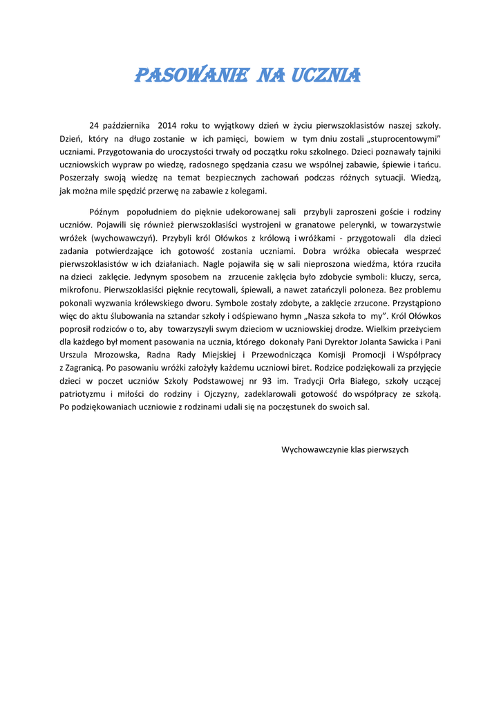 PASOWANIE NA UCZNIA 24 października 2014 roku to wyjątkowy dzieo w życiu pierwszoklasistów naszej szkoły. Dzieo, który na długo zostanie w ich pamięci, bowiem w tym dniu zostali „stuprocentowymi” uczniami. Przygotowania do uroczystości trwały od początku roku szkolnego. Dzieci poznawały tajniki uczniowskich wypraw po wiedzę, radosnego spędzania czasu we wspólnej zabawie, śpiewie i taocu. Poszerzały swoją wiedzę na temat bezpiecznych zachowao podczas różnych sytuacji. Wiedzą, jak można mile spędzid przerwę na zabawie z kolegami. Późnym popołudniem do pięknie udekorowanej sali przybyli zaproszeni goście i rodziny uczniów. Pojawili się również pierwszoklasiści wystrojeni w granatowe pelerynki, w towarzystwie wróżek (wychowawczyo). Przybyli król Ołówkos z królową i wróżkami - przygotowali dla dzieci zadania potwierdzające ich gotowośd zostania uczniami. Dobra wróżka obiecała wesprzed pierwszoklasistów w ich działaniach. Nagle pojawiła się w sali nieproszona wiedźma, która rzuciła na dzieci zaklęcie. Jedynym sposobem na zrzucenie zaklęcia było zdobycie symboli: kluczy, serca, mikrofonu. Pierwszoklasiści pięknie recytowali, śpiewali, a nawet zataoczyli poloneza. Bez problemu pokonali wyzwania królewskiego dworu. Symbole zostały zdobyte, a zaklęcie zrzucone. Przystąpiono więc do aktu ślubowania na sztandar szkoły i odśpiewano hymn „Nasza szkoła to my”. Król Ołówkos poprosił rodziców o to, aby towarzyszyli swym dzieciom w uczniowskiej drodze. Wielkim przeżyciem dla każdego był moment pasowania na ucznia, którego dokonały Pani Dyrektor Jolanta Sawicka i Pani Urszula Mrozowska, Radna Rady Miejskiej i Przewodnicząca Komisji Promocji i Współpracy z Zagranicą. Po pasowaniu wróżki założyły każdemu uczniowi biret. Rodzice podziękowali za przyjęcie dzieci w poczet uczniów Szkoły Podstawowej nr 93 im. Tradycji Orła Białego, szkoły uczącej patriotyzmu i miłości do rodziny i Ojczyzny, zadeklarowali gotowośd do współpracy ze szkołą. Po podziękowaniach uczniowie z rodzinami udali się na poczęstunek do swoich sal. Wychowawczynie klas pierwszych