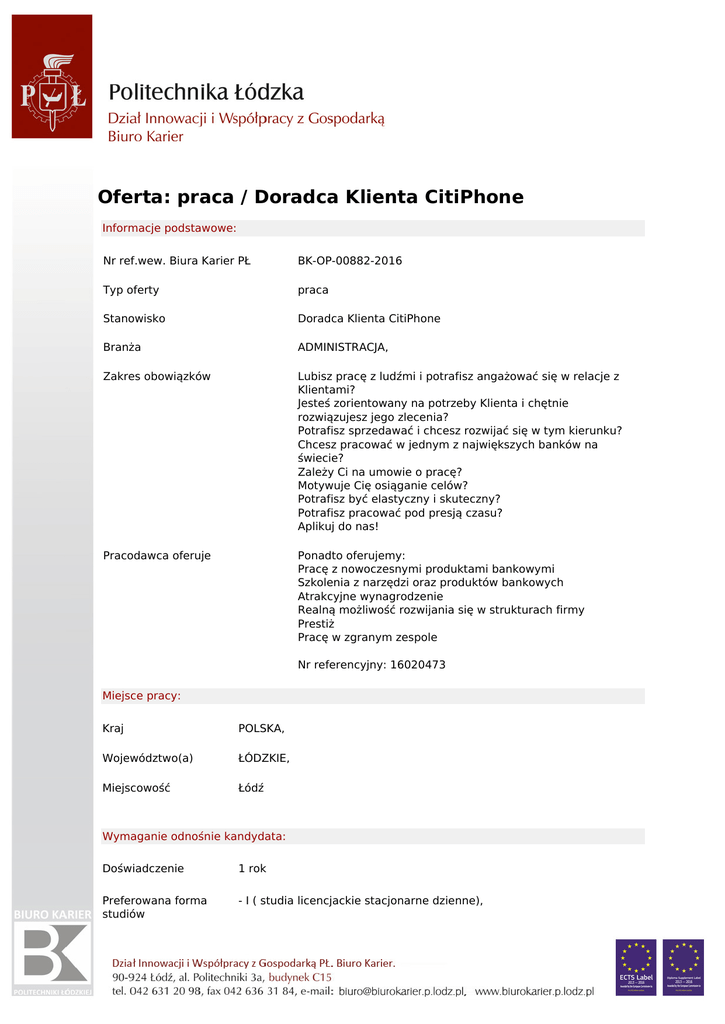 Oferta: praca / Doradca Klienta CitiPhone Informacje podstawowe: Nr ref.wew. Biura Karier PŁ BK-OP-00882-2016 Typ oferty praca Stanowisko Doradca Klienta CitiPhone Branża ADMINISTRACJA, Zakres obowiązków Lubisz pracę z ludźmi i potrafisz angażować się w relacje z Klientami? Jesteś zorientowany na potrzeby Klienta i chętnie rozwiązujesz jego zlecenia? Potrafisz sprzedawać i chcesz rozwijać się w tym kierunku? Chcesz pracować w jednym z największych banków na świecie? Zależy Ci na umowie o pracę? Motywuje Cię osiąganie celów? Potrafisz być elastyczny i skuteczny? Potrafisz pracować pod presją czasu? Aplikuj do nas! Pracodawca oferuje Ponadto oferujemy: Pracę z nowoczesnymi produktami bankowymi Szkolenia z narzędzi oraz produktów bankowych Atrakcyjne wynagrodzenie Realną możliwość rozwijania się w strukturach firmy Prestiż Pracę w zgranym zespole Nr referencyjny: 16020473 Miejsce pracy: Kraj POLSKA, Województwo(a) ŁÓDZKIE, Miejscowość Łódź Wymaganie odnośnie kandydata: Doświadczenie 1 rok Preferowana forma studiów - I ( studia licencjackie stacjonarne dzienne), Dane kontaktowe: Nazwa firmy/Pracodawcy Kraj Województwo Miasto Adres Kod pocztowy Opis firmy Citi Bank Handlowy POLSKA MAZOWIECKIE Warszawa Goleszowska 6 01-249 Bank Handlowy w Warszawie SA to jedna z największych instytucji finansowych w Polsce, oferująca pod marką Citi Handlowy bogaty i nowoczesny asortyment produktów i usług bankowości korporacyjnej, inwestycyjnej i detalicznej. Bank Handlowy obsługuje 7,4 tys. klientów korporacyjnych i 770 tys. klientów indywidualnych poprzez nowoczesne kanały dystrybucji oraz sieć 60 oddziałów. W skład grupy kapitałowej Banku wchodzą takie podmioty jak: Dom Maklerski Banku Handlowego i Handlowy Leasing. Przynależność do Citigroup, największej na świecie instytucji finansowej, zapewnia klientom Banku Handlowego dostęp do usług finansowych w ponad 100 krajach. Bank Handlowy w Warszawie S.A. is one of the largest financial institutions in Poland, offering a wide range of modern corporate, investment and retail banking products and services under the Citi Handlowy brand. Bank Handlowy serves 7,400 corporate clients and 770 individual clients through modern distribution channels and a network of 60 branches. The Bank Sposób aplikacji: Osoby zainteresowane prosimy o przesyłanie aplikacji na adres [email protected] podając numer referencyjny stanowiska Data umieszczenia: Oferta ważna od 18-04-2016 do 19-05-2019 Politechnika Łódzka, jest wpisana pod numerem 2414 do rejestru podmiotów prowadzących agencje zatrudnienia.