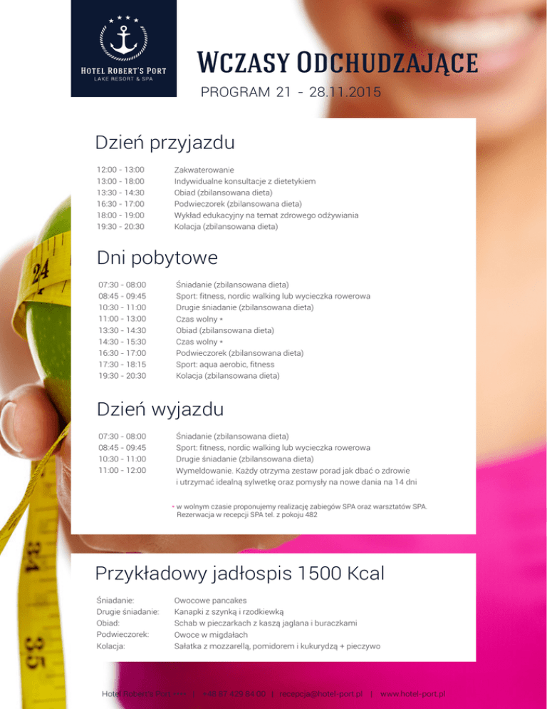 Wczasy Odchudzające PROGRAM 21 - 28.11.2015 Dzień przyjazdu 12:00 - 13:00 Zakwaterowanie 13:00 - 18:00 Indywidualne konsultacje z dietetykiem 13:30 - 14:30 Obiad (zbilansowana dieta) 16:30 - 17:00 Podwieczorek (zbilansowana dieta) 18:00 - 19:00 Wykład edukacyjny na temat zdrowego odżywiania 19:30 - 20:30 Kolacja (zbilansowana dieta) Dni pobytowe 07:30 - 08:00 Śniadanie (zbilansowana dieta) 08:45 - 09:45 Sport: fitness, nordic walking lub wycieczka rowerowa 10:30 - 11:00 Drugie śniadanie (zbilansowana dieta) 11:00 - 13:00 Czas wolny * 13:30 - 14:30 Obiad (zbilansowana dieta) 14:30 - 15:30 Czas wolny * 16:30 - 17:00 Podwieczorek (zbilansowana dieta) 17:30 - 18:15 Sport: aqua aerobic, fitness 19:30 - 20:30 Kolacja (zbilansowana dieta) Dzień wyjazdu 07:30 - 08:00 Śniadanie (zbilansowana dieta) 08:45 - 09:45 Sport: fitness, nordic walking lub wycieczka rowerowa 10:30 - 11:00 Drugie śniadanie (zbilansowana dieta) 11:00 - 12:00 Wymeldowanie. Każdy otrzyma zestaw porad jak dbać o zdrowie i utrzymać idealną sylwetkę oraz pomysły na nowe dania na 14 dni * w wolnym czasie proponujemy realizację zabiegów SPA oraz warsztatów SPA. Rezerwacja w recepcji SPA tel. z pokoju 482 Przykładowy jadłospis 1500 Kcal Śniadanie: Owocowe pancakes Drugie śniadanie: Kanapki z szynką i rzodkiewką Obiad: Schab w pieczarkach z kaszą jaglana i buraczkami Podwieczorek: Owoce w migdałach Kolacja: Sałatka z mozzarellą, pomidorem i kukurydzą + pieczywo Hotel Robert’s Port **** | +48 87 429 84 00 | [email protected] | www.hotel-port.pl