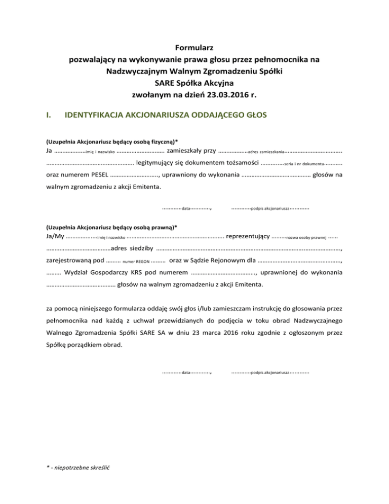 Formularz pozwalający na wykonywanie prawa głosu przez pełnomocnika na Nadzwyczajnym Walnym Zgromadzeniu Spółki SARE Spółka Akcyjna zwołanym na dzień 23.03.2016 r. I. IDENTYFIKACJA AKCJONARIUSZA ODDAJĄCEGO GŁOS (Uzupełnia Akcjonariusz będący osobą fizyczną)* Ja …………….…imię i nazwisko …………………….…. zamieszkały przy ………………adres zamieszkania…………………………….. ……………………………….……………. legitymujący się dokumentem tożsamości ………..…seria i nr dokumentu……….. oraz numerem PESEL ……………………….., uprawniony do wykonania …………………………………… głosów na walnym zgromadzeniu z akcji Emitenta. …………data…………, …………podpis akcjonariusza………… (Uzupełnia Akcjonariusz będący osobą prawną)* Ja/My …………….…imię i nazwisko ……………………………………………….…. reprezentujący ………nazwa osoby prawnej …… …………………………………adres siedziby ………………………………………………………………………….…..….………….…., zarejestrowaną pod ……… numer REGON ……… oraz w Sądzie Rejonowym dla …………………………….….…………, ……… Wydział Gospodarczy KRS pod numerem …………………………………, uprawnionej do wykonania …………………………………… głosów na walnym zgromadzeniu z akcji Emitenta. za pomocą niniejszego formularza oddaję swój głos i/lub zamieszczam instrukcję do głosowania przez pełnomocnika nad każdą z uchwał przewidzianych do podjęcia w toku obrad Nadzwyczajnego Walnego Zgromadzenia Spółki SARE SA w dniu 23 marca 2016 roku zgodnie z ogłoszonym przez Spółkę porządkiem obrad. …………data…………, * - niepotrzebne skreślić …………podpis akcjonariusza………… Identyfikacja Akcjonariusza W celu identyfikacji Akcjonariusza udzielającego pełnomocnictwa, do niniejszego pełnomocnictwa powinna zostać załączona: w przypadku akcjonariusza będącego osobą fizyczną – kopia dowodu osobistego, paszportu lub innego urzędowego dokumentu potwierdzającego tożsamość Akcjonariusza, w przypadku akcjonariusza innego niż osoba fizyczna – kopia odpisu z właściwego rejestru, wydana nie później niż trzy miesiące przed terminem Walnego Zgromadzenia, lub innego dokumentu potwierdzającego upoważnienie osoby fizycznej (lub osób fizycznych) do reprezentowania Akcjonariusza na Walnym Zgromadzeniu (np. nieprzerwany ciąg pełnomocnictw). Brak dokumentu potwierdzającego upoważnienie osoby fizycznej do reprezentowania Akcjonariusza Emitenta (np. posiadanie nieaktualnego odpisu z KRS) mogą skutkować niedopuszczeniem przedstawiciela Akcjonariusza do uczestniczenia w Walnym Zgromadzeniu. W celu identyfikacji Akcjonariusza udzielającego pełnomocnictwa w postaci elektronicznej, powyższe dokumenty powinny zostać przesłane w formie elektronicznej jako załączniki w formacie „pdf” (lub innym formacie pozwalającym na jego odczytanie przez Spółkę) na adres [email protected]. W przypadku wątpliwości co do prawdziwości kopii wyżej wymienionych dokumentów, Zarząd Spółki zastrzega sobie prawo do żądania od pełnomocnika okazania przy sporządzaniu listy obecności: w przypadku akcjonariusza będącego osobą fizyczną – kopii potwierdzonej za zgodność z oryginałem przez notariusza lub inny podmiot uprawniony do potwierdzania za zgodność z oryginałem kopii dowodu osobistego, paszportu lub innego urzędowego dokumentu potwierdzającego tożsamość Akcjonariusza, w przypadku akcjonariusza innego niż osoba fizyczna – oryginału lub kopii potwierdzonej za zgodność z oryginałem przez notariusza lub inny podmiot uprawniony do potwierdzania za zgodność z oryginałem odpisu z właściwego rejestru, wydanego nie później niż trzy miesiące przed terminem Walnego Zgromadzenia, lub innego dokumentu potwierdzającego upoważnienie osoby fizycznej (lub osób fizycznych) do reprezentowania pełnomocnika na Walnym Zgromadzeniu (np. nieprzerwany ciąg pełnomocnictw). Brak odpowiednio potwierdzonego dokumentu upoważniającego osobę fizyczną do reprezentowania Akcjonariusza Emitenta (np. posiadanie nieaktualnego odpisu z KRS) może skutkować niedopuszczeniem przedstawiciela Akcjonariusza do uczestniczenia w Walnym Zgromadzeniu. * - niepotrzebne skreślić II. IDENTYFIKACJA PEŁNOMOCNIKA, JEŻELI AKCJONARIUSZ WYKONUJE PRAWO GŁOSU PRZEZ PEŁNOMOCNIKA Udzielam pełnomocnictwa osobie fizycznej* niniejszym udzielam/y Panu/Pani ………………………imię i nazwisko……………….…. zamieszkałemu/ej przy ……………………………………………………adres zamieszkania……………………………………………………………………………………. legitymującemu/ej się dokumentem tożsamości ……………seria i nr dokumentu………..….. oraz numer PESEL ……………………………………… pełnomocnictwa do uczestniczenia oraz wykonywania prawa głosu z: zarejestrowanych przeze mnie ……………………liczba akcji……………………… akcji Spółki SARE Spółka Akcyjna na Nadzwyczajnym Walnym Zgromadzeniu Spółki SARE SA zwołanym na dzień 23 marca 2016 r. zgodnie z instrukcją co do sposobu głosowania zamieszczoną poniżej/zgodnie z uznaniem pełnomocnika*. …………data…………, …………podpis akcjonariusza………… Udzielam pełnomocnictwa osobie prawnej* niniejszym udzielam/y ……………………………nazwa osoby prawnej …………………………… adres siedziby …………………………………………………………………………………………………………….…..….…….…zarejestrowaną pod ……… numer REGON ……… oraz w Sądzie Rejonowym dla …………………………