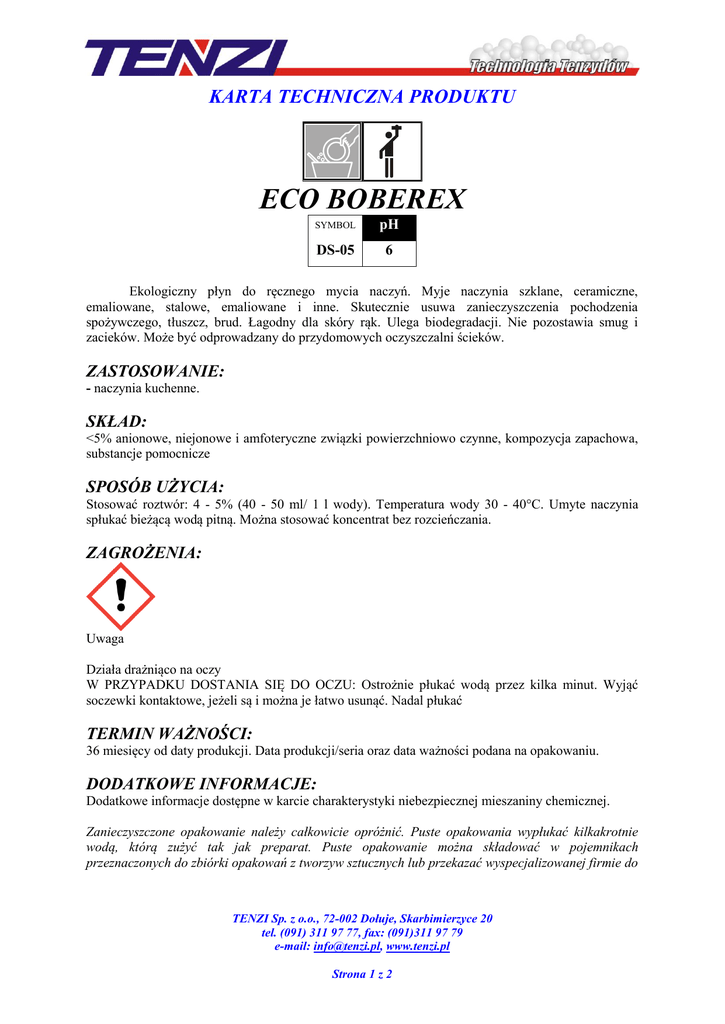 KARTA TECHNICZNA PRODUKTU ECO BOBEREX SYMBOL pH DS-05 6 Ekologiczny płyn do ręcznego mycia naczyń. Myje naczynia szklane, ceramiczne, emaliowane, stalowe, emaliowane i inne. Skutecznie usuwa zanieczyszczenia pochodzenia spożywczego, tłuszcz, brud. Łagodny dla skóry rąk. Ulega biodegradacji. Nie pozostawia smug i zacieków. Może być odprowadzany do przydomowych oczyszczalni ścieków. ZASTOSOWANIE: - naczynia kuchenne. SKŁAD: <5% anionowe, niejonowe i amfoteryczne związki powierzchniowo czynne, kompozycja zapachowa, substancje pomocnicze SPOSÓB UŻYCIA: Stosować roztwór: 4 - 5% (40 - 50 ml/ 1 l wody). Temperatura wody 30 - 40°C. Umyte naczynia spłukać bieżącą wodą pitną. Można stosować koncentrat bez rozcieńczania. ZAGROŻENIA: Uwaga Działa drażniąco na oczy W PRZYPADKU DOSTANIA SIĘ DO OCZU: Ostrożnie płukać wodą przez kilka minut. Wyjąć soczewki kontaktowe, jeżeli są i można je łatwo usunąć. Nadal płukać TERMIN WAŻNOŚCI: 36 miesięcy od daty produkcji. Data produkcji/seria oraz data ważności podana na opakowaniu. DODATKOWE INFORMACJE: Dodatkowe informacje dostępne w karcie charakterystyki niebezpiecznej mieszaniny chemicznej. Zanieczyszczone opakowanie należy całkowicie opróżnić. Puste opakowania wypłukać kilkakrotnie wodą, którą zużyć tak jak preparat. Puste opakowanie można składować w pojemnikach przeznaczonych do zbiórki opakowań z tworzyw sztucznych lub przekazać wyspecjalizowanej firmie do TENZI Sp. z o.o., 72-002 Dołuje, Skarbimierzyce 20 tel. (091) 311 97 77, fax: (091)311 97 79 e-mail: [email protected], www.tenzi.pl Strona 1 z 2 KARTA TECHNICZNA PRODUKTU utylizacji. Przestrzegać przepisów Ustawy z dnia 13 czerwca 2013 r. o gospodarce opakowaniami i odpadami opakowaniowymi (Dz. U. 2013, poz. 888). TENZI Sp. z o.o., 72-002 Dołuje, Skarbimierzyce 20 tel. (091) 311 97 77, fax: (091)311 97 79 e-mail: [email protected], www.tenzi.pl Strona 2 z 2