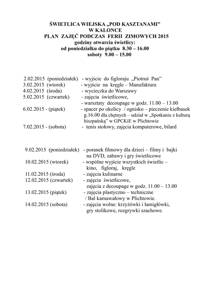 ŚWIETLICA WIEJSKA „POD KASZTANAMI” W KALONCE PLAN ZAJĘĆ PODCZAS FERII ZIMOWYCH 2015 godziny otwarcia świetlicy: od poniedziałku do piątku 8.30 – 16.00 soboty 9.00 – 15.00 2.02.2015 3.02.2015 4.02.2015 5.02.2015 (poniedziałek) (wtorek) (środa) (czwartek) 6.02.2015 - (piątek) - wyjście do figloraju „Piotruś Pan” - wyjście na kręgle – Manufaktura - wycieczka do Warszawy - zajęcia świetlicowe, - warsztaty decoupage w godz. 11.00 – 13.00 - spacer po okolicy / ognisko – pieczenie kiełbasek g.16.00 dla chętnych – udział w „Spotkaniu z kulturą hiszpańską” w GPCKiE w Plichtowie 7.02.2015 - (sobota) - tenis stołowy, zajęcia komputerowe, bilard 9.02.2015 (poniedziałek) - poranek filmowy dla dzieci – filmy i bajki na DVD, zabawy i gry świetlicowe 10.02.2015 (wtorek) - wspólne wyjście wszystkich świetlic – kino, figloraj, kręgle 11.02.2015 (środa) - zajęcia kulinarne 12.02.2015 (czwartek) - zajęcia świetlicowe, zajęcia z decoupage w godz. 11.00 – 13.00 13.02.2015 (piątek) - zajęcia plastyczno – techniczne / Bal karnawałowy w Plichtowie. 14.02.2015 (sobota) - zajęcia wolne: krzyżówki i łamigłówki, gry stolikowe, rozgrywki szachowe.