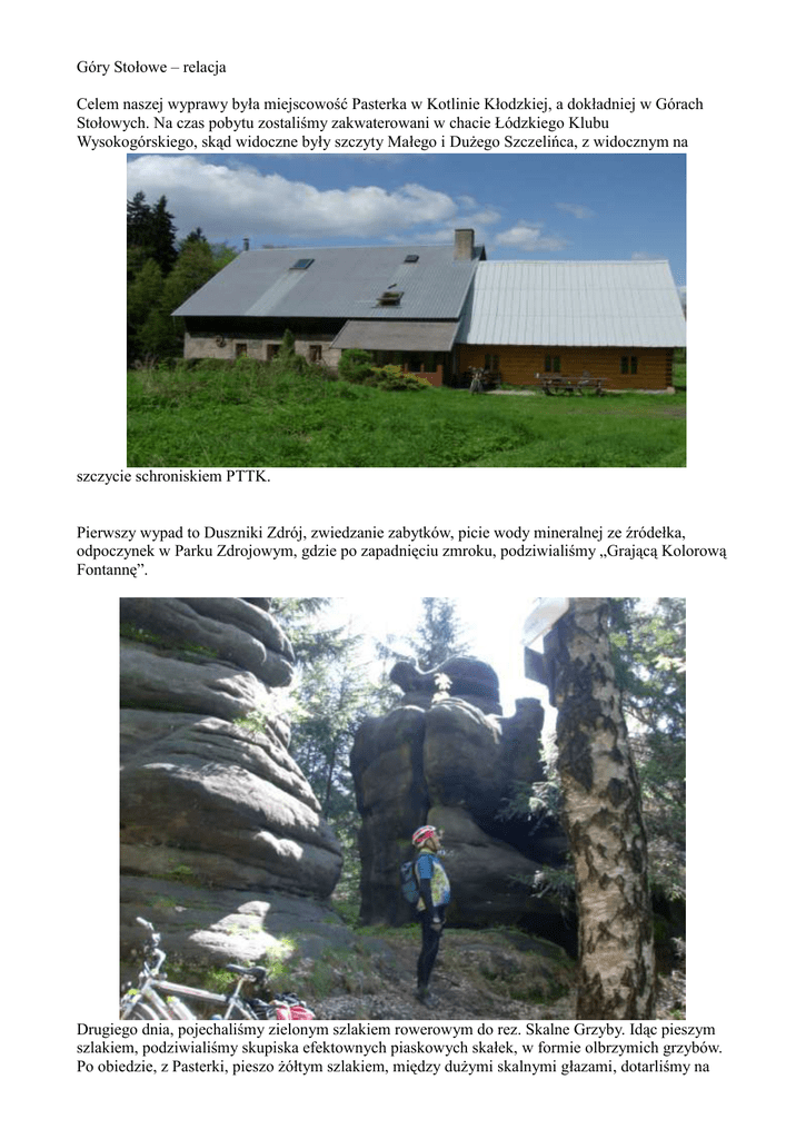 Góry Stołowe – relacja Celem naszej wyprawy była miejscowość Pasterka w Kotlinie Kłodzkiej, a dokładniej w Górach Stołowych. Na czas pobytu zostaliśmy zakwaterowani w chacie Łódzkiego Klubu Wysokogórskiego, skąd widoczne były szczyty Małego i Dużego Szczelińca, z widocznym na szczycie schroniskiem PTTK. Pierwszy wypad to Duszniki Zdrój, zwiedzanie zabytków, picie wody mineralnej ze źródełka, odpoczynek w Parku Zdrojowym, gdzie po zapadnięciu zmroku, podziwialiśmy „Grającą Kolorową Fontannę”. Drugiego dnia, pojechaliśmy zielonym szlakiem rowerowym do rez. Skalne Grzyby. Idąc pieszym szlakiem, podziwialiśmy skupiska efektownych piaskowych skałek, w formie olbrzymich grzybów. Po obiedzie, z Pasterki, pieszo żółtym szlakiem, między dużymi skalnymi głazami, dotarliśmy na najwyższy szczyt Gór Stołowych, Szczeliniec Wielki (919 m.). Idąc wyznaczoną trasą, podziwialiśmy różnorodność form skalnych, a z tarasów widokowych piękne górskie widoki. Zejście ze szczytu stromymi schodami, a dalej łagodnym zejściem, niebieskim szlakiem do naszej bazy w Pasterce. Następne dni to jazda różnymi trasami, m.in. do Czech, poruszaliśmy się na przemian trasą terenową oraz drogami asfaltowymi. Przykładowe trasy: Pasterka – Kudowa Zdrój – Kudowa Czermna – Hronov – Police nad Metuji – Machowska Lhota – Ostra Góra – Pasterka. Pasterka – Czeski Park Narodowy Brumowskie Ściany, rez. Skalne ZOO - Suchy Dul – Hlavnov – Ameryka – Martinkovice – Pasterka. Pasterka – Szosa Stu Zakrętów – Radków – Wambierzyce – Radków – Bożanov – Machovski Kriż - Pasterka. Pasterka – Szczytna – Polanica Zdrój – Bystrzyca Kłodzka – przełęcz Spalona – Zieleniec – Duszniki Zdrój – Karłów – Pasterka. Ostatni dzień naszego pobytu w Górach Stołowych, to dojazd do rez. Błędne Skały (852 m.) Przejście skalnym labiryntem po oznaczonej trasie, przeciskanie się przez system wąskich szczelin rozcinających warstwę skał na bloki o wysokości 5 – 6 metrów. W trakcie naszych wędrówek rowerowych po Ziemi Kłodzkiej, zwiedziliśmy wiele miast. Zamki: w Starej Łomnicy, Homole k/przełęczy Polskie Wrota, w Ratnie Dolnym i w Szczytnej. Górskie szlaki rowerowe (w Czechach „Cyklostrady”), choć trudne, nie były powodem większych problemów przy ich pokonywaniu (twarde podłoże). Pokonaliśmy szereg przełęczy górskich m.in. kilkakrotnie Lisią Przełęcz (790 m.), Polskie Wrota (660 m.), Sokołówkę, Spaloną (788 m.). Dzień jazdy, rozpoczynaliśmy od dwukilometrowego podjazdu, drogą wspinającą się na stoki Szczelińca Wielkiego. Część powrotów do Pasterki to podjazdy 8% - 12% na Lisią Przełęcz od strony Kudowy Zdroju, lub Dusznik Zdroju, lub od Radkowa, o długości ok. 10 km. Wielokilometrowe zjazdy, serpentyny, zakręty o łuku do 180 stopni, duża szybkość, sprawiały dużą przyjemność, rekompensowały trudy podjazdów. W sumie, po dość trudnych trasach, przejechaliśmy ok. 400 km. Siedem dni ( od 12 do 18 maja 2013 r.) pełnych wrażeń, na trasach Ziemi Kłodzkiej i Czech, wśród wspaniałej górskiej przyrody spędzili: Waldek Ceranka – zna szczyty, szlaki, ścieżki Gór Stołowych jak przysłowiową własną kieszeń. Paweł Gos – jak zwykle bardzo uczynny, zajmował się foto i Wiesiek Grabowski – relacja z przebiegu wyprawy.