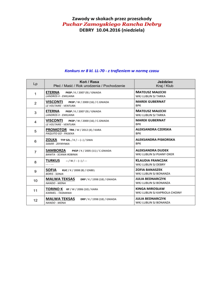 Zawody w skokach przez przeszkody Puchar Zamoyskiego Rancha Debry DEBRY 10.04.2016 (niedziela) Konkurs nr 8 kl. LL-70 - z trafieniem w normę czasu Lp Koń / Rasa Płeć / Maść / Rok urodzenia / Pochodzenie Jeździec Kraj / Klub 1 ETERNA PKSP / K / 2007 (9) / GNIADA LANDROS II - EMILIANA MATEUSZ MAŁECKI 2 VISCONTI PKSP / W / 2000 (16) / C.GNIADA LE VOLTAIRE - VENTURA MAREK GUBERNAT 3 ETERNA PKSP / K / 2007 (9) / GNIADA LANDROS II - EMILIANA MATEUSZ MAŁECKI 4 VISCONTI PKSP / W / 2000 (16) / C.GNIADA LE VOLTAIRE - VENTURA MAREK GUBERNAT 5 PROMOTOR TRK / W / 2012 (4) / KARA PAQUITO GO - PASIEKA ALEKSANDRA CZERSKA 6 ZOLKA TYP SZL. / K / -- (--) / SIWA SAMIR - ZEFIRYNKA ALEKSANDRA PISKORSKA 7 SAMBORZA PKSP / K / 2005 (11) / C.GNIADA BANITA - SCANIA ROBINIA ALEKSANDRA DUDEK 8 TURKUS KLAUDIA FRANCZAK --- - --- WKJ LUBLIN SJ DEBRY 9 SOFIA KUC / K / 2008 (8) / IZABEL BORIS - SONJA ZOFIA BANASZEK 10 MALWA TEKSAS JULIA BEDNARCZYK NANDO - MONA WKJ LUBLIN SJ BONANZA 11 TORINO K KF / W / 2006 (10) / KARA KARMEL - TASMANIA KINGA MIROSŁAW 12 MALWA TEKSAS JULIA BEDNARCZYK NANDO - MONA -- / W / -- (--) / --- DRP / K / 1998 (18) / GNIADA DRP / K / 1998 (18) / GNIADA WKJ LUBLIN SJ TARKA BPK WKJ LUBLIN SJ TARKA BPK BPK BPK WKJ LUBLIN SJ PIJANY OXER WKJ LUBLIN SJ BONANZA WKJ LUBLIN SJ KAPRIOLA CHOINY WKJ LUBLIN SJ BONANZA Konkurs nr 9 kl. LL-85 - zwykły Puchar Zamoyskiego Rancha Debry - Kategoria MAŁA - FINAŁ Lp Koń / Rasa Płeć / Maść / Rok urodzenia / Pochodzenie Jeździec Kraj / Klub 1 SAMBORZA PKSP / K / 2005 (11) / C.GNIADA BANITA - SCANIA ROBINIA ALEKSANDRA DUDEK 2 ALKA GB KF / K / 2001 (15) / GNIADO-SROK. KWESTOR po GRACJAN - ANDALUZJA GB po AS MARTA BANACH 3 TURKUS KLAUDIA FRANCZAK --- - --- WKJ LUBLIN SJ DEBRY 4 SOFIA KUC / K / 2008 (8) / IZABEL BORIS - SONJA ZOFIA BANASZEK 5 SARMATA PKSP / W / 1998 (18) / C.GNIADA RENOMMEE - SANTANA KATARZYNA STĄŻKA 6 MALWA TEKSAS JULIA BEDNARCZYK -- / W / -- (--) / --- DRP / K / 1998 (18) / GNIADA WKJ LUBLIN SJ PIJANY OXER WKJ LUBLIN SJ STAJNIA DRWAL WKJ LUBLIN SJ BONANZA WKJ LUBLIN SJ BONANZA WKJ LUBLIN SJ BONANZA NANDO - MONA Konkurs nr 10 kl. LL-90 - z oceną stylu jeźdźca Lp Koń / Rasa Płeć / Maść / Rok urodzenia / Pochodzenie Jeździec Kraj / Klub 1 TORINO K KF / W / 2006 (10) / KARA KARMEL - TASMANIA KINGA MIROSŁAW 2 ALKA GB KF / K / 2001 (15) / GNIADO-SROK. KWESTOR po GRACJAN - ANDALUZJA GB po AS MARTA BANACH 3 SOFIA KUC / K / 2008 (8) / IZABEL BORIS - SONJA ZOFIA BANASZEK 4 ALKA GB KF / K / 2001 (15) / GNIADO-SROK. KWESTOR po GRACJAN - ANDALUZJA GB po AS MARTA BANACH 5 TURKUS KLAUDIA FRANCZAK --- - --- WKJ LUBLIN SJ DEBRY 6 ZOLKA TYP SZL. / K / -- (--) / SIWA SAMIR - ZEFIRYNKA ALEKSANDRA PISKORSKA 7 VISCONTI PKSP / W / 2000 (16) / C.GNIADA LE VOLTAIRE - VENTURA MAREK GUBERNAT 8 PROMOTOR TRK / W / 2012 (4) / KARA PAQUITO GO - PASIEKA ALEKSANDRA CZERSKA 9 KSENA PKSP / K / 2012 (4) / GNIADA FRED po COLORADO han - KAROTKA po QUMBALL bwp DARIUSZ SULOWSKI 10 ZAWIEJKA PKSP / K / 2008 (8) / KASZTAN LOVE AFFAIR - ZWIEWKA pksp po MODERN xx AGNIESZKA KARCZ 11 MERCEDES N ANNA SZPATUŚKO LASCADO - MESARIA WKJ LUBLIN SJ TARKA 12 ZAWIEJKA AGNIESZKA KARCZ -- / W / -- (--) / --- PKSP / K / 2010 (6) / GNIADA PKSP / K / 2008 (8) / KASZTAN LOVE AFFAIR - ZWIEWKA pksp po MODERN xx WKJ LUBLIN SJ KAPRIOLA CHOINY WKJ LUBLIN SJ STAJNIA DRWAL WKJ LUBLIN SJ BONANZA WKJ LUBLIN SJ STAJNIA DRWAL BPK BPK BPK WKJ LUBLIN SJ SULOWSKI TEAM KJ JANÓW PODLASKI KJ JANÓW PODLASKI Konkurs nr 11 kl. L - zwykły Lp Koń / Rasa Płeć / Maść / Rok urodzenia / Pochodzenie Jeździec Kraj / Klub 1 KSENA PKSP / K / 2012 (4) / GNIADA FRED po COLORADO han - KAROTKA po QUMBALL bwp DARIUSZ SULOWSKI 2 TEKILA PKSP / K / 2009 (7) / GNIADA PLAYER - TIFFANY ALEKSANDRA CZERSKA 3 MERCEDES N ANNA SZPATUŚKO LASCADO - MESARIA WKJ LUBLIN SJ TARKA 4 SIMPLY BALOU PKSP / K / 2008 (8) / GNIADA BALOU DU ROUET - SERAPHINA NINA KWIECIŃSKA 5 ESPERADO DOMINIKA STRĄK PLAUTON - ELIA WKJ LUBLIN 6 SYRIA PKSP / K / 2008 (8) / GNIADA CANTANIS - SANACJA ŁUKASZ WYSOCKI 7 ESPERADO DOMINIKA STRĄK 8 KASABLANKA R PKSP / K / 2010 (6) / GNIADA M / W / 2006 (10) / GNIADA M / W / 2006 (10) / GNIADA WKJ LUBLIN SJ SULOWSKI TEAM BPK WKJ LUBLIN SJ KONIEC BURZY WKJ LUBLIN SJ PIJANY OXER WKJ LUBLIN PLAUTON - ELIA M / K / 2011 (5) / GNIADA MARTA BEDNARZ WKJ LUBLIN SJ BASKIL FAMAGUSTA ARIOSO - KEYSI Konkurs nr 12 kl. L1 – zwykły z rozgrywką Puchar Zamoyskiego Rancha Debry - Kategoria ŚREDNIA - FINAŁ Lp 1 Koń / Rasa Płeć / Maść / Rok urodzenia / Pochodzenie SYRIA PKSP / K / 2008 (8) / GNIADA CANTANIS - SANACJA KORUPCJA Jeździec Kraj / Klub ŁUKASZ WYSOCKI WKJ LUBLIN SJ PIJANY OXER PKSP / K / 2010 (6) / GNIADA LOVE AFFAIR han po LAURIES CRUSADOR xx - KOFFEINA po WELSTEIN han DARIUSZ SULOWSKI 3 ESPERADO DOMINIKA STRĄK PLAUTON - ELIA WKJ LUBLIN 4 LEGENDA PKSP / K / 2009 (7) / KASZTAN LE VOLTAIRE - LEGUMINA ALEKSANDRA CZERSKA 5 KASABLANKA R MARTA BEDNARZ 6 OKSZA GOZDAWA QUMBALL - ORGIA WKJ LUBLIN SJ ALEXANDER ELIZÓWKA 7 GALLANT ROBERT DUBEL 2 M / W / 2006 (10) / GNIADA M / K / 2011 (5) / GNIADA WKJ LUBLIN SJ SULOWSKI TEAM BPK WKJ LUBLIN SJ BASKIL FAMAGUSTA ARIOSO - KEYSI PKSP / K / 2007 (9) / KASZTAN PKSP / O / 2010 (6) / GNIADA CASTIGLIONE L - GAZELLE L ADELA ÖRNEK WKJ LUBLIN SJ DEBRY Konkurs nr 13 kl. P - zwykły Lp Koń / Rasa Płeć / Maść / Rok urodzenia / Pochodzenie Jeździec Kraj / Klub 1 SYRIA PKSP / K / 2008 (8) / GNIADA CANTANIS - SANACJA ŁUKASZ WYSOCKI 2 KASABLANKA R MARTA BEDNARZ ARIOSO - KEYSI WKJ LUBLIN SJ BASKIL FAMAGUSTA 3 SIMPLY BALOU PKSP / K / 2008 (8) / GNIADA BALOU DU ROUET - SERAPHINA NINA KWIECIŃSKA 4 OKSZA GOZDAWA ADELA ÖRNEK QUMBALL - ORGIA WKJ LUBLIN SJ ALEXANDER ELIZÓWKA 5 TEKILA PKSP / K / 2009 (7) / GNIADA PLAYER - TIFFANY ALEKSANDRA CZERSKA 6 DIABLO ROBERT DUBEL M / K / 2011 (5) / GNIADA PKSP / K / 2007 (9) / KASZTAN PKSP / W / 2005 (11) / GNIADA TALENT - DELICJA WKJ LUBLIN SJ PIJANY OXER WKJ LUBLIN SJ KONIEC BURZY BPK WKJ LUBLIN SJ DEBRY Konkurs nr 14 kl. N – zwykły Lp Ko