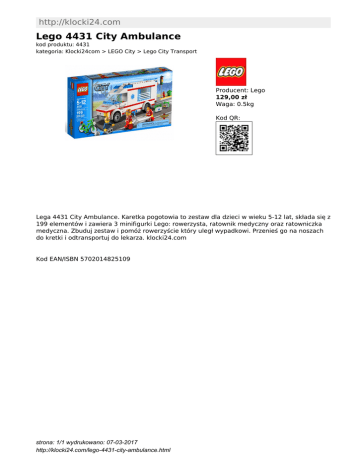 http://klocki24.com Lego 4431 City Ambulance kod produktu: 4431 kategoria: Klocki24com > LEGO City > Lego City Transport Producent: Lego 129,00 zł Waga: 0.5kg Kod QR: Lega 4431 City Ambulance. Karetka pogotowia to zestaw dla dzieci w wieku 5-12 lat, składa się z 199 elementów i zawiera 3 minifigurki Lego: rowerzysta, ratownik medyczny oraz ratowniczka medyczna. Zbuduj zestaw i pomóż rowerzyście który uległ wypadkowi. Przenieś go na noszach do kretki i odtransportuj do lekarza. klocki24.com Kod EAN/ISBN 5702014825109 strona: 1/1 wydrukowano: 07-03-2017 http://klocki24.com/lego-4431-city-ambulance.html