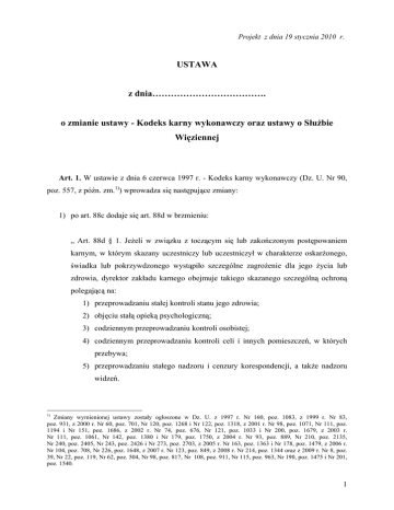 Projekt z dnia 19 stycznia 2010 r. USTAWA z dnia………………………………. o zmianie ustawy - Kodeks karny wykonawczy oraz ustawy o Służbie Więziennej Art. 1. W ustawie z dnia 6 czerwca 1997 r. - Kodeks karny wykonawczy (Dz. U. Nr 90, poz. 557, z późn. zm.1)) wprowadza się następujące zmiany: 1) po art. 88c dodaje się art. 88d w brzmieniu: „ Art. 88d § 1. Jeżeli w związku z toczącym się lub zakończonym postępowaniem karnym, w którym skazany uczestniczy lub uczestniczył w charakterze oskarżonego, świadka lub pokrzywdzonego wystąpiło szczególne zagrożenie dla jego życia lub zdrowia, dyrektor zakładu karnego obejmuje takiego skazanego szczególną ochroną polegającą na: 1) przeprowadzaniu stałej kontroli stanu jego zdrowia; 2) objęciu stałą opieką psychologiczną; 3) codziennym przeprowadzaniu kontroli osobistej; 4) codziennym przeprowadzaniu kontroli celi i innych pomieszczeń, w których przebywa; 5) przeprowadzaniu stałego nadzoru i cenzury korespondencji, a także nadzoru widzeń. 1) Zmiany wymienionej ustawy zostały ogłoszone w Dz. U. z 1997 r. Nr 160, poz. 1083, z 1999 r. Nr 83, poz. 931, z 2000 r. Nr 60, poz. 701, Nr 120, poz. 1268 i Nr 122, poz. 1318, z 2001 r. Nr 98, poz. 1071, Nr 111, poz. 1194 i Nr 151, poz. 1686, z 2002 r. Nr 74, poz. 676, Nr 121, poz. 1033 i Nr 200, poz. 1679, z 2003 r. Nr 111, poz. 1061, Nr 142, poz. 1380 i Nr 179, poz. 1750, z 2004 r. Nr 93, poz. 889, Nr 210, poz. 2135, Nr 240, poz. 2405, Nr 243, poz. 2426 i Nr 273, poz. 2703, z 2005 r. Nr 163, poz. 1363 i Nr 178, poz. 1479, z 2006 r. Nr 104, poz. 708, Nr 226, poz. 1648, z 2007 r. Nr 123, poz. 849, z 2008 r. Nr 214, poz. 1344 oraz z 2009 r. Nr 8, poz. 39, Nr 22, poz. 119, Nr 62, poz. 504, Nr 98, poz. 817, Nr 108, poz. 911, Nr 115, poz. 963, Nr 190, poz. 1475 i Nr 201, poz. 1540. 1 § 2. Szczególna ochrona może polegać również na stosowaniu wobec skazanego, o którym mowa w § 1: 1) warunków odbywania kary określonych w art. 88b i 88c; 2) ochrony osobistej w rozumieniu przepisów o świadku koronnym, za zgodą skazanego. § 3. Dyrektor zakładu karnego obejmuje skazanego szczególną ochroną na wniosek sądu, przed którym toczy się postępowanie, prokuratora prowadzącego postępowanie przygotowawcze lub skazanego. W wypadku wniosku skazanego przed podjęciem decyzji dyrektor zakładu karnego zasięga opinii właściwego sądu lub prokuratora. O objęciu skazanego szczególną ochroną dyrektor zakładu karnego zawiadamia sędziego penitencjarnego. § 4. Szczególna ochrona jest udzielana na czas nieokreślony. Cofnięcie ochrony może nastąpić w razie zmiany okoliczności lub ustania przyczyn, dla których skazanego objęto ochroną. Decyzję w tym zakresie podejmuje dyrektor zakładu karnego na wniosek sądu, prokuratora lub skazanego. W wypadku wniosku skazanego przepis § 3 stosuje się odpowiednio. § 5. Szczególna ochrona jest stosowana także w razie przeniesienia skazanego do innego zakładu karnego. Dyrektor zakładu karnego w którym skazany przebywa, informuje dyrektora zakładu karnego do którego skazany zostaje przeniesiony o konieczności objęcia go szczególną ochroną oraz o dotychczasowych warunkach osadzenia i przyczynach jego zastosowania. § 6. Po zakończeniu postępowania karnego organem właściwym w zakresie składania wniosków, o których mowa w § 3 i 4, jest sędzia penitencjarny.”; 2) po art. 212b dodaje się art. 212ba w brzmieniu: „ Art. 212ba § 1. Jeżeli w związku z toczącym się lub zakończonym postępowaniem karnym, w którym tymczasowo aresztowany uczestniczy lub uczestniczył w charakterze oskarżonego, świadka lub pokrzywdzonego wystąpiło szczególne zagrożenie dla jego życia lub zdrowia, dyrektor aresztu śledczego obejmuje takiego 2 tymczasowo aresztowanego szczególną ochroną polegającą na: 1) przeprowadzaniu stałej kontroli stanu jego zdrowia; 2) objęciu stałą opieką psychologiczną; 3) codziennym przeprowadzaniu kontroli osobistej; 4) codziennym przeprowadzaniu kontroli celi i innych pomieszczeń, w których przebywa; 5) przeprowadzaniu stałego nadzoru i cenzury korespondencji a także nadzoru widzeń. § 2. Szczególna ochrona może polegać również na stosowaniu wobec tymczasowo aresztowanego, o którym mowa w § 1: 1) warunków osadzenia określonych w art. 212b. 2) ochrony osobistej w rozumieniu przepisów o świadku koronnym, za zgodą tymczasowo aresztowanego. § 3. Dyrektor aresztu śledczego obejmuje tymczasowo aresztowanego szczególną ochroną na wniosek sądu, przed którym toczy się postępowanie, prokuratora prowadzącego postępowanie przygotowawcze lub tymczasowo aresztowanego. W wypadku wniosku tymczasowo aresztowanego przed podjęciem decyzji dyrektor aresztu śledczego zasięga opinii właściwego sądu lub prokuratora. O objęciu tymczasowo aresztowanego szczególną ochroną dyrektor aresztu śledczego zawiadamia sędziego penitencjarnego. § 4. Szczególna ochrona jest udzielana na czas nieokreślony. Cofnięcie ochrony może nastąpić w razie zmiany okoliczności lub ustania przyczyn, dla których tymczasowo aresztowanego objęto ochroną. Decyzję w tym zakresie podejmuje dyrektor aresztu śledczego na wniosek sądu, prokuratora lub tymczasowo aresztowanego. W wypadku wniosku tymczasowo aresztowanego przepis § 3 stosuje się odpowiednio. § 5. Szczególna ochrona jest stosowana także w razie przeniesienia tymczasowo aresztowanego do innego aresztu śledczego. Dyrektor aresztu śledczego w którym tymczasowo aresztowany przebywa, informuje dyrektora aresztu śledczego do którego tymczasowo aresztowany zostaje przeniesiony o obowiązku objęcia go szczególną ochroną oraz o dotychczasowych warunkach osadzenia i przyczynach jego 3 zastosowania. § 6. Po zakończeniu postępowania karnego organem właściwym w zakresie składania wniosków, o których mowa w § 3 i 4, jest sędzia penitencjarny.”; Art. 2. W ustawie z dnia 26 kwietnia 1996 r. o Służ