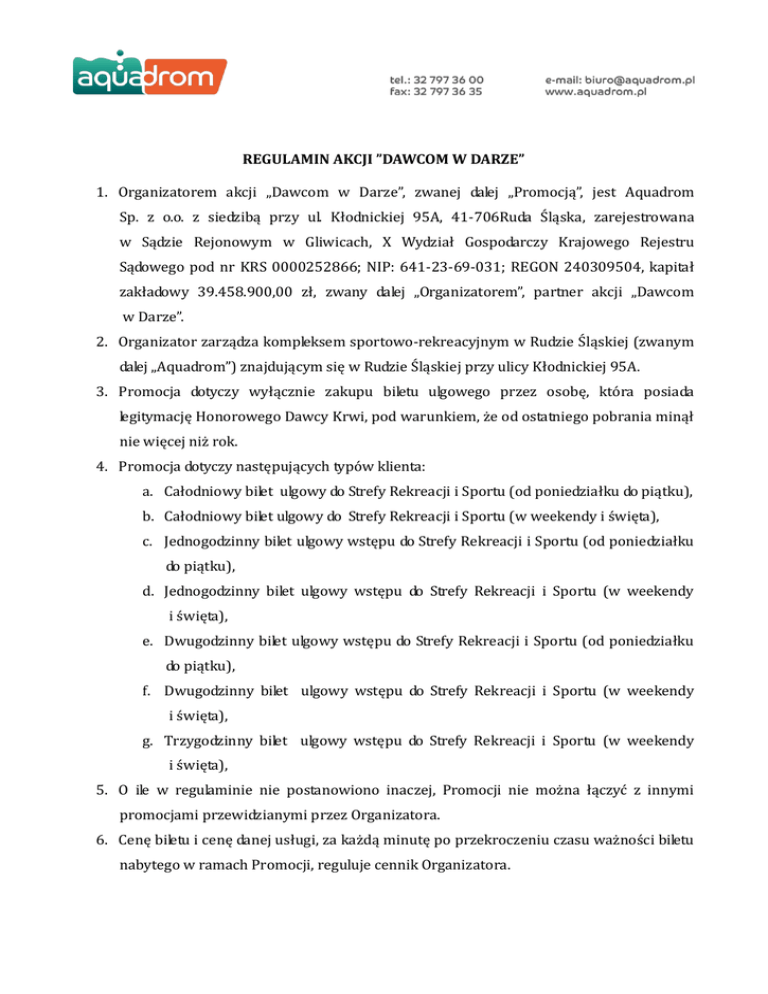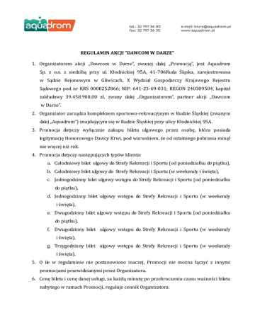 REGULAMIN AKCJI ”DAWCOM W DARZE” 1. Organizatorem akcji „Dawcom w Darze”, zwanej dalej „Promocją”, jest Aquadrom Sp. z o.o. z siedzibą przy ul. Kłodnickiej 95A, 41-706Ruda Śląska, zarejestrowana w Sądzie Rejonowym w Gliwicach, X Wydział Gospodarczy Krajowego Rejestru Sądowego pod nr KRS 0000252866; NIP: 641-23-69-031; REGON 240309504, kapitał zakładowy 39.458.900,00 zł, zwany dalej „Organizatorem”, partner akcji „Dawcom w Darze”. 2. Organizator zarządza kompleksem sportowo-rekreacyjnym w Rudzie Śląskiej (zwanym dalej „Aquadrom”) znajdującym się w Rudzie Śląskiej przy ulicy Kłodnickiej 95A. 3. Promocja dotyczy wyłącznie zakupu biletu ulgowego przez osobę, która posiada legitymację Honorowego Dawcy Krwi, pod warunkiem, że od ostatniego pobrania minął nie więcej niż rok. 4. Promocja dotyczy następujących typów klienta: a. Całodniowy bilet ulgowy do Strefy Rekreacji i Sportu (od poniedziałku do piątku), b. Całodniowy bilet ulgowy do Strefy Rekreacji i Sportu (w weekendy i święta), c. Jednogodzinny bilet ulgowy wstępu do Strefy Rekreacji i Sportu (od poniedziałku do piątku), d. Jednogodzinny bilet ulgowy wstępu do Strefy Rekreacji i Sportu (w weekendy i święta), e. Dwugodzinny bilet ulgowy wstępu do Strefy Rekreacji i Sportu (od poniedziałku do piątku), f. Dwugodzinny bilet ulgowy wstępu do Strefy Rekreacji i Sportu (w weekendy i święta), g. Trzygodzinny bilet ulgowy wstępu do Strefy Rekreacji i Sportu (w weekendy i święta), 5. O ile w regulaminie nie postanowiono inaczej, Promocji nie można łączyć z innymi promocjami przewidzianymi przez Organizatora. 6. Cenę biletu i cenę danej usługi, za każdą minutę po przekroczeniu czasu ważności biletu nabytego w ramach Promocji, reguluje cennik Organizatora. 7. Z promocji może skorzystać wyłącznie osoba posiadająca legitymację Honorowego Dawcy Krwi. Legitymacje Honorowego Dawcy Krwi, które nie posiadają zdjęcia, będą przez Organizatora dodatkowo weryfikowane dowodem osobistym Honorowego Dawcy Krwi. 8. Na podstawie legitymacji Honorowego Dawcy Krwi można dokonać jednorazowo zakupu jednego biletu wstępu objętego Promocją, który zostanie wykorzystany przez posiadacza legitymacji. Promocja obowiązuje przy każdym okazaniu legitymacji Honorowego Dawcy Krwi, z uwzględnieniem postanowień zdania poprzedniego oraz pkt 12 Regulaminu. 9. Promocja poza wskazanym w regulaminie biletem wstępu, nie dotyczy innych, dodatkowo odpłatnych atrakcji (nie objętych niniejszym regulaminem), m.in. w tym gastronomii oraz sklepu sportowego, za które Klient uiszcza opłatę na zasadach ogólnych. 10. Promocja obowiązuje od 1 sierpnia 2016r. do odwołania. 11. Organizator zastrzega sobie prawo zmiany warunków Promocji poprzez dodanie do oferty nowych usług objętych rabatem. Aktualne usługi objęte promocją publikowane będą na stronie www.aquadrom.pl 12. Organizator może czasowo ograniczyć wejście Klientów do „Aquadromu” z powodu osiągnięcia maksymalnej ilości gości. 13. Organizator nie gwarantuje dostępu do każdej strefy, atrakcji i urządzeń w każdym czasie, w szczególności z powodu konieczności prowadzenia remontów lub konserwacji, względnie wykorzystania poszczególnych stref lub atrakcji dla dedykowanych zajęć i z tego tytułu nie ponosi żadnej odpowiedzialności. Każda osoba zamierzająca korzystać z „Aquadrom-u” może uzyskać informację o zakresie usług świadczonych w danym czasie bądź występujących w tej mierze ograniczeń przed skorzystaniem z danej usługi. Decyzje co do korzystania z ograniczonych usług „Aquadromu” podejmuje na własne ryzyko. 14. Uczestnik promocji przyjmuje do wiadomości, że korzystając z promocji zobowiązany jest do przestrzegania oraz podlega ograniczeniom przewidzianym w Regulaminie korzystania z Aquadromu, dostępnym w recepcji Aquadromu oraz na stronie internetowej www.aquadrom.pl