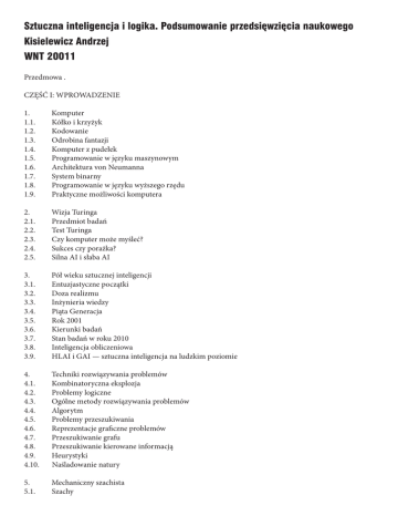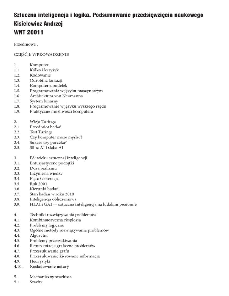 Sztuczna inteligencja i logika. Podsumowanie przedsięwzięcia naukowego Kisielewicz Andrzej WNT 20011 Przedmowa . CZĘŚĆ I: WPROWADZENIE 1. 1.1. 1.2. 1.3. 1.4. 1.5. 1.6. 1.7. 1.8. 1.9. Komputer Kółko i krzyżyk Kodowanie Odrobina fantazji Komputer z pudełek Programowanie w języku maszynowym Architektura von Neumanna System binarny Programowanie w języku wyższego rzędu Praktyczne możliwości komputera 2. 2.1. 2.2. 2.3. 2.4. 2.5. Wizja Turinga Przedmiot badań Test Turinga Czy komputer może myśleć? Sukces czy porażka? Silna AI i słaba AI 3. 3.1. 3.2. 3.3. 3.4. 3.5. 3.6. 3.7. 3.8. 3.9. Pół wieku sztucznej inteligencji Entuzjastyczne początki Doza realizmu Inżynieria wiedzy Piąta Generacja Rok 2001 Kierunki badań Stan badań w roku 2010 Inteligencja obliczeniowa HLAI i GAI — sztuczna inteligencja na ludzkim poziomie 4. 4.1. 4.2. 4.3. 4.4. 4.5. 4.6. 4.7. 4.8. 4.9. 4.10. Techniki rozwiązywania problemów Kombinatoryczna eksplozja Problemy logiczne Ogólne metody rozwiązywania problemów Algorytm Problemy przeszukiwania Reprezentacje graficzne problemów Przeszukiwanie grafu Przeszukiwanie kierowane informacją Heurystyki Naśladowanie natury 5. 5.1. Mechaniczny szachista Szachy 5.2. 5.3. 5.4. 5.5. 5.6. 5.7. 5.8. Minimax i strategie gry Funkcja ewaluacyjna Algorytm alfa-beta Sukces Warcaby Go Dalsze perspektywy 6. 6.1. 6.2. 6.3. 6.4. 6.5. 6.6. 6.7. 6.8. 6.9. 6.10. Dwa tysiące lat logiki Arystoteles Piąty postulat Wizje Leibniza Obalenie Euklidesa Matematyzacja logiki Światowy kongres matematyczny Antyriornie Program Hilberta Nierozstrzygalność Istota obliczania 7. Idee współczesnej matematyki 7. l. Odkrycie liczby niewymiernej 7.2. Rachunek prawdopodobieństwa 7.3. Wzór Bayesa 7.4. Wielkie twierdzenie Fermata 7.5. Problem czterech barw 7.6. Matematyka dyskretna 7.7. Zawodna intuicja 7.8. Ciała i grupy 7.9. Teoria zbiorów 7.10. Co to jest liczba? 7.11. Paradoksy nieskończoności 7.12. Argument przekątniowy 7.13. Twierdzenie Cantora 7.14. Zbiór wszystkich słów CZĘŚĆ II: LOGIKA 8. 8.1. 8.2. 8.3. 8.4. 8.5. 8.6. 8.7. 8.8. 8.9. 9. 9.1. 9.2. 9.3. 9.4. Klasyczny rachunek zdań Sylogistyka Rachunek zdań Koniunkcja i alternatywa Implikacja Negacja Inne spójniki Metoda zero-jedynkowa Schematy wnioskowań Inne ujęcia Pełna formalizacja Kwantyfikatory Relacje Aksjomatyzacja Teorie 9.5. 9.6. 9.7. 9.8. 9.9. 9.10. 9.11. 9.12. 9.13. 9.14. Formalizacja języka matematyki Hipoteza Goldbacha Język formalny Termy Formuły Zmienne Aksjomaty logiczne Reguły wnioskowania Arytmetyka elementarna Twierdzenia i dowody 10. 10.1. 10.2. 10.3. 10.4. 10.5. 10.6. 10.7. 10.8. 10.9. 10.10. 10.11. 10.12. 10.13. Metamatematyka Semantyka Definicja prawdy Twierdzenie Godła o pełności Twierdzenie o niesprzeczności Redukcja pojęć Redukcja matematyki do logiki Antynomie Aksjomatyzacja teorii zbiorów System ZF Aksjomatyzacja matematyki Aksjomat wyboru Program Hilberta Półrozstrzygalność 11. 11.1. 11.2. 11.3. 11.4. 11.5. 11.6. Twierdzenie Godła Formalizacja metamatematyki Dowód Immanentna niezupełność Nieudowadnialność niesprzeczności Nierozstrzygalność logiki Metateoria 12. 12.1. 12.2. 12.3. 12.4. 12.5. 12.6. Teoria obliczeń Wyrażenia i termy Algorytm Efektywne rozstrzyganie Kodowanie Kodowanie binarne Funkcje rekurencyjne 13. 13.1. 13.2. 13.3. 13.4. 13.5. 13.6. 13.7. 13.8. 13.9. Maszyny Turinga Definicja maszyny Turinga Przykład I Obliczanie funkcji Przykład II Równoważność definicji Maszyna RAM Teza Churcha Rozstrzygalność Języki formalne 13.10. 13.11. 13.12. 13.13. 13.14. Rozumowanie Klasy rekurencyjności Argument z teorii mnogości Problem stopu Inne problemy nierozstrzygalne 14. 14.1. 14.2. 14.3. 14.4. 14.5. 14.6. 14.7. Praktyka obliczeń Teoria i praktyka Algorytmy praktyczne Czas wielomianowy Złożoność obliczeniowa Klasa NP P^NP Szyfrowanie 15. 15.1. 15.2. 15.3. 15.4. 15.5. 15.6. 15.7. 15.8. 15.9. 15.10. 15.11. 15.12. 15.13. 15.14. 15.15. Logiki nieklasyczne i metodologia nauk Logiki wielowartościowe Logiki rnodalne Logika intuicjonistyczna Logiki dopuszczające sprzeczność Logika rozmyta Logika indukcji Wiedza analityczna i syntetyczna Bayesianizm Zakład holenderski Logika prawdopodobieństwa Logika nieformalna Dedukcjonizm Metodologia nauk Definicje Braki logiki formalnej CZĘŚĆ III: SZTUCZNA INTELIGENCJA 16. Inżynieria wiedzy 16.1. Bazy wiedzy 16.2. Mechanizm wnioskowania 6.3. Rezolucja 16.4. Koriiunkcyjna postać normalna 16.5. Eliminacja kwantyfikatorów 16.6. Unifikacja 16.7. W kierunku praktyki 16.8. Walka z kombinatoryczną eksplozją 16.9. Automatyczne dowodzenie twierdzeń 16.10. Hipoteza Robbinsa 16.11. Programowanie logiczne 16.12. Systemy ekspertowe 17. 17.1. 17.2. 17.3. Rozumowania zdroworozsądkowe Formalizacja wiedzy zdroworozsądkowej Ontologia CYC 17.4. Ramy i sieci semantyczne 17.5. Logiki deskrypcji 17.6. Kłopoty z logiką pierwszego rzędu 17.7. Niepewność wiedzy 17.8. Sieci bayesowskie 17.9. Logiki niemonotoniczne 17.10. Logika domniemań 17.11. Perspektywy 18. Inteligencja obliczeniowa 18.1. Obliczeniowy model mózgu 18.2. Perceptron 18.3. Uczenie neuronu 18.4. Sztuczne sieci neuronowe 18.5. Perspektywy sieci neuronowych 18.6. Mózg i komputer 18.7. Algorytmy genetyczne 18.8. Obliczenia ewolucyjne 18.9. Inteligencja rojowiska 18.10. Inteligencja obliczeniowa 18.11. Perspektywy inteligencji obliczeniowej 19. 19.1. 19.2. 19.3. 19.4. 19.5. 19.6. 19.7. 19.8. 19.9. Maszyny uczące się Drzewa decyzyjne Funkcje boolowskie i hipotezy Uczące się programy Uczenie gier logicznych Teoria uczenia się Uczenie obliczeniowe Ogólna teoria wnioskowania indukcyjnego Prawdopodobieństwo algorytmiczne Maszyna Godła 20. Przetwarzanie języka naturalnego 20.1. Trzy problemy 20.2. Rozpoznawanie mowy 20.3. Struktura gramatyczna 0.4. Analiza znaczenia 20.5. Znaczenie zdania 20.6. NLP 20.7. Tłumaczenie maszynowe 20.8. Mówiące bazy danych 20.9. Komputer rozumny 20.10. Wyszukiwanie informacji 20.11. Chatboty i inne 21. 21.1. 21.2. 2