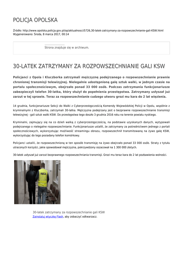 POLICJA OPOLSKA Źródło: http://www.opolska.policja.gov.pl/op/aktualnosci/5726,30-latek-zatrzymany-za-rozpowszechnianie-gali-KSW.html Wygenerowano: Środa, 8 marca 2017, 00:14 Strona znajduje się w archiwum. 30-LATEK ZATRZYMANY ZA ROZPOWSZECHNIANIE GALI KSW Policjanci z Opola i Kluczborka zatrzymali mężczyznę podejrzanego o rozpowszechnianie prawnie chronionej transmisji telewizyjnej. Nielegalnie udostępnioną galę sztuk walki, w jednym czasie na portalu społecznościowym, obejrzało ponad 33 000 osób. Podczas zatrzymania funkcjonariusze zabezpieczyli telefon 30-latka, który służył do popełnienia przestępstwa. Zatrzymany usłyszał już zarzut w tej sprawie. Teraz za rozpowszechnianie cudzego utworu grozi mu kara do 2 lat więzienia. 14 grudnia, funkcjonariusze Sekcji do Walki z Cyberprzestępczością Komendy Wojewódzkiej Policji w Opolu, wspólnie z kryminalnymi z Kluczborka, zatrzymali 30-latka. Mężczyzna podejrzany jest o bezprawne rozpowszechnianie transmisji telewizyjnej - gali sztuk walki KSW. Do przestępstwa tego doszło 3 grudnia 2016 roku na terenie powiatu nyskiego. Kryminalni, zajmujący się na co dzień walką z cyberprzestępczością, na podstawie uzyskanych danych, wytypowali podejrzanego o nielegalne rozpowszechnianie. Funkcjonariusze ustalili, że zatrzymany za pośrednictwem jednego z portali społecznościowych, wykorzystując możliwość streamingu obrazu, rozpowszechnił transmitowaną na żywo galę KSW, wykorzystując do tego posiadany telefon komórkowy. Policjanci ustalili, że rozpowszechnioną w ten sposób transmisję na żywo obejrzało ponad 33 000 osób. Straty z tytułu utraconych korzyści, jakie spowodował mężczyzna, pokrzywdzony oszacował na 1 300 000 złotych. 30-latek usłyszał już zarzut bezprawnego rozpowszechniania transmisji. Grozi mu teraz kara do 2 lat pozbawienia wolności. 30-latek zatrzymany za rozpowszechnianie gali KSW Zainstaluj wtyczkę Flash, aby zobaczyć odtwarzacz. Ocena: 5/5 (1) Tweetnij 30-latek zatrzymany za rozpowszechnianie gali KSW, cyberprzestępczość