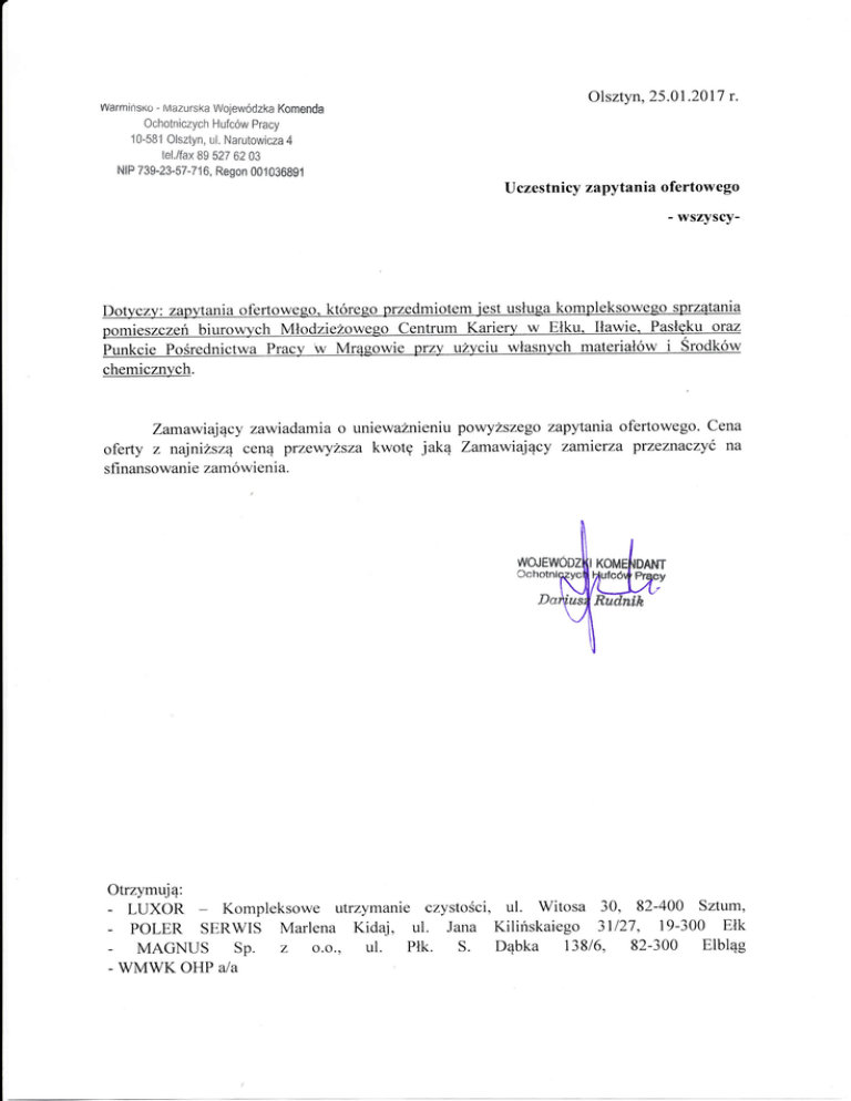 Olsztyn,25.0I.2017 Warmiń§Ko - Mazurska Wojewódzka Komenda r. Ochotniczych Hufców Pracy 10-58,1 Olsztyn, ul, Narutowicza 4 tel./fax 89 527 62 03 NlP 739-23.57-716, Reson 001036891 Uczestnicy zapytania ofertowego - w§Zyscy- ń biu Centrum w Ełku własnvch Ia i Z Srodków chemicznvch. Zamawiający zawiadamia o uniewaznlenlu powy ższego zapytania ofertowego. Cena oferty z nĄniższą ceną przewyższa kwotę jaką Zamawiający zamierza przeznaczyó na sfinansowanie zamówienia. Otrzymują: - LUXOR Kompleksowe utrzymanie czystości, ul. Witosa 30, 82-400 Sztum, - POLER SERWIS Marlena Kidaj, ul, Jana Kilińskaiego 31l27, l9-300 Ełk - MAGNUS Sp. z o.o,) ul. Płk. S. Dąbka 73816, 82-300 Elbląg - WMWK OHP a/a