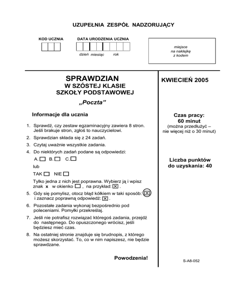 UZUPEŁNIA ZESPÓŁ NADZORUJĄCY KOD UCZNIA DATA URODZENIA UCZNIA dzień miesiąc miejsce na naklejkę z kodem rok SPRAWDZIAN KWIECIEŃ 2005 W SZÓSTEJ KLASIE SZKOŁY PODSTAWOWEJ „Poczta” Informacje dla ucznia Czas pracy: 60 minut 1. Sprawdź, czy zestaw egzaminacyjny zawiera 8 stron. Jeśli brakuje stron, zgłoś to nauczycielowi. (moŜna przedłuŜyć – nie więcej niŜ o 30 minut) 2. Sprawdzian składa się z 24 zadań. 3. Czytaj uwaŜnie wszystkie zadania. 4. Do niektórych zadań podane są odpowiedzi: A. B. C. Liczba punktów do uzyskania: 40 lub TAK NIE Tylko jedna z nich jest poprawna. Wybierz ją i wpisz znak x w okienko , na przykład: . 5. Gdy się pomylisz, otocz błąd kółkiem w taki sposób: i zaznacz poprawną odpowiedź: . 6. Pozostałe zadania wykonaj bezpośrednio pod poleceniami. Pomyłki przekreślaj. 7. Jeśli nie potrafisz rozwiązać któregoś zadania, przejdź do następnego. Do opuszczonego wrócisz, jeśli będziesz mieć czas. 8. Na ostatniej stronie znajduje się brudnopis, z którego moŜesz skorzystać. To, co w nim napiszesz, nie będzie sprawdzane. Powodzenia! S-A8-052 ul. Lipowa N ul. Dębowa Zapoznaj się z planem i rozwiąŜ zadania: 1., 2. i 3. Legenda pomnik przystanek PKS muzeum ul. Klonowa poczta zabudowania skala 1:5000 Zadanie 1. Zaznacz poprawną odpowiedź. Symbolem oznaczono A. B. C. pomnik. pocztę. zabudowania. Zadanie 2. Zaznacz TAK, jeśli zdanie jest prawdziwe, a NIE, jeśli jest fałszywe. Muzeum znajduje się przy ulicy Dębowej. TAK Odległości w terenie są pięć tysięcy razy większe niŜ na planie. TAK Zadanie 3. Zaznacz poprawną odpowiedź. Aby dojść z poczty do przystanku PKS, naleŜy iść w kierunku A. B. C. północnym. wschodnim. południowym. Zadanie 4. Podkreśl nazwy trzech artykułów, które kupisz na poczcie. koperty, chleb, masło, znaczki, syrop od kaszlu, kartki pocztowe Zadanie 5. Połącz rodzaj czasopisma z informacją, jak często się ono ukazuje. raz na tydzień tygodnik raz na dwa tygodnie dziennik raz w miesiącu miesięcznik raz na trzy miesiące kwartalnik kilka razy w tygodniu 2 NIE NIE Zadanie 6. Chcesz napisać list do osoby o zainteresowaniach podobnych do Twoich. W jakim dziale czasopisma młodzieŜowego naleŜy szukać adresu takiej osoby? Zaznacz poprawną odpowiedź. A. B. C. Śmieszne łamigłówki. Poznajmy się. Zapowiedzi. Zadanie 7. Napisz list do koleŜanki lub kolegi. Przedstaw w nim, czym się interesujesz, jak lubisz spędzać wolny czas. ___________________________________________________________________ ___________________________________________________________________ ___________________________________________________________________ ___________________________________________________________________ ___________________________________________________________________ ___________________________________________________________________ ___________________________________________________________________ ___________________________________________________________________ ___________________________________________________________________ ___________________________________________________________________ ___________________________________________________________________ ___________________________________________________________________ ___________________________________________________________________ ___________________________________________________________________ ___________________________________________________________________ ___________________________________________________________________ ___________________________________________________________________ ___________________________________________________________________ 3 Zadanie 8. Wysyłany list nie moŜe waŜyć więcej niŜ 2000 gramów. Uzupełnij zdanie. 2000 g to _____________ kg. Zadanie 9. Poczta jest czynna od 900 do 1700. Narysuj wskazówki na tarczy zegara tak, aby pokazywały godzinę zamknięcia poczty. · Zadanie 10. W Polsce poczta powstała w 1558 roku. Ile lat upłynęło od tego wydarzenia do roku 2005? Zapisz obliczenia i odpowiedź. Odpowiedź: Od powstania poczty w Polsce do 2005 roku upłynęło ___________ lat. Przeczytaj tekst. RozwiąŜ zadania: 11., 12. i 13. Do opakowania paczki uŜyj mocnego pudełka kartonowego. Zabezpiecz ją, uŜywając papieru oraz taśmy samoprzylepnej lub sznurka. Paczkę zaadresuj czytelnie, podając adresata i nadawcę. Zadanie 11. Zaznacz poprawną odpowiedź. PowyŜszy tekst to A. B. C. 4 zaproszenie. ogłoszenie. instrukcja. Zadanie 12. Zaznacz poprawną odpowiedź. Z tekstu dowiadujemy się, jak A. B. C. zaadresować kartkę pocztową. przygotować paczkę pocztową. wypełnić przekaz pocztowy. Zadanie 13. Zaznacz TAK, jeśli zdanie jest prawdziwe, a NIE, jeśli jest fałszywe. Paczkę naleŜy zapakować w pudełko kartonowe. Na paczce naleŜy podać tylko adres nadawcy. TAK TAK NIE NIE Zadanie 14. Przeczytaj fragment Spisu Pocztowych Numerów Adresowych 55-070 63-743 16-405 Smolec Smolice Smolniki Zaznacz poprawną odpowiedź. Na przesyłce do miejscowości Smolice naleŜy wpisać kod pocztowy A. B. C. 55-070 63-743 16-405 Zadanie 15. Zaznacz poprawną odpowiedź. CięŜar przesyłki ustala się za pomocą A. B. C. zegara. linijki. wagi. Zadanie 16. Zaznacz TAK, jeśli zdanie jest prawdziwe, a NIE, jeśli jest fałszywe. Przedmioty ze szkła są kruche, łatwo się tłuką, dlatego wysyłając szklane rzeczy w paczce, powinniśmy zadbać o ich właściwe opakowanie. TAK NIE Zadanie 17. Dokończ zdanie, wpisując właściwy wyraz z podanych: szkło, papier, plastik. Paczkę zapakowano w pudełko kartonowe. Po wyjęciu zawartości opakowanie po paczce moŜna wyrzucić do pojemnika na śmieci z napisem ___________________. 5 Zadanie 18. Idąc na pocztę, trzeba przejść przez skrzyŜowanie z sygnalizacją świetlną. Dokończ zdanie. Przez skrzyŜowanie moŜna przejść tylko wówczas, gdy zapalone jest światło w kolorze _____________________________