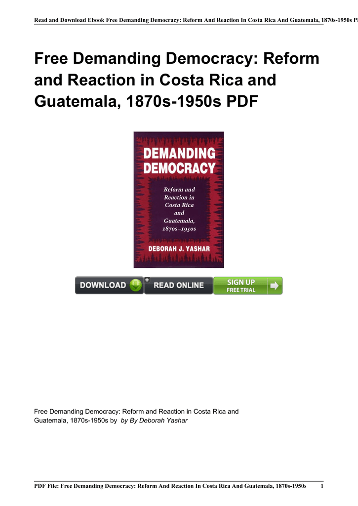 Read and Download Ebook Free Demanding Democracy: Reform And Reaction In Costa Rica And Guatemala, 1870s-1950s PD Free Demanding Democracy: Reform and Reaction in Costa Rica and Guatemala, 1870s-1950s PDF Free Demanding Democracy: Reform and Reaction in Costa Rica and Guatemala, 1870s-1950s by by By Deborah Yashar PDF File: Free Demanding Democracy: Reform And Reaction In Costa Rica And Guatemala, 1870s-1950s 1 Read and Download Ebook Free Demanding Democracy: Reform And Reaction In Costa Rica And Guatemala, 1870s-1950s PD Free Demanding Democracy: Reform and Reaction in Costa Rica and Guatemala, 1870s-1950s PDF Free Demanding Democracy: Reform and Reaction in Costa Rica and Guatemala, 1870s1950s by by By Deborah Yashar ->>>Download: Free Demanding Democracy: Reform and Reaction in Costa Rica and Guatemala, 1870s-1950s PDF ->>>Read Online: Free Demanding Democracy: Reform and Reaction in Costa Rica and Guatemala, 1870s-1950s PDF PDF File: Free Demanding Democracy: Reform And Reaction In Costa Rica And Guatemala, 1870s-1950s 2 Read and Download Ebook Free Demanding Democracy: Reform And Reaction In Costa Rica And Guatemala, 1870s-1950s PD Free Demanding Democracy: Reform and Reaction in Costa Rica and Guatemala, 1870s-1950s Review This Free Demanding Democracy: Reform and Reaction in Costa Rica and Guatemala, 1870s1950s book is not really ordinary book, you have it then the world is in your hands. The benefit you get by reading this book is actually information inside this reserve incredible fresh, you will get information which is getting deeper an individual read a lot of information you will get. This kind of Free Demanding Democracy: Reform and Reaction in Costa Rica and Guatemala, 1870s-1950s without we recognize teach the one who looking at it become critical in imagining and analyzing. Don’t be worry Free Demanding Democracy: Reform and Reaction in Costa Rica and Guatemala, 1870s-1950s can bring any time you are and not make your tote space or bookshelves’ grow to be full because you can have it inside your lovely laptop even cell phone. This Free Demanding Democracy: Reform and Reaction in Costa Rica and Guatemala, 1870s-1950s having great arrangement in word and layout, so you will not really feel uninterested in reading. PDF File: Free Demanding Democracy: Reform And Reaction In Costa Rica And Guatemala, 1870s-1950s 3