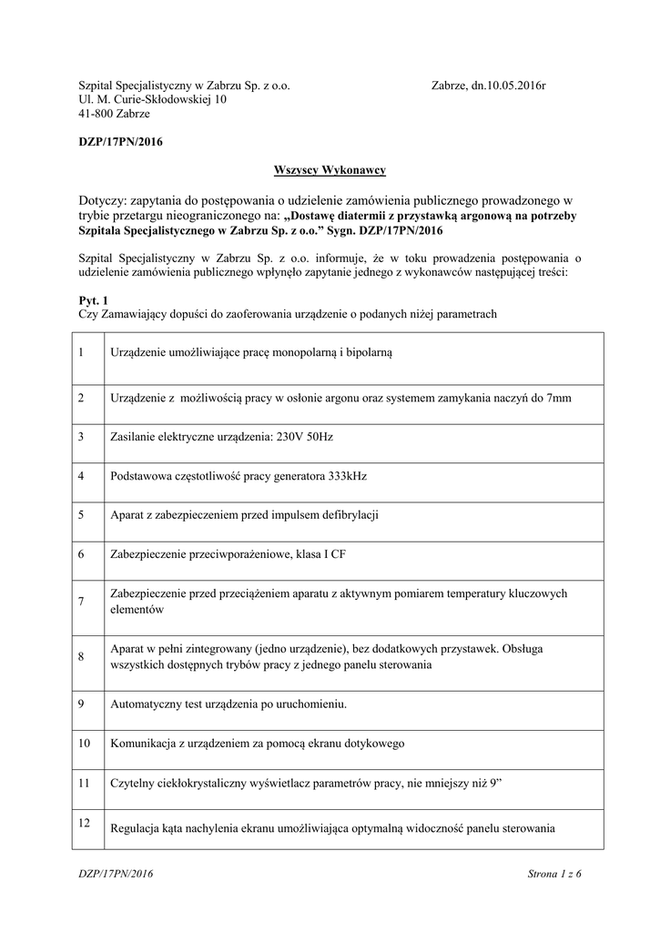 odp 1 DZP17PN2016 - Szpital Specjalistyczny w Zabrzu