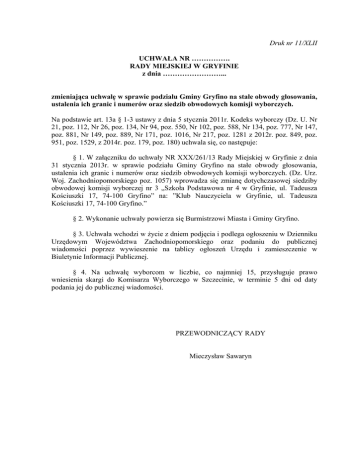 Druk nr 11/XLII UCHWAŁA NR ……………. RADY MIEJSKIEJ W GRYFINIE z dnia ……………………... zmieniająca uchwałę w sprawie podziału Gminy Gryfino na stałe obwody głosowania, ustalenia ich granic i numerów oraz siedzib obwodowych komisji wyborczych. Na podstawie art. 13a § 1-3 ustawy z dnia 5 stycznia 2011r. Kodeks wyborczy (Dz. U. Nr 21, poz. 112, Nr 26, poz. 134, Nr 94, poz. 550, Nr 102, poz. 588, Nr 134, poz. 777, Nr 147, poz. 881, Nr 149, poz. 889, Nr 171, poz. 1016, Nr 217, poz. 1281 z 2012r. poz. 849, poz. 951, poz. 1529, z 2014r. poz. 179, poz. 180) uchwala się, co następuje: § 1. W załączniku do uchwały NR XXX/261/13 Rady Miejskiej w Gryfinie z dnia 31 stycznia 2013r. w sprawie podziału Gminy Gryfino na stałe obwody głosowania, ustalenia ich granic i numerów oraz siedzib obwodowych komisji wyborczych. (Dz. Urz. Woj. Zachodniopomorskiego poz. 1057) wprowadza się zmianę dotychczasowej siedziby obwodowej komisji wyborczej nr 3 „Szkoła Podstawowa nr 4 w Gryfinie, ul. Tadeusza Kościuszki 17, 74-100 Gryfino” na: ”Klub Nauczyciela w Gryfinie, ul. Tadeusza Kościuszki 17, 74-100 Gryfino.” § 2. Wykonanie uchwały powierza się Burmistrzowi Miasta i Gminy Gryfino. § 3. Uchwała wchodzi w życie z dniem podjęcia i podlega ogłoszeniu w Dzienniku Urzędowym Województwa Zachodniopomorskiego oraz podaniu do publicznej wiadomości poprzez wywieszenie na tablicy ogłoszeń Urzędu i zamieszczenie w Biuletynie Informacji Publicznej. § 4. Na uchwałę wyborcom w liczbie, co najmniej 15, przysługuje prawo wniesienia skargi do Komisarza Wyborczego w Szczecinie, w terminie 5 dni od daty podania jej do publicznej wiadomości. PRZEWODNICZĄCY RADY Mieczysław Sawaryn Numer stałego obwodu wyborczego 1. 2. 3. 4. 5. 6. 7. 8. 9. 10. Granice obwodu wyborczego Część miasta Gryfina obejmująca ulice: Flisaczą, Łączną, Pionierów, Szczecińską Część miasta Gryfina obejmująca ulice: Bolesława Chrobrego numer 33 i od numeru 50 do 54, Bolesława Krzywoustego, Garbarską, Grunwaldzką, 1 Maja, Słowiańską, Sprzymierzonych, Targową Część miasta Gryfina obejmująca ulice: Bałtycką, Energetyków, Kościelną numery nieparzyste, Nadodrzańską, Piastów numery parzyste od 6 i numery nieparzyste, Tadeusza Kościuszki, Część miasta Gryfina obejmująca ulice: Bolesława Chrobrego numery parzyste od 2 do 38 i numery nieparzyste od 1 do 19, Kościelną numery parzyste, Niepodległości, Parkową, Piastów numer 4 Część miasta Gryfina obejmująca ulice: Adama Rapackiego, Armii Krajowej numery parzyste od 2 do 10, Ks.Jerzego Popiełuszki, Łużycką numery parzyste od 2 do 34 i numery nieparzyste od 1 do 29, Sportową, Władysława Łokietka, Łużycką numery parzyste od 36 do 82 i numery nieparzyste od 31 do 87, Mieszka I, Podgórną, Wincentego Witosa, Wodnika Część miasta Gryfina obejmująca ulice: Brzozową, Czechosłowacką, Generała Andersa, Łużycką numery parzyste od 84 do końca i numery nieparzyste od 89 do końca, Wierzbową, Topolową Część miasta Gryfina obejmująca ulice: Adama Mickiewicza, Aleksandra Fredry, Armii Krajowej numery parzyste od 12 do końca i numery nieparzyste, Artyleryjską, Bolesława Prusa, Czesława Miłosza, Elizy Orzeszkowej, Henryka Sienkiewicza, Jana Kochanowskiego, Juliusza Słowackiego, Kwiatową, Lechicką, Letnią, Mikołaja Reja, 9 Maja od numeru 15 do końca, Ogrodową, Okrężną, Pogodną, Słoneczną, Stanisława Wyspiańskiego, Stefana Żeromskiego, Władysława Reymonta, Zygmunta Krasińskiego numery nieparzyste od 1 do 11a i numery parzyste od 2 do 38, Część miasta Gryfina obejmująca ulice: Adama Asnyka, Zygmunta Krasińskiego numery parzyste od 40 do 66 i numery nieparzyste od 13 do 27 Część miasta Gryfina obejmująca ulice: Jana Pawła II, Jarosława Iwaszkiewicza numery nieparzyste od 15 do 25 i numery parzyste od 30 do 66, Zygmunta Krasińskiego numery parzyste od 68 do 110 Część miasta Gryfina obejmująca ulice: Jarosława Iwaszkiewicza numery nieparzyste od 1 do 7, 11 Listopada numery od 100 do końca, Zygmunta Krasińskiego numery nieparzyste od 33 do 135 Siedziba obwodowej komisji wyborczej Gryfiński Dom Kultury w Gryfinie ul. Szczecińska 17 74-100 Gryfino Przedszkole nr 2 w Gryfinie ul. Bolesława Krzywoustego 5 74-100 Gryfino Klub Nauczyciela w Gryfinie ul. Tadeusza Kościuszki 17 74-100 Gryfino Zespół Szkół Ogólnokształcących w Gryfinie ul. Niepodległości 16 74-100 Gryfino Szkoła Podstawowa nr 1 w Gryfinie ul. Łużycka 22 74-100 Gryfino Zespół Szkół Ponadgimnazjalnych nr 2 w Gryfinie ul. Łużycka 91 74-100 Gryfino Przedszkole nr 5 w Gryfinie ul. Stefana Żeromskiego 12 74-100 Gryfino Przedszkole nr 3 w Gryfinie ul. Zygmunta Krasińskiego 29 74-100 Gryfino Zespół Szkół w Gryfinie ul. Jarosława Iwaszkiewicza 70 74-100 Gryfino Biblioteka Publiczna Filia Górny Taras w Gryfinie ul. Krasińskiego 87a 74-100 Gryfino 11. 12. 13. 14. 15. 16. 17. 18. 19. Część miasta Gryfina obejmująca ulice: Kolejową, 11 Listopada numery od 2 do 28 i numery od 64 do 80, 9 Maja numery od 5 do 13, Marii Konopnickiej 9 Maja numery od 1 do 2, Jarosława Iwaszkiewicza numery nieparzyste od 9 do 13 i numery parzyste od 2 do 28, 11 Listopada numery od 30 do 62 i numery od 82 do 88, Wojska Polskiego numery parzyste, Zygmunta Krasińskiego numery nieparzyste od 137 do 151 Część miasta Gryfina obejmująca ulice: Bolesława Limanowskiego, Hugo Kołłątaja, Krótką, Kujawską, Mazowiecką, Mazurską, Opolską, Orląt Lwowskich, Podlaską, Pomorską, Przytulną, Stanisława Staszica, Śląską, Wojska Polskiego numery nieparzyste, Fabryczną, Rybacką, Wodną, Zielną, Sołectwo Czepino obejmujące miejscowości: Czepino, Nowe Brynki Sołectwo Stare Brynki obejmujące miejscowości: Raczki, Stare Brynki, Sołectwo Żabnica obejmujące miejscowości: Dębce, Żabnica Sołectwo Chlebowo obejmujące miejscowość: Chlebowo, Sołectwo Daleszewo obejmujące miejscowości: Daleszew