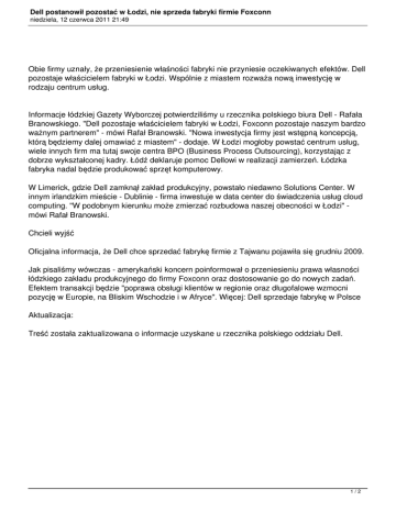 Dell postanowił pozostać w Łodzi, nie sprzeda fabryki firmie Foxconn niedziela, 12 czerwca 2011 21:49 Obie firmy uznały, że przeniesienie właśności fabryki nie przyniesie oczekiwanych efektów. Dell pozostaje właścicielem fabryki w Łodzi. Wspólnie z miastem rozważa nową inwestycję w rodzaju centrum usług. Informacje łódzkiej Gazety Wyborczej potwierdziliśmy u rzecznika polskiego biura Dell - Rafała Branowskiego. "Dell pozostaje właścicielem fabryki w Łodzi, Foxconn pozostaje naszym bardzo ważnym partnerem" - mówi Rafał Branowski. "Nowa inwestycja firmy jest wstępną koncepcją, którą będziemy dalej omawiać z miastem" - dodaje. W Łodzi mogłoby powstać centrum usług, wiele innych firm ma tutaj swoje centra BPO (Business Process Outsourcing), korzystając z dobrze wykształconej kadry. Łódź deklaruje pomoc Dellowi w realizacji zamierzeń. Łódzka fabryka nadal będzie produkować sprzęt komputerowy. W Limerick, gdzie Dell zamknął zakład produkcyjny, powstało niedawno Solutions Center. W innym irlandzkim mieście - Dublinie - firma inwestuje w data center do świadczenia usług cloud computing. "W podobnym kierunku może zmierzać rozbudowa naszej obecności w Łodzi" mówi Rafał Branowski. Chcieli wyjść Oficjalna informacja, że Dell chce sprzedać fabrykę firmie z Tajwanu pojawiła się grudniu 2009. Jak pisaliśmy wówczas - amerykański koncern poinformował o przeniesieniu prawa własności łódzkiego zakładu produkcyjnego do firmy Foxconn oraz dostosowanie go do nowych zadań. Efektem transakcji będzie "poprawa obsługi klientów w regionie oraz długofalowe wzmocni pozycję w Europie, na Bliskim Wschodzie i w Afryce". Więcej: Dell sprzedaje fabrykę w Polsce Aktualizacja: Treść została zaktualizowana o informacje uzyskane u rzecznika polskiego oddziału Dell. 1/2 Dell postanowił pozostać w Łodzi, nie sprzeda fabryki firmie Foxconn niedziela, 12 czerwca 2011 21:49 źrodło: computerword.pl 2/2