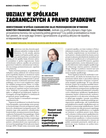 biznes z każdej strony Ü opinie Udziały w spółkach zagranicznych a prawo spadkowe Inwestowanie w spółki zagraniczne daje przedsiębiorcom wymierne korzyści finansowe oraz podatkowe. Jednak czy profity płynące z tego typu prowadzenia biznesu nie są kwestią jednej generacji? Czy polski przedsiębiorca może być pewien, że w razie jego śmierci zgromadzone za granicą aktywa nie wpadną w niepowołane ręce? mec. Robert Nogacki, właściciel Kancelarii Prawnej Skarbiec N a pierwszy rzut oka, kwestia spadkobrania udziałów wydaje się dość klarowna. Co do zasady, sprawę rozpatrywał będzie polski sąd nawet, jeżeli jednym z przedmiotów należących do spadku będą również udziały posiadane w spółce zagranicznej. Samo stwierdzenie nabycia spadku nie powinno generować trudności, natomiast już wykonanie rzeczonego postanowienia jest zupełnie inną historią. Należy bowiem pamiętać, że spadkobierca nabędzie realną zdolność do wykonywania praw wspólnika dopiero w momencie wpisu do właściwego rejestru. Wówczas za granicą rozpocznie się kolejne postępowanie w przedmiocie uznania i wykonania orzeczenia sądu polskiego, czy też w razie wątpliwości, zupełnie odrębne postępowanie, które, ze względu na istniejące różnice w przepisach, może się zakończyć zupełnie innym rozstrzygnięciem. Niekiedy w przypadku istnienia majątku w odległych jurysdykcjach, będzie to wymagało od niego biegłości w tamtejszych przepisach prawa spadkowego. Łatwiej będzie w stosunkach wewnątrzwspólnotowych. Naprzeciw problemowi wychodzi bowiem Unia Europejska, wprowadzając nowe przepisy harmonizujące kwestie postępowań spadkowych z elementami transgranicznymi. Od sierpnia tego roku państwa członkowskie bezpośrednio stosują postanowienia Rozporządzenia Parlamentu Europejskiego i Rady (UE) nr 650/2012 z dnia 4 lipca 2012 r. Rozporządzenie podejmuje kwestię wzajemnego uznawania i wykonalności orzeczeń sądów państw członkowskich oraz wprowadza instytucje Europejskiego Poświadczenia Spadkowego (EPS). Dzięki temu orzeczenie sądu 10 mec. Robert Nogacki Właściciel Kancelarii Prawnej Skarbiec, największej polskiej kancelarii specjalizującej się w kontrolach podatkowych i w przeciwdziałaniu bezprawiu urzędniczemu. Nawet sam testament nie daje gwarancji zupełnego wypełnienia woli spadkodawcy w sprawie spadku, czy inny wydany w Polsce dokument urzędowy dotyczący nabycia spadku, będzie respektowany na terytorium innych państw członkowskich bez konieczności przeprowadzania jakichkolwiek dodatkowych postępowań spadkowych w tych państwach. Wydawane na wniosek EPS stanowi, zgodnie z rozporządzeniem, ważny dokument na potrzeby dokonania wpisu majątku spadkowego do właściwego rejestru państwa członkowskiego. Dlatego w praktyce stanowi już sam w sobie tytuł wykonawczy w miejscu położenia majątku spadkowego. Nowe regulacje można by zachwalać w nieskończoność, ale chyba nie możemy liczyć na powstanie takich, które w przyszłości ułatwią wspomniane procedury związane z wyjawieniem majątku spadkowego. W tym zakresie bowiem, pojawi się wzajemny konflikt interesów. Spadkobiercy zależeć będzie na sprawnym przeprowadzeniu postępowania spadkowego i rzetelnym ustaleniu przedmiotów wchodzących w skład masy spadkowej. Spadkodawca natomiast będzie zainteresowany zachowaniem poufności co do aktywów wchodzących w skład jego majątku i przede wszystkim, uniknięciem takich reperkusji polskiego postępowania spadkowego, jak rozdrobnienie przedsiębiorstwa między spadkobiercami czy problem wymuszonego spadkobrania. Nawet sam testament nie daje gwarancji zupełnego wypełnienia woli spadkodawcy, ze względu na istnienie w polskim prawie norm służących ochotnie wykluczonych spadkobierców. Rozwiązaniem może się okazać kreatywne planowanie spadkowe z wykorzystaniem instrumentów przewidzianych w innym niż polski systemach prawnych, takich jak zagraniczny trust, fundacja czy polisa inwestycyjna. ● www.businessman.pl
