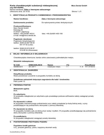 Karta charakterystyki substancji niebezpiecznej Merz Dental GmbH (wg 2001/58/WE) Nazwa handlowa: by z tworzywa sztucznego Utworzono dnia: 25.10.02 Strona 1 z 5 1. IDENTYFIKACJA PRODUKTU CHEMIEZNEGO I PRZEDSIEBIORSTWA Nazwa handlowa: Z by z tworzywa sztucznego Zastosowania produktu: Do wykonywania protez dentystycznych. Producent/Dostawca Merz Dental GmbH Eetzweg 20 D-24321 Lütjenburg telefon: +49 (0)4381-403-0 e-mail: [email protected] faks: +49 (0)4381-403-100 Pogotowie ratunkowe Pogotowie toksykologiczne telefon: 0048-42-657 99 00 631 47 52 (Lódz) telefon: 0048-22-619 08 97 619 66 54 (Warszawa) _________________________________________________________________________________________ 2. SKLAD / INFORMACJA O SKLADNIKACH Charakterystyka chemiczna: bardzo silnie usieciowany polimetakrylan metylu. Sk adniki niebezpieczne Nr CAS EINECS/ELINCS Nazwa [%] 000080-62-6 201-297-1 metakrylan metylu >1 Klasyfikacja F, Xi R11-37/38-43 _________________________________________________________________________________________ 3. IDENTIFIKACJA ZAGRO Klasyfikacja produktu Mo e powodowa uczulenie w przypadku kontaktu ze skór Dodatkowe wskazówki dotycz ce zagro enia dla ludzi i rodowiska Patrz punkt 12. _________________________________________________________________________________________ 4. PIERWSZA PONTOE Wskazówki ogólne Brak. Po wdychaniu W przypadku dolegliwo ci po wdychaniu py u powsta ego podczas szlifowania nale y zasi gn lekarza. Po styczno ci z okiem W przypadku mechanicznego podra nienia oczu nale y przep uka je du przed aj cym si podra nieniu skorzysta z pomocy lekarskiej. porady ilo ci wody, a przy Po styczno ci ze skór W przypadku kontaktu py u ze skór zmy wod i myd em. W przypadku przed skóry skorzysta z pomocy lekarskiej. aj cego si podra nienia Po prze kni ciu W przypadku dolegliwo ci zasi gn porady lekarskiej. ________________________________________________________________________________________ 5. POSTEPOWANIE PRZYPADKU POZARU Przydatne rodki ga nicze CO2, proszek ga niczy, piana, rozpylony strumie wody Kunststoffzähne_PO.doc Karta charakterystyki substancji niebezpiecznej Merz Dental GmbH (wg 2001/58/WE) Nazwa handlowa: by z tworzywa sztucznego Utworzono dnia: 25.10.02 Strona 2 z 5 5. POSTEPOWANIE PRZYPADKU POZARU (CI G DALSZY) rodki ga nicze nieprzydatne ze wzgl dów bezpiecze stwa Woda pe nym strumieniem Specjalne wyposa enie ochronne podczas zwalczania po aru Stosowa sprz t do ochrony dróg oddechowych (sprz t izoluj cy) z niezale nym dop ywem powietrza. Zak ada kompletn odzie ochronn . _________________________________________________________________________________________ 6. POSTEPOWANIE PRZYPADKU UWOLNIENIA rodki ostro no ci dostosowane do danej osoby Unika powstawania py u. W przypadku oddzia ywania py u stosowa ochron dróg oddechowych (mask przeciwpy ow FFP). Stosowa osobiste wyposa enie ochronne (kitel roboczy, okulary ochronne oraz r kawice ochronne). Metoda oczyszczania/ wch aniania Zbiera mechanicznie. Utylizowa zgodnie z przepisami. _________________________________________________________________________________________ 7. OBCHODZENIE SI Z SUBSTANCJ I MAGAZYNOWANIE Sposób obchodzenia si Wskazówki dla bezpiecznego u ytkowania W przypadku oddzia ywania py u stosowa ochron dróg oddechowych (mask przeciwpy ow FFP). Stosowa osobiste wyposa enie ochronne (kitel roboczy, okulary ochronne oraz r kawice ochronne). Wskazówki dla ochrony przeciwpo arowej i przeciwwybuchowej Specjalne rodki ostro no ci nie s wymagane. Sk adowanie Wymagania w stosunku do pomieszcze sk adowych i zbiorników Brak. _________________________________________________________________________________________ 8. KONTROLA NARA ENIA / RODKI OCHRONY OSOBISTEJ Sk adniki lub produkty rozk adu z kontrolowanymi warto ciami granicznymi zale nymi od miejsca pracy Nale y przestrzega obowi zuj cych w danym kraju warto ci granicznych dla py u, metakrylanu metylu, akrylanu metylu oraz nadtlenku dibenzoilu. Osobiste wyposa enie ochronne Ogólne rodki ochrony Nie wdycha py u. rodki higieny Zachowa zwyk e obowi zuj ce rodki higieny. Ochrona dróg oddechowych Ochrona dróg oddechowych w przypadku pylenia (maska przeciwpy owa (FFP) lub przez krótki okres czasu urz dzenie filtruj ce z filtrem cz stek P2). Ochrona dróg oddechowych kawice ochronne z tworzywa sztucznego, np. z PCV, nitrylu lub gumy.. Wskazówki ogólne Brak. Kunststoffzähne_PO.doc Karta charakterystyki substancji niebezpiecznej Merz Dental GmbH (wg 2001/58/WE) Nazwa handlowa: by z tworzywa sztucznego Utworzono dnia: 25.10.02 Strona 3 z 5 8. KONTROLA NARA ENIA / RODKI OCHRONY OSOBISTEJ (CI G DALSZY) Ochrona oczu Nie jest konieczna, zaleca si jednak stosowanie ochrony oczu w przypadku powstawania py u lub podczas obróbki mechanicznej. _________________________________________________________________________________________ 9. WLA CIWO CI FIZYKOCHEMICZNE Posta Forma: Kolor: Zapach: sta a ró ny w zale no ci od zabarwienia bezwonny Istotne dane dotycz ce bezpiecze stwa Zmiana stanu: Temperatura zmi kczania nieokre lona Punkt zap onu > 250°C (ASTM D 1929-68) Temperatura palenia si > 400°C (ASTM D 1929-68) ok. 1,19 g/cm3 w temp. 20°C sto Rozpuszczalno w woda Rozpuszczalno w (uj cie jako ciowe) nierozpuszczalny trudno rozpuszczalny w rozpuszczalnikach organicznych Inne informacje W przypadku pyl cych produktów organicznych nale y zawsze liczy si z mo liwo ci wybuchu py u. ________________________________________________________________________________________ 10. STABILNO I REAKTYWNO Rozk ad termiczny > 250 °C Reakcje niebezpieczne Nie s znane jakiekolwiek reakcje niebezpieczne. Niebezpieczne produkty rozk adu Podczas rozk adu termicznego powstaj palne opary, podra niaj ce oczy i drogi oddechowe, sk adaj ce si przewa nie z: metakrylanu metylu, akrylanu metylu. _________________________________________________________________________________________ 11. INFORMACJE TOKSYKOLOGICZNE Uczulanie Opisano reakcje alergiczne u ludzi. Powy sze dane odnosz